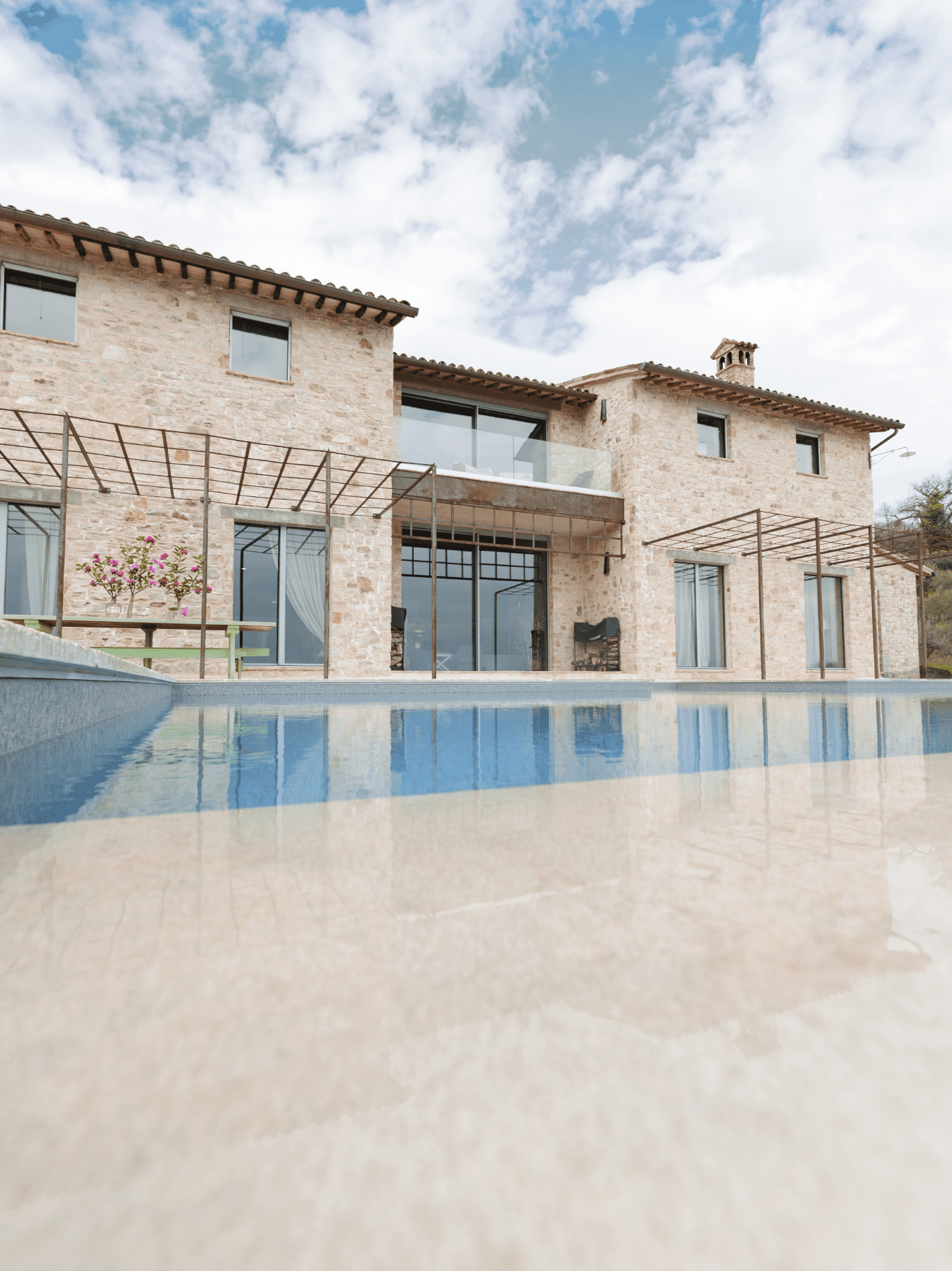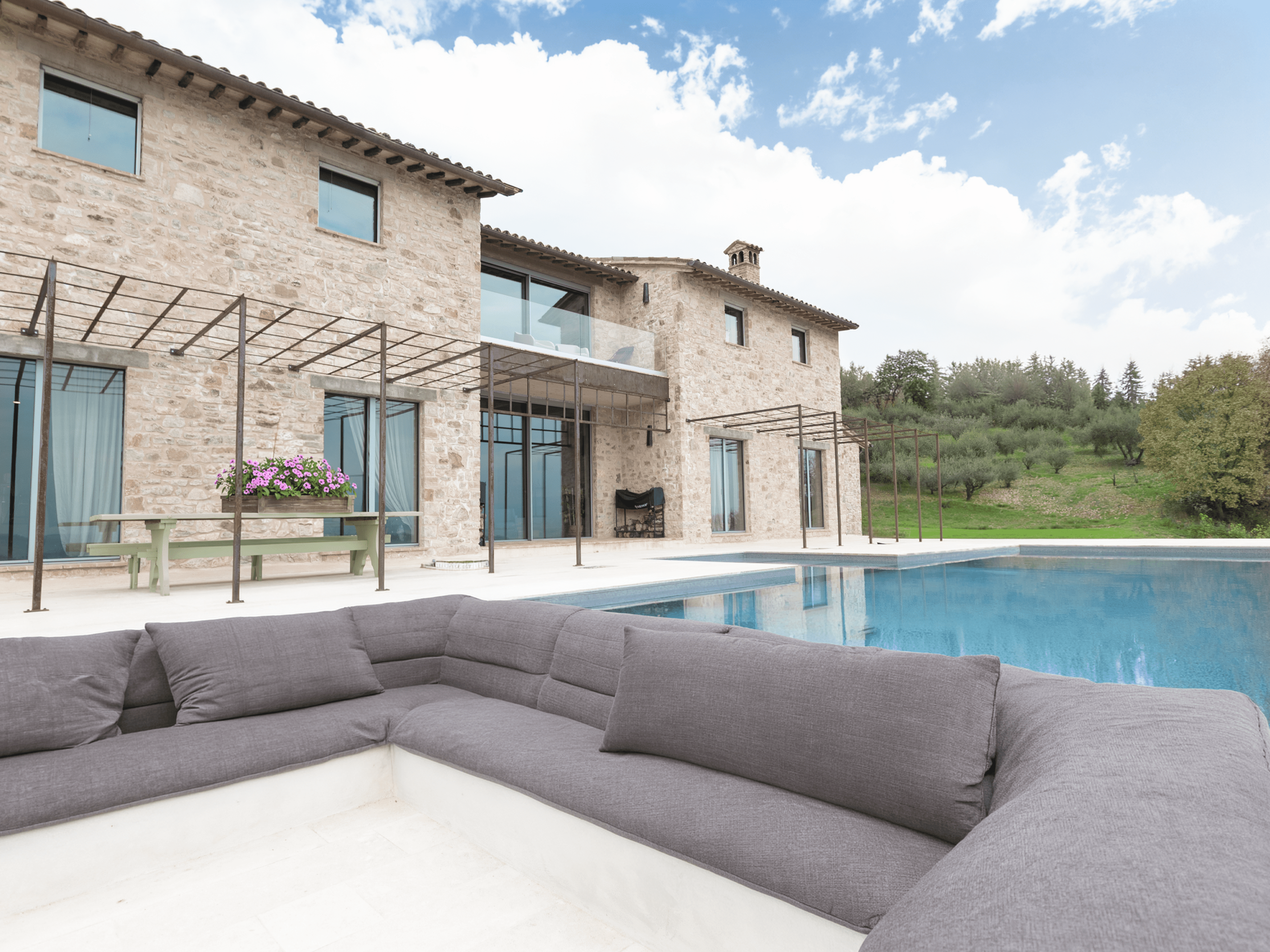The outdoor spaces of Casa Faggio Todi are nothing short of spectacular. The centerpiece is the infinity pool, where you can take a refreshing dip while gazing out over the vast countryside. The surrounding terraces provide ample space for lounging and al fresco dining, allowing you to savor the beauty of Umbria under the warm Italian sun.