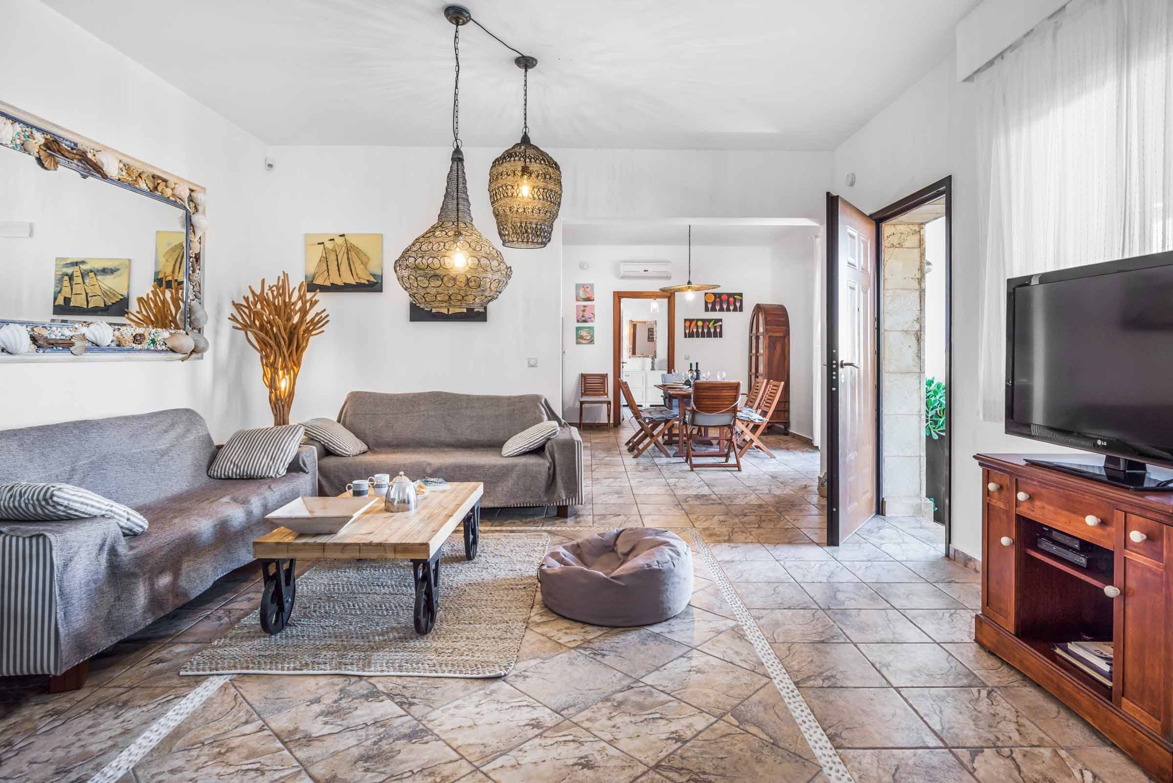 Step inside to find a beautifully designed interior that combines contemporary elegance with traditional Greek charm. The open-plan living area is flooded with natural light, creating a warm and inviting space for guests to relax. The modern kitchen is fully equipped with high-end appliances, perfect for preparing a delicious meal to enjoy with loved ones. With three spacious bedrooms, including a ground-floor en-suite bedroom ideal for guests with reduced mobility, this apartment comfortably accommodates up to six guests.