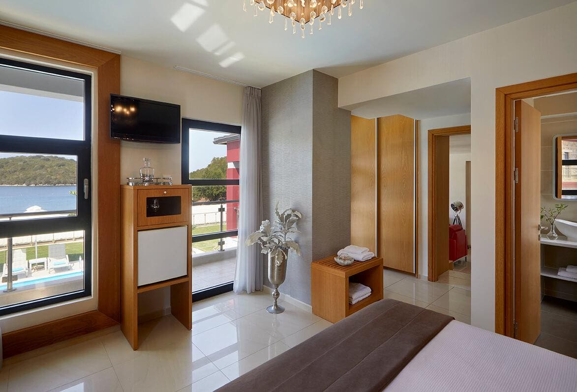 The interior of this luxury apartment rental in Kavos is a testament to refined elegance. Each of the four bedrooms is a private sanctuary, complete with en-suite bathrooms and air conditioning, ensuring a restful night’s sleep. The open-concept living area, furnished with contemporary décor, exudes sophistication and invites relaxation. A fully-equipped kitchen, perfect for preparing meals or enjoying the included breakfast and lunch, adds to the convenience. The living space extends seamlessly to a private balcony, offering panoramic views of the shimmering Ionian Sea.