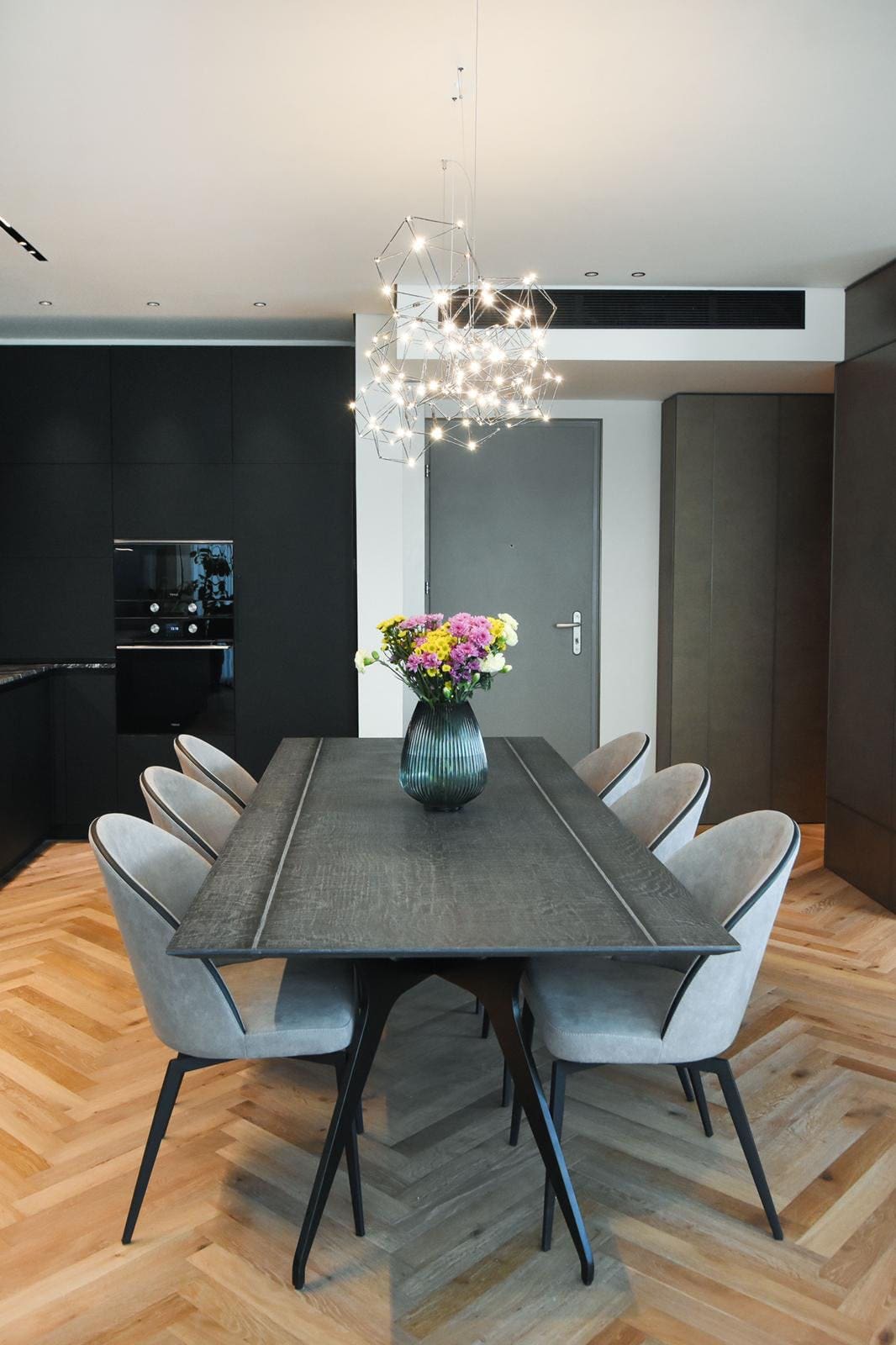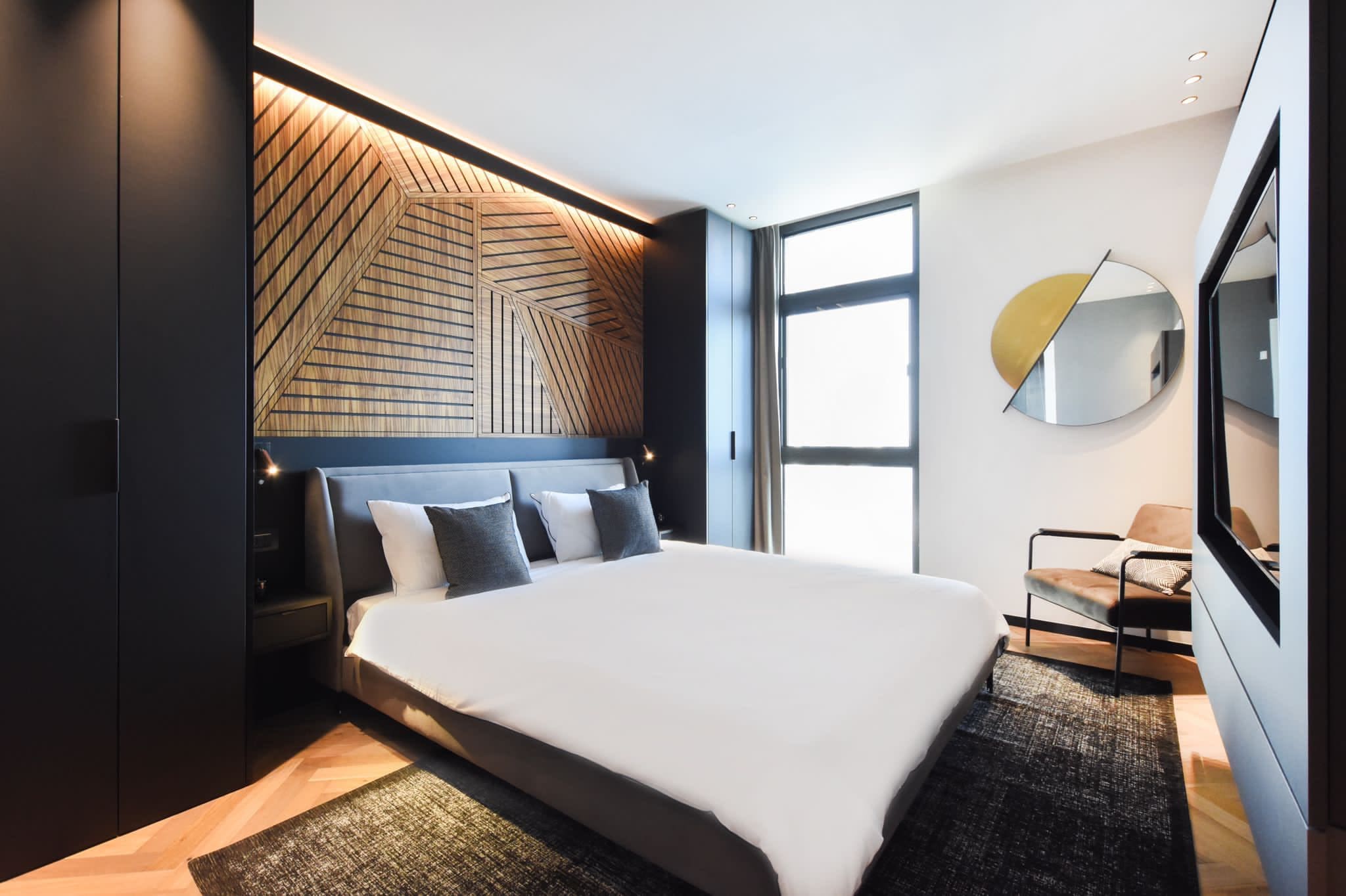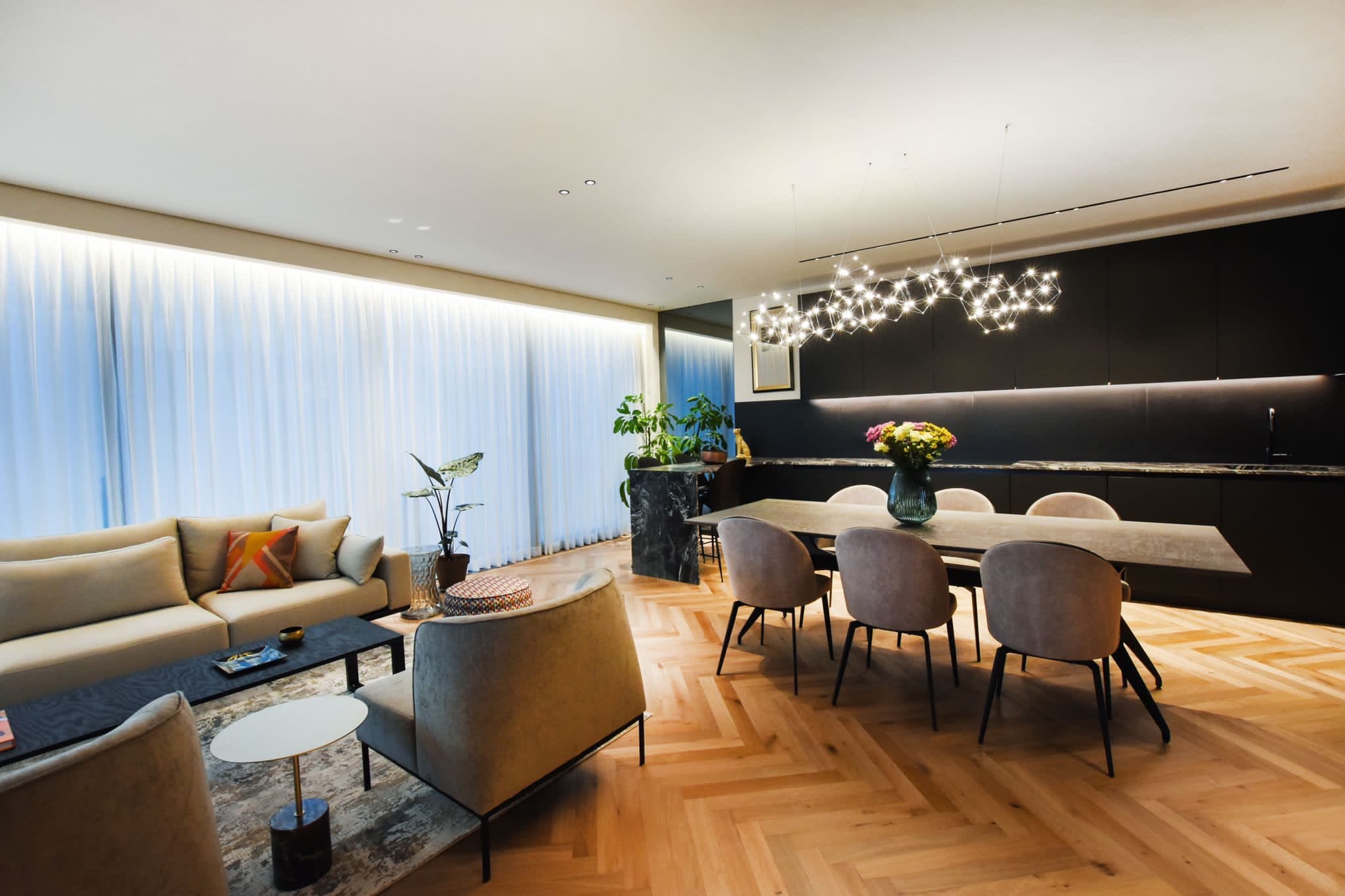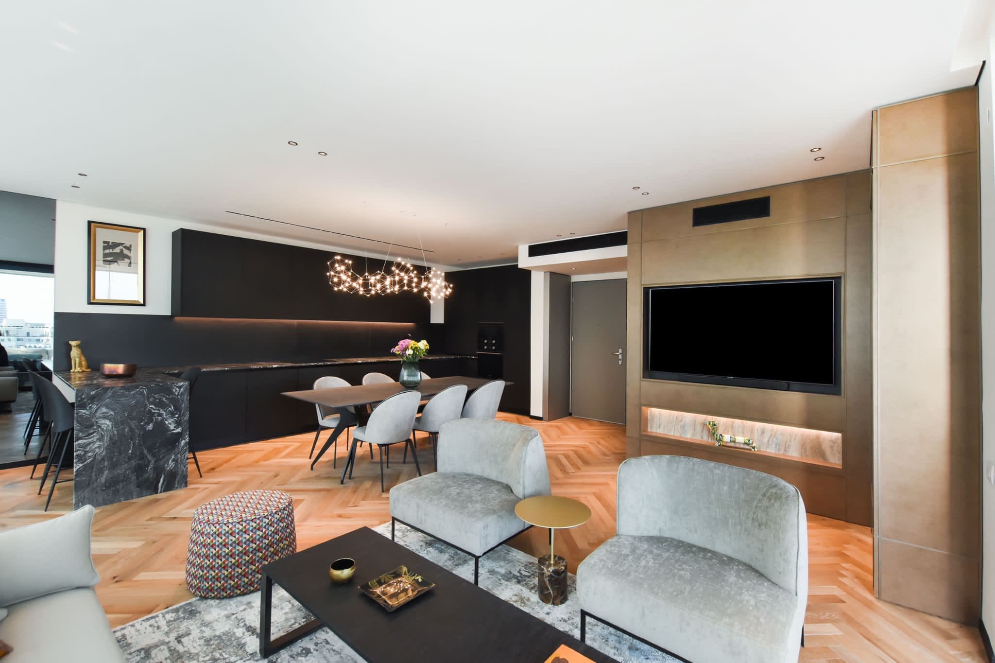 Step into a sleek and modern interior featuring an open-plan living area that seamlessly connects to a stylish dining space. The fully equipped kitchen is perfect for preparing meals with ease, complemented by a chic dining area that seats six comfortably. The three bedrooms offer plush bedding and ample storage, while the two contemporary bathrooms ensure convenience for all guests. The apartment’s design emphasizes comfort and style, creating a welcoming atmosphere for relaxation.