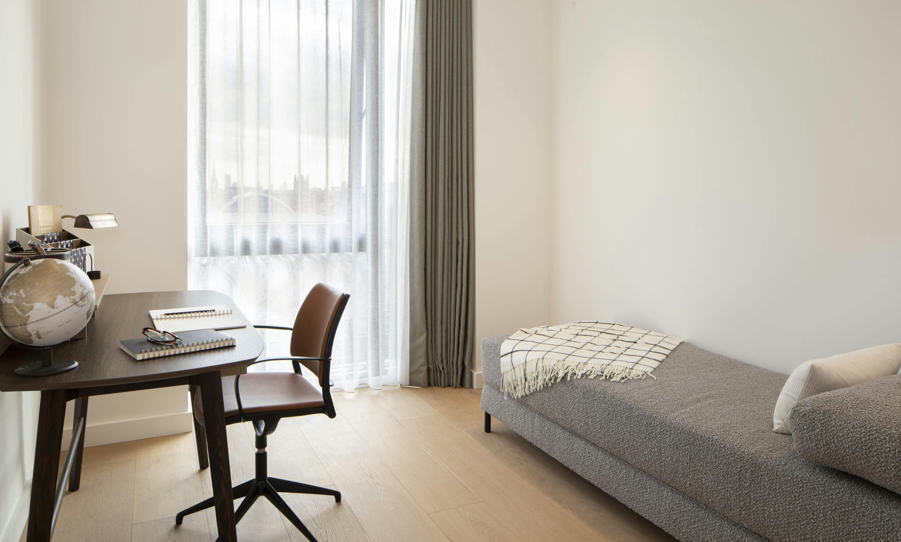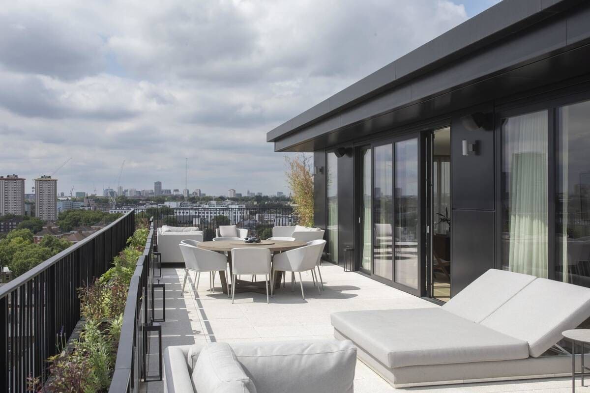 Though located in the heart of the bustling city, the apartment offers moments of tranquility. A small private balcony provides a personal retreat, while a shared rooftop terrace offers sweeping views of London’s skyline, perfect for morning coffee or evening relaxation. The building’s shared gym is ideal for maintaining your fitness routine during your stay.