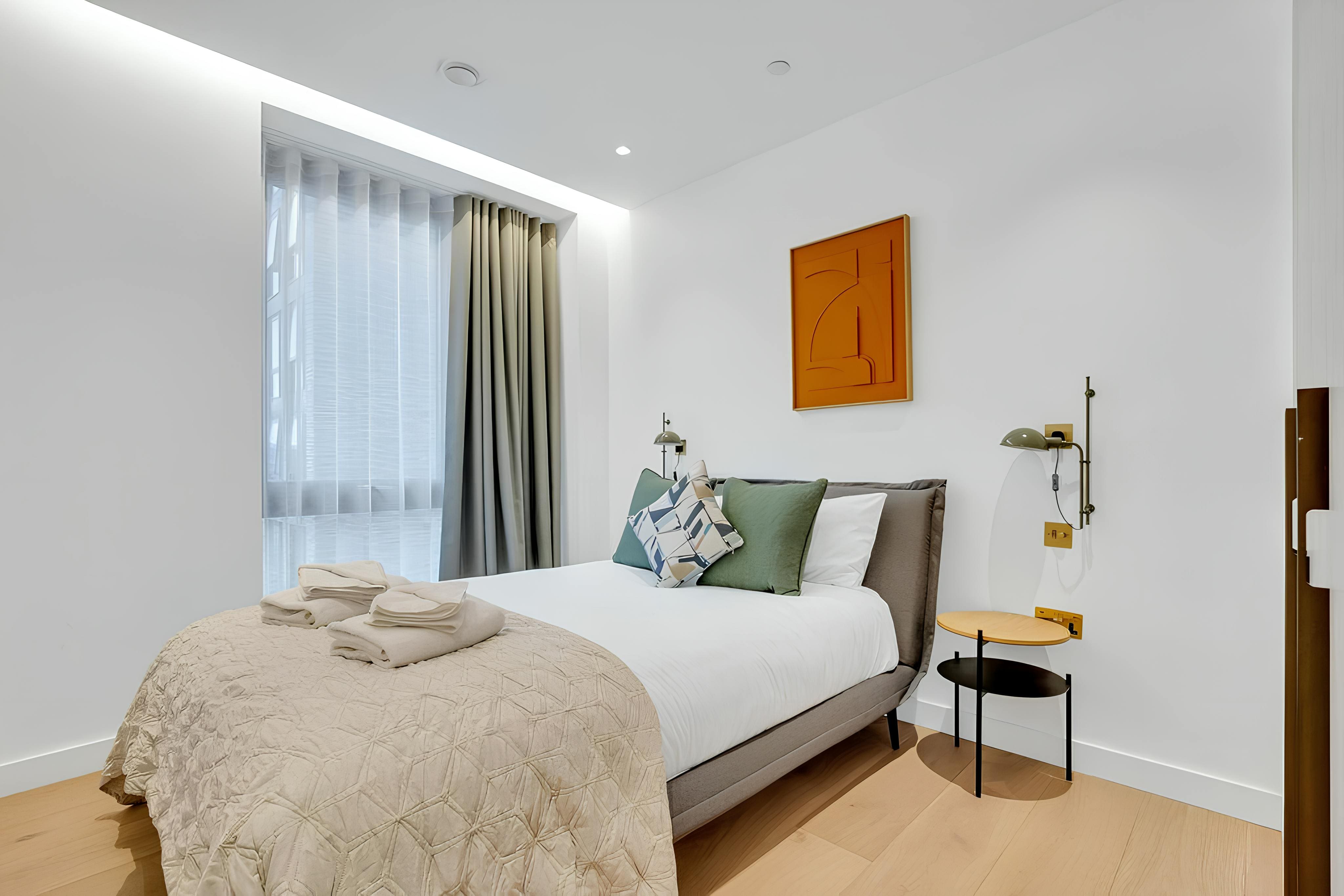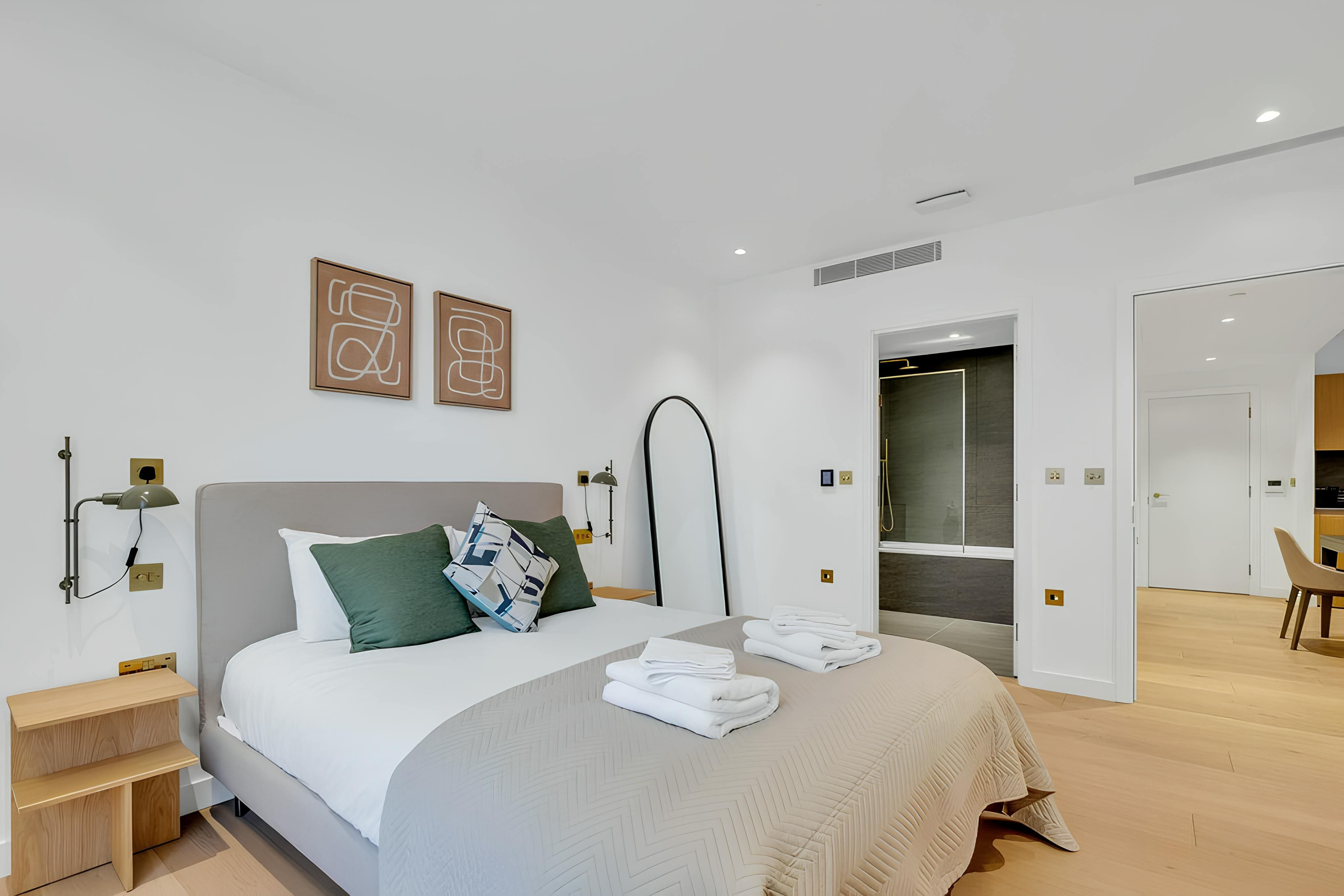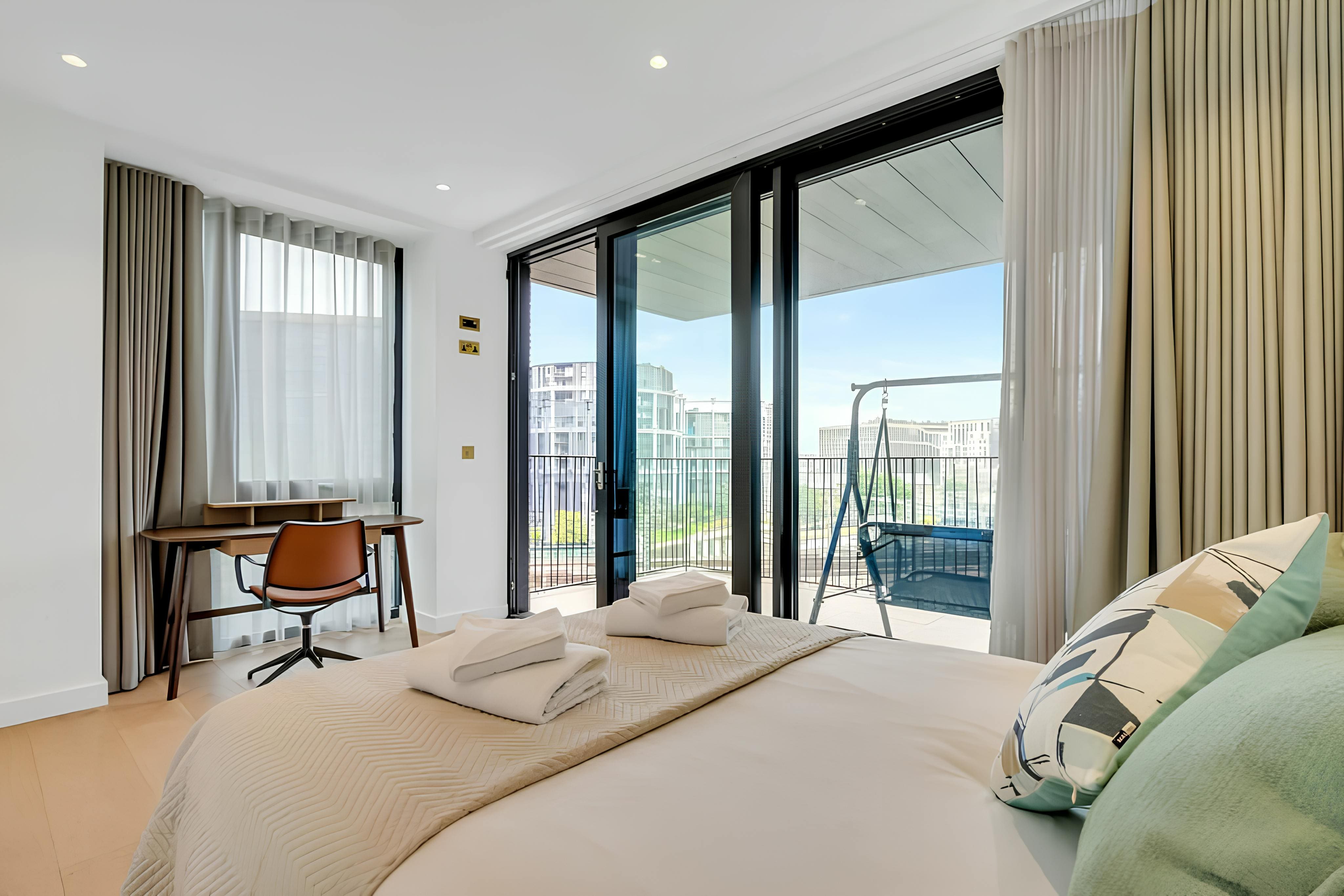 While the apartment itself is a masterpiece of modern design, the shared rooftop terrace is where you’ll want to linger. With panoramic views of the London skyline, it’s the perfect spot for morning coffee or evening cocktails. The on-site gym and communal lounges further enhance the urban living experience, offering spaces to unwind and connect.
