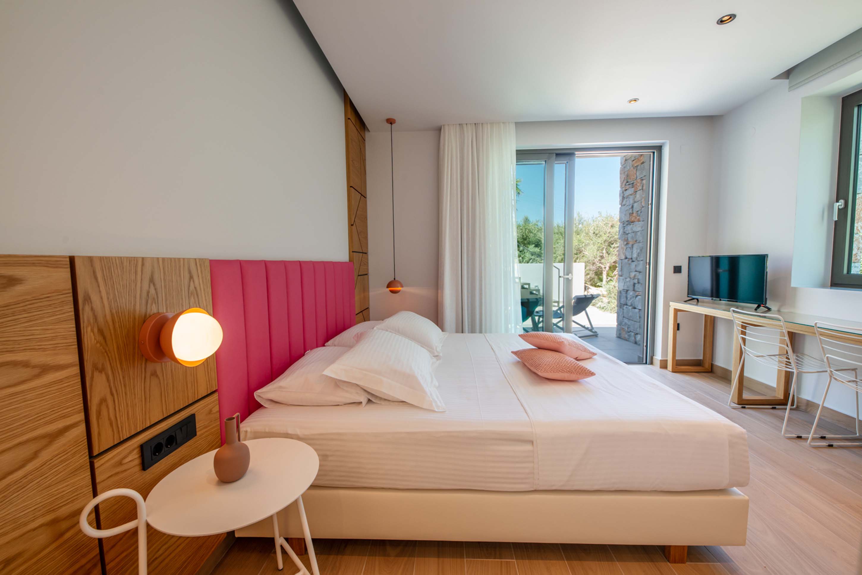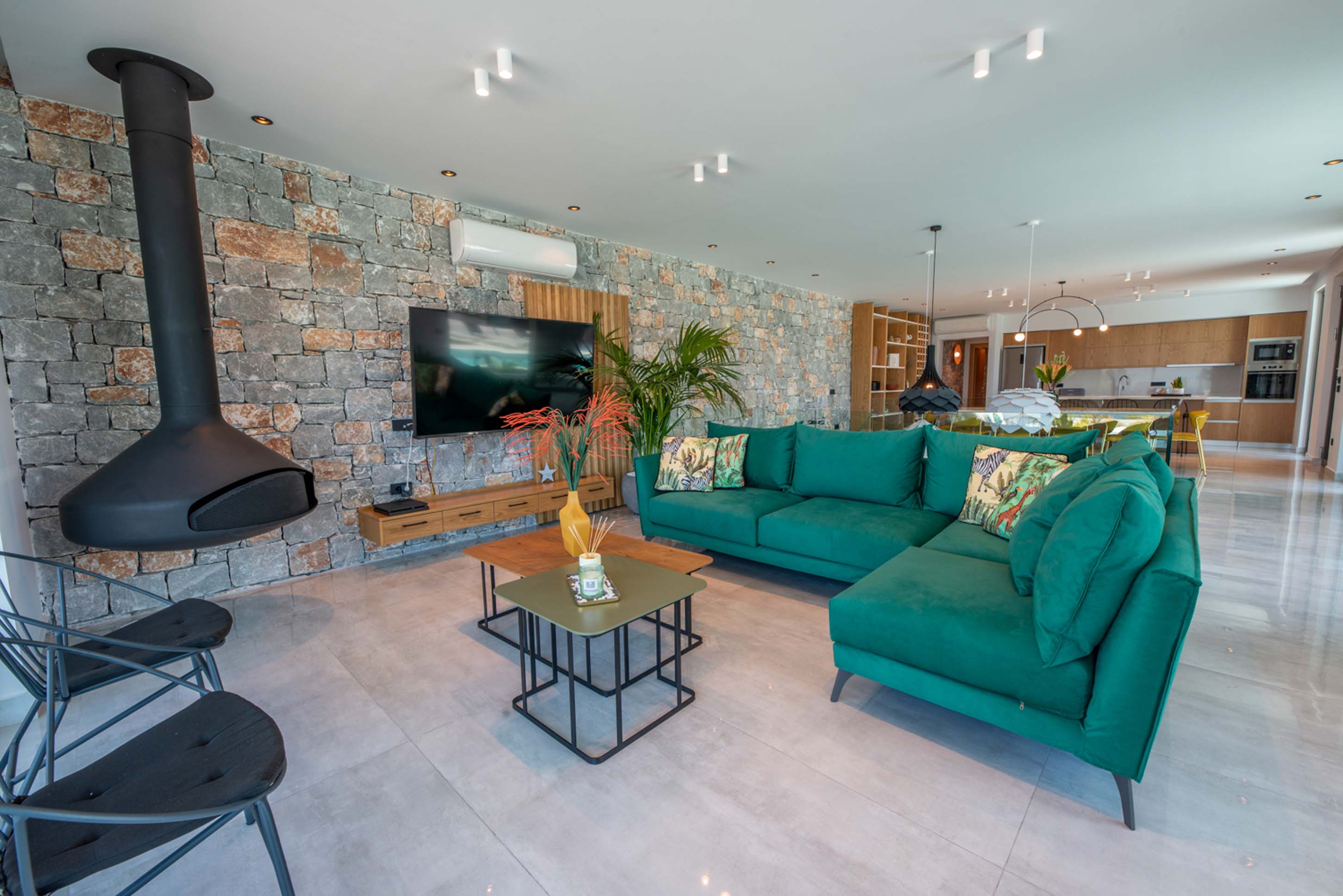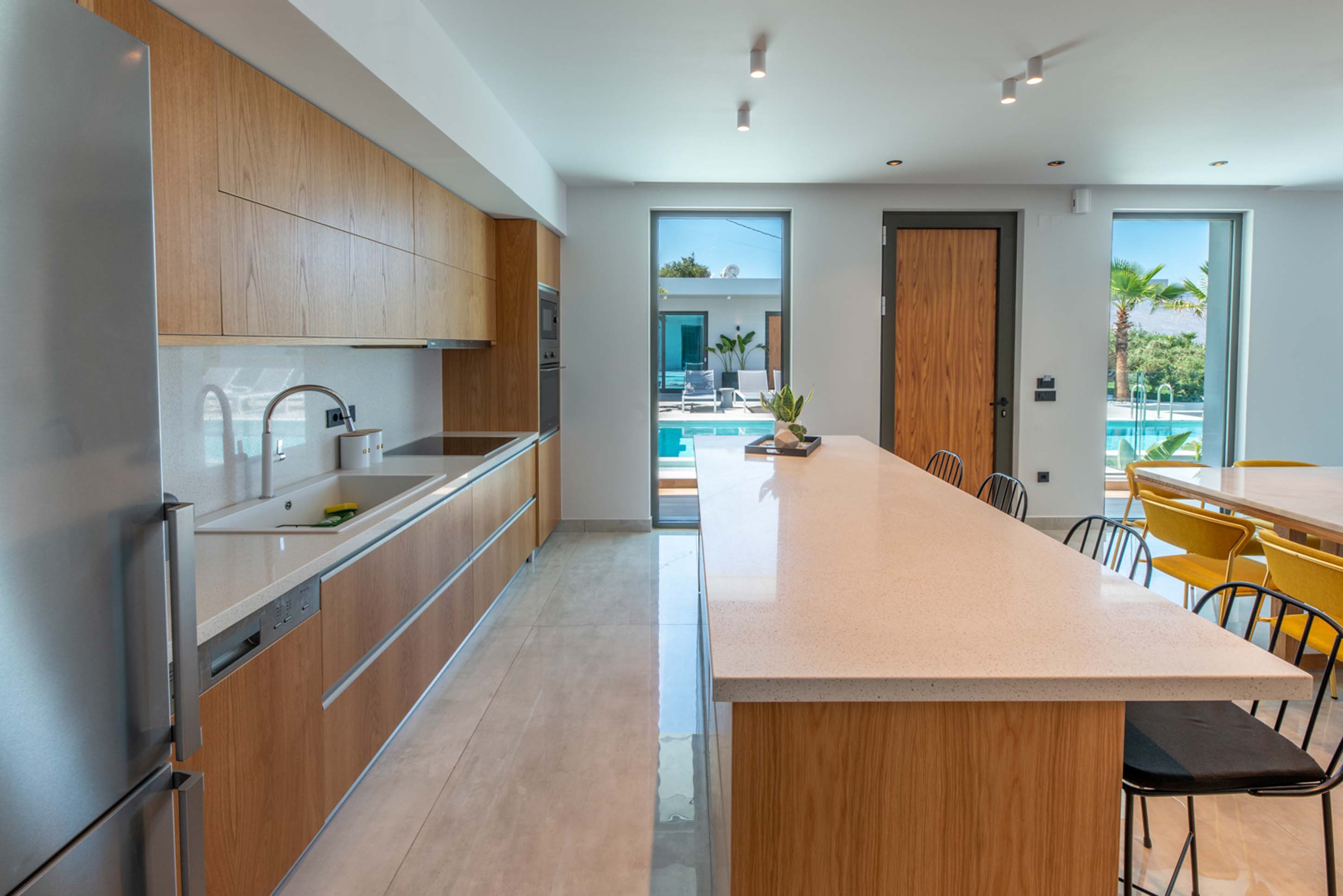 Spread across two buildings and three floors, the apartment features six plush bedrooms, each with its own en-suite bathroom, ensuring privacy and comfort for all guests. The interiors are designed with a contemporary style, accented by local Cretan elements that bring warmth and character. The open-plan living area is perfect for socializing, while the fully equipped kitchen offers everything needed for culinary adventures. Although the dining table doesn’t seat all 14 guests at once, the kitchen counter provides additional seating with stylish barstools.
