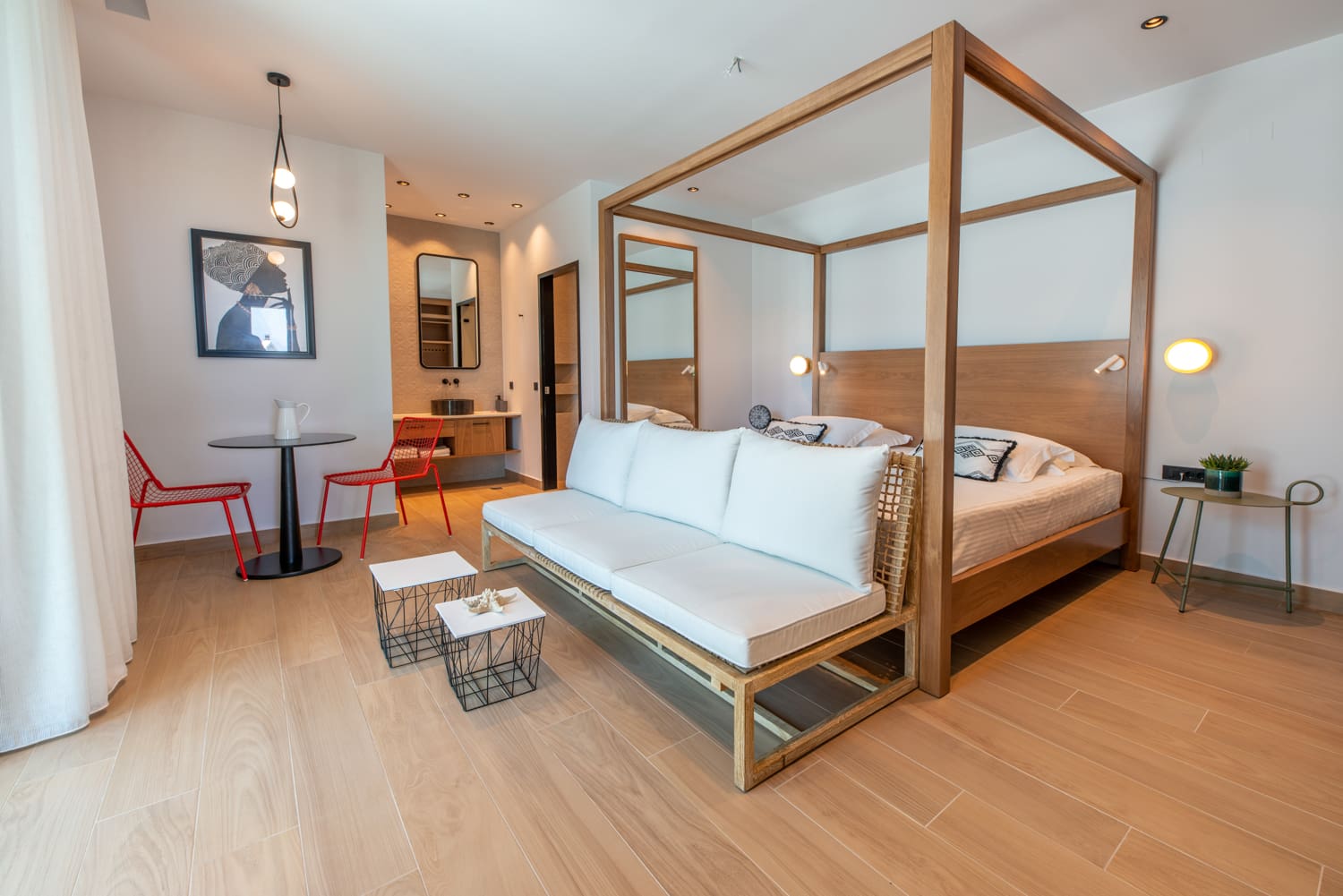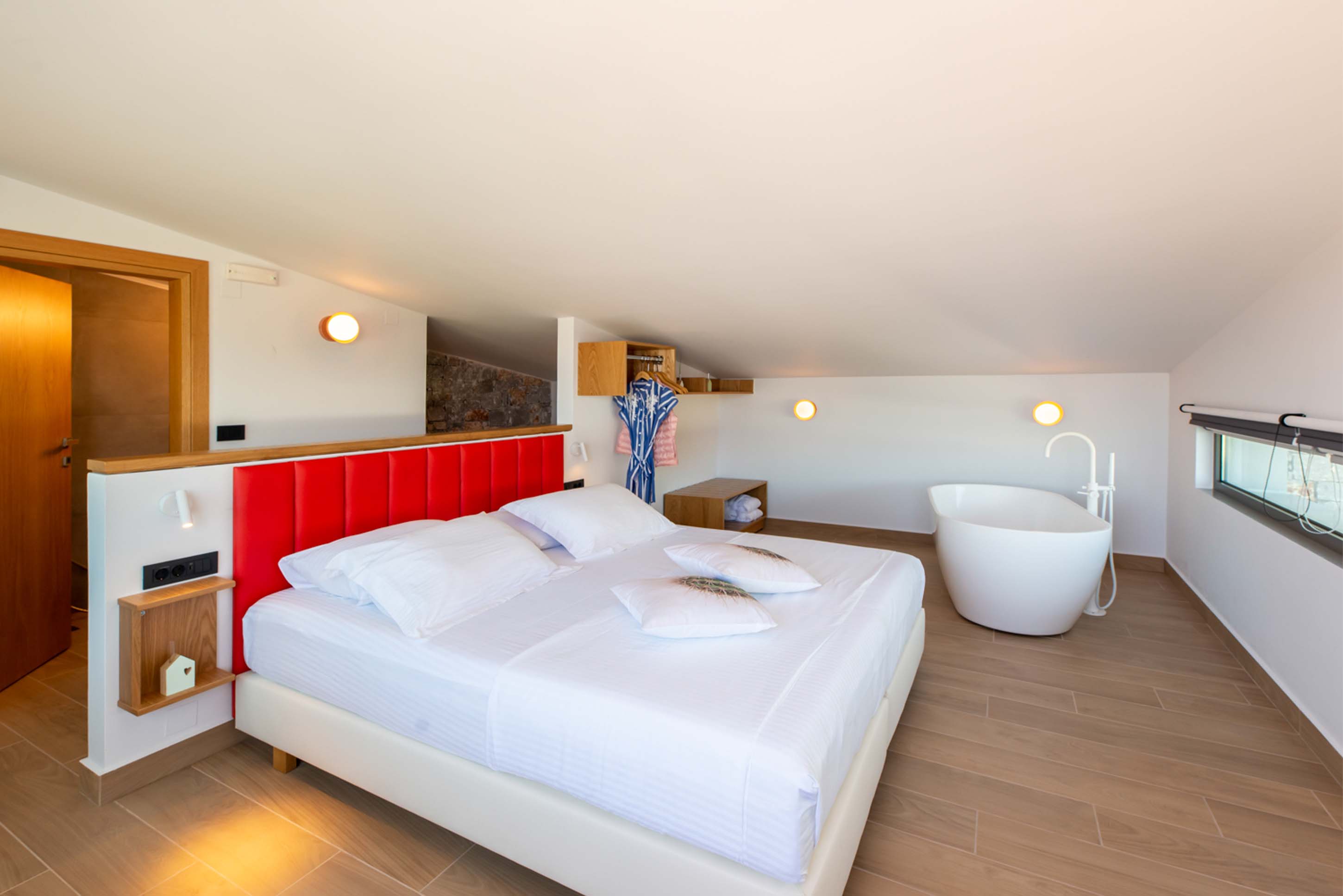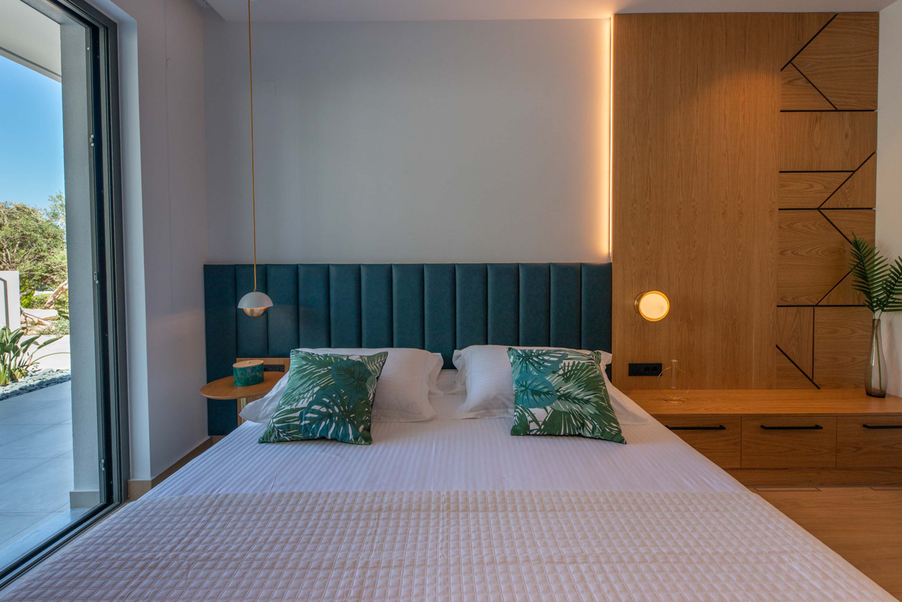 Spread across two buildings and three floors, the apartment features six plush bedrooms, each with its own en-suite bathroom, ensuring privacy and comfort for all guests. The interiors are designed with a contemporary style, accented by local Cretan elements that bring warmth and character. The open-plan living area is perfect for socializing, while the fully equipped kitchen offers everything needed for culinary adventures. Although the dining table doesn’t seat all 14 guests at once, the kitchen counter provides additional seating with stylish barstools.