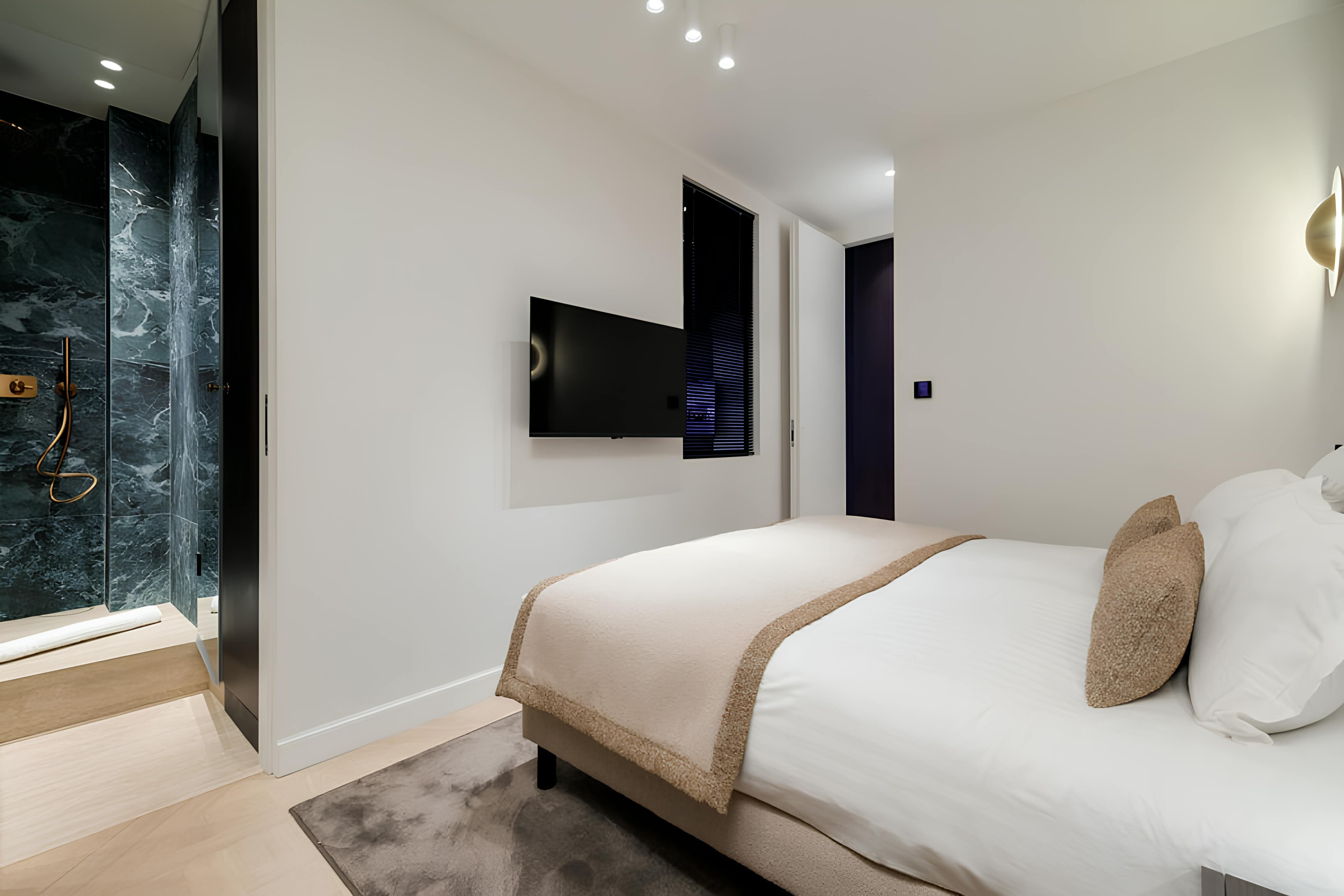 Step into a world of sophistication and style as you enter this stunning 2-bedroom apartment. Thoughtfully designed by a renowned architect, the open-plan living area provides a spacious setting for relaxation and entertainment. The apartment features two beautiful bedrooms, each with its own marble en-suite bathroom, ensuring privacy and luxury for all guests. The living area also includes a comfortable sofa bed, accommodating up to six guests in total.