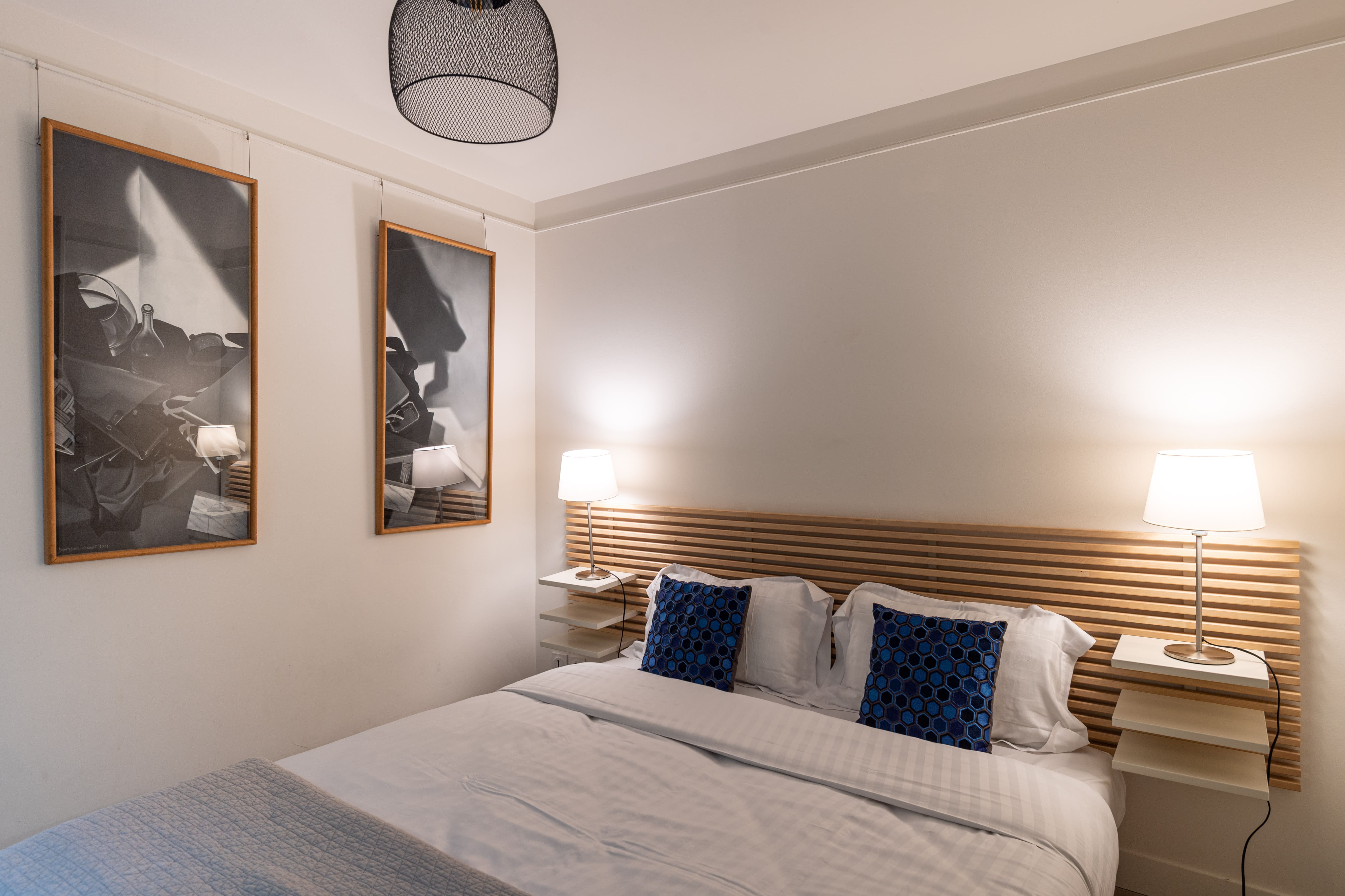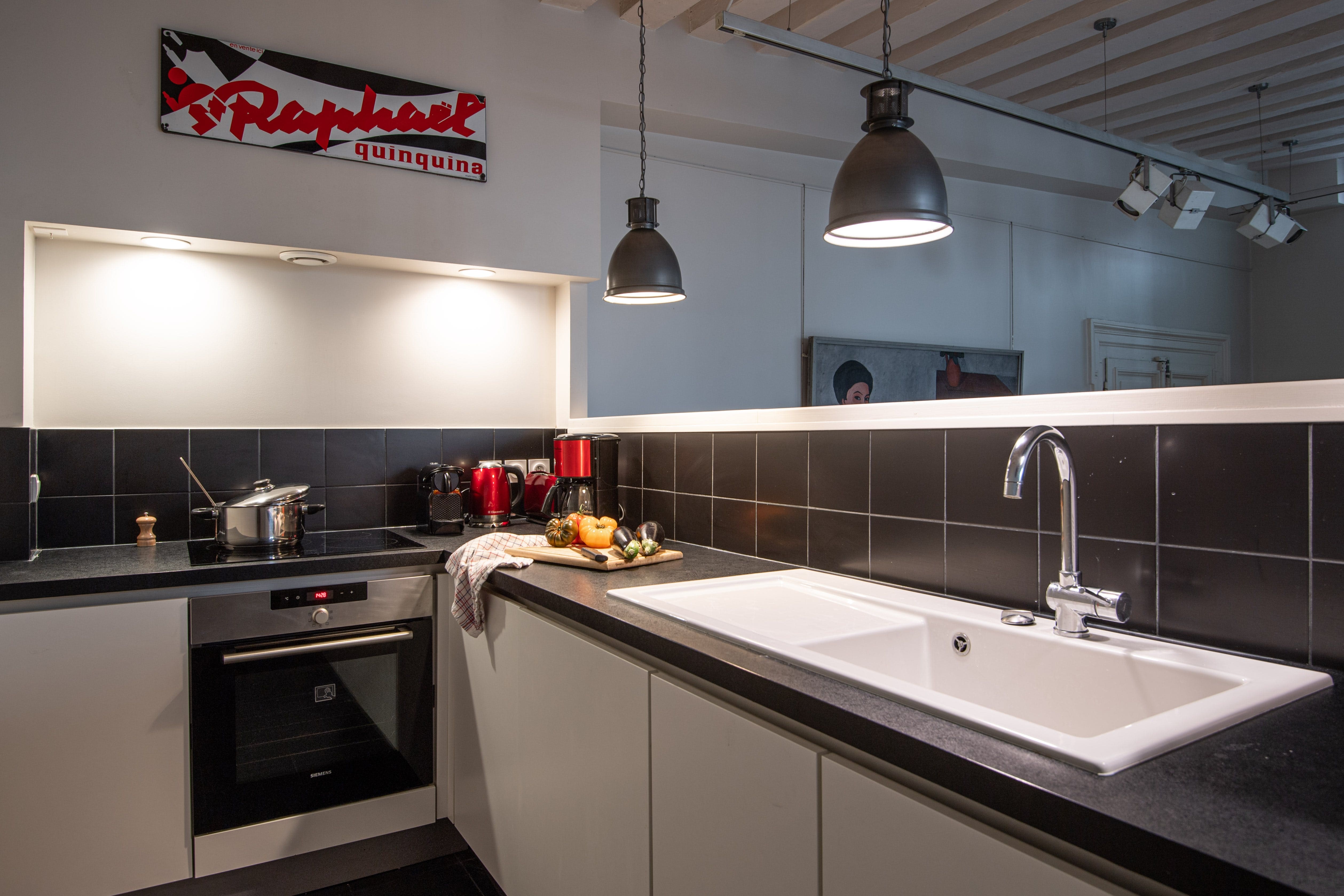 Step inside this duplex apartment and discover a harmonious blend of contemporary design and classic Parisian features. The living space is adorned with old wood beams and chandeliers, creating an inviting atmosphere. The monochrome kitchen is fully equipped, perfect for preparing a French feast. The library offers a quiet retreat, while the cozy sofa invites relaxation. Accommodating up to six guests, the apartment includes two bedrooms and a comfortable sofa bed for guests five and six.
