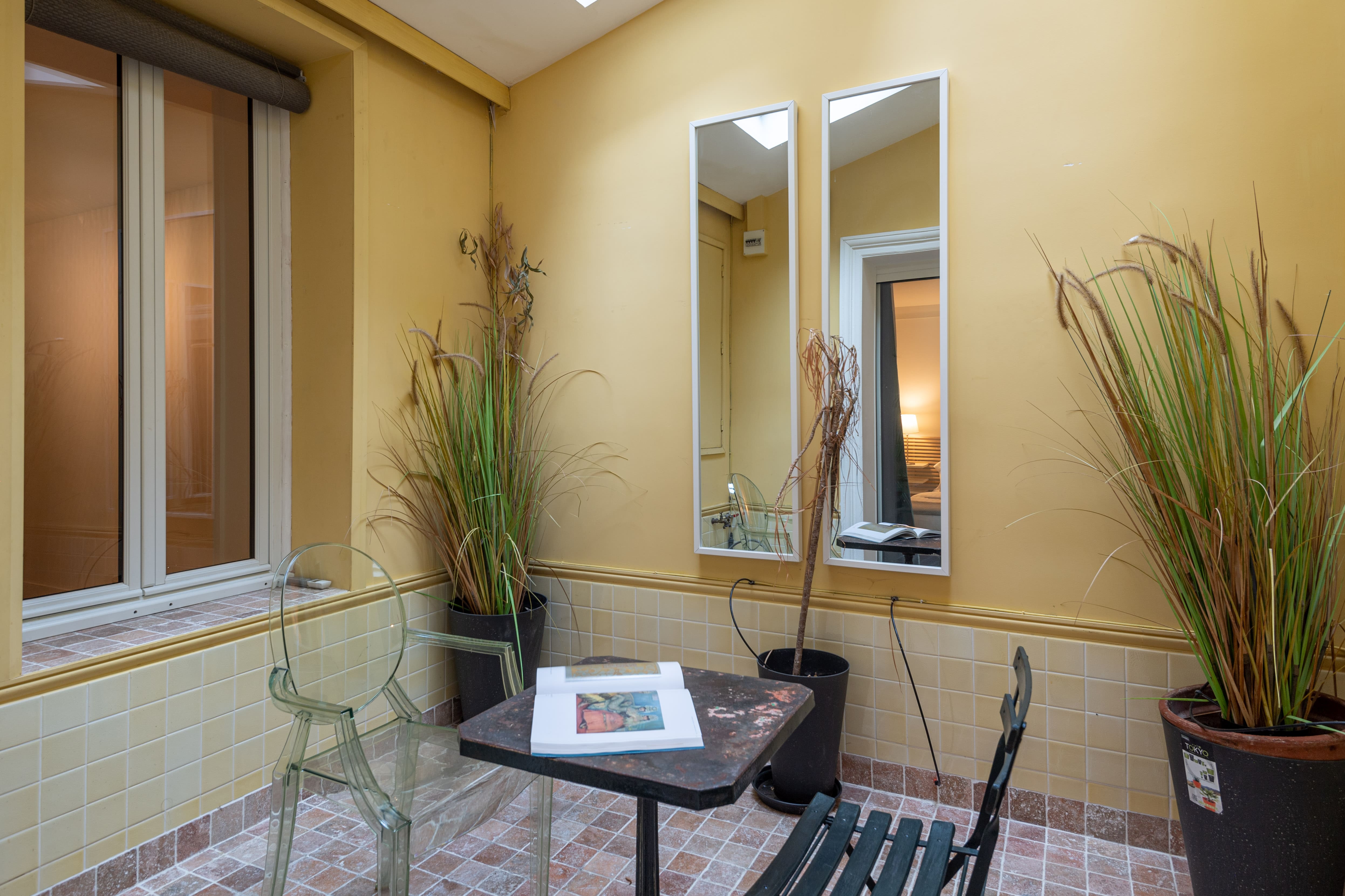 Although this apartment is nestled in the bustling district of Le Marais, it offers a tranquil escape with its enclosed patio. Enjoy outdoor dining or a leisurely evening with a glass of French rosé, surrounded by the quaint charm of Parisian architecture. The lack of dedicated parking is hardly noticeable, as the city’s attractions are just a stroll away.