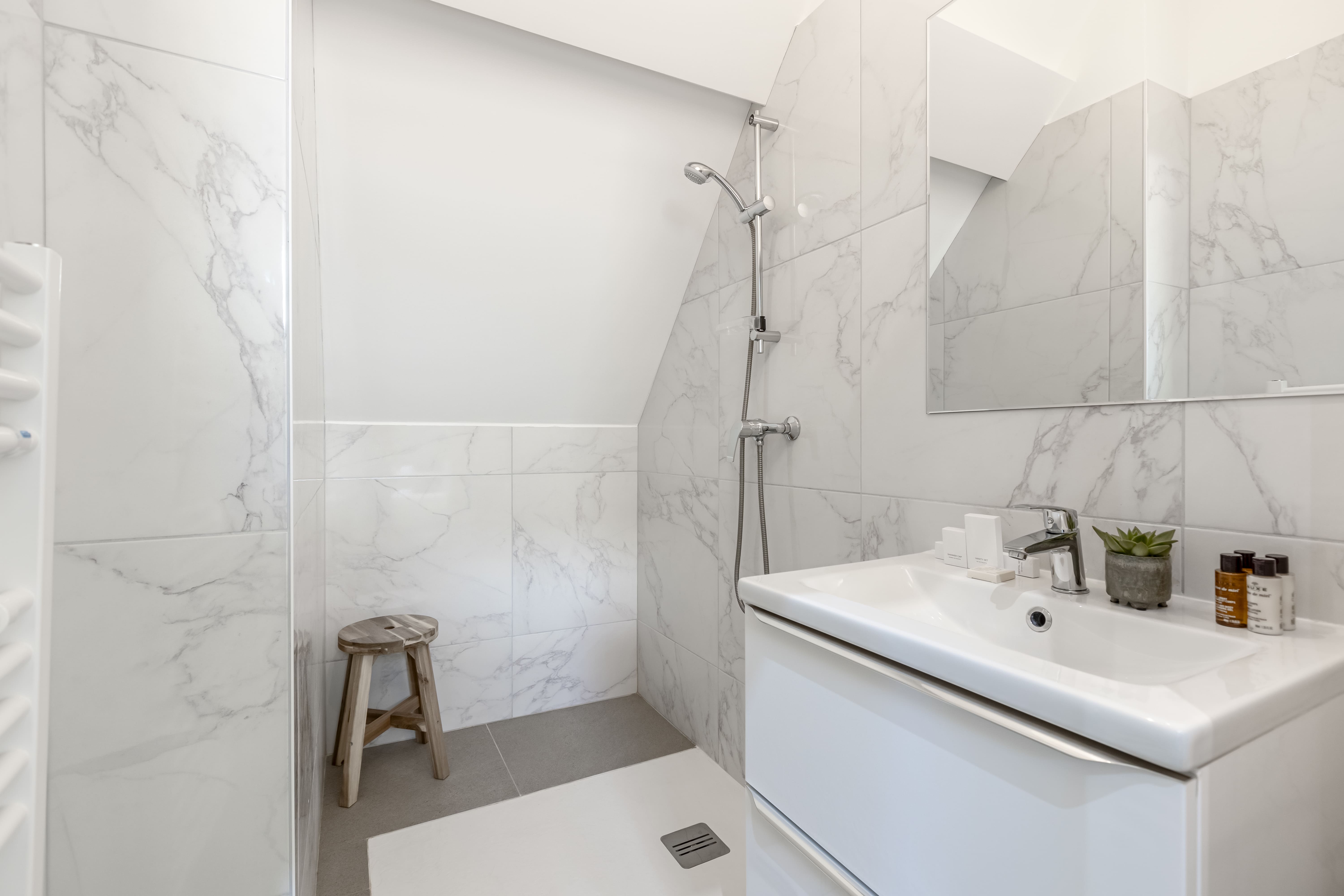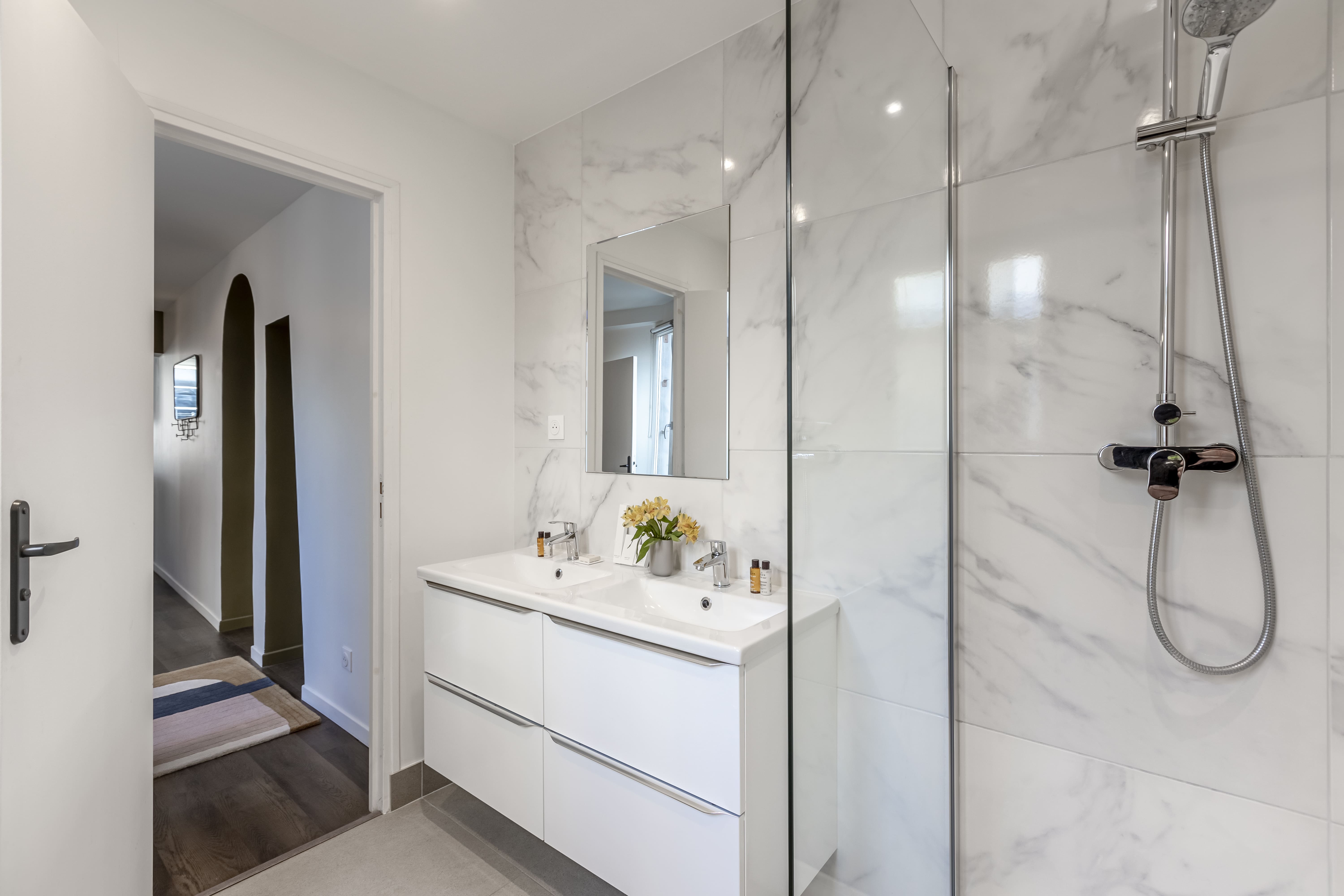 Upon entering, you’ll find a beautifully designed interior that perfectly marries modern elegance with classic Parisian architecture. The apartment boasts three spacious bedrooms, each with its own en-suite bathroom, ensuring ample privacy and comfort for up to six guests. The living area is a haven of relaxation, featuring plush seating and sophisticated decor. The fully-equipped kitchen is ideal for culinary enthusiasts, while the dining space invites you to savor delicious meals with loved ones. Note that the apartment is located on the fourth floor, accessible only by stairs, adding a touch of authenticity to your Parisian experience.