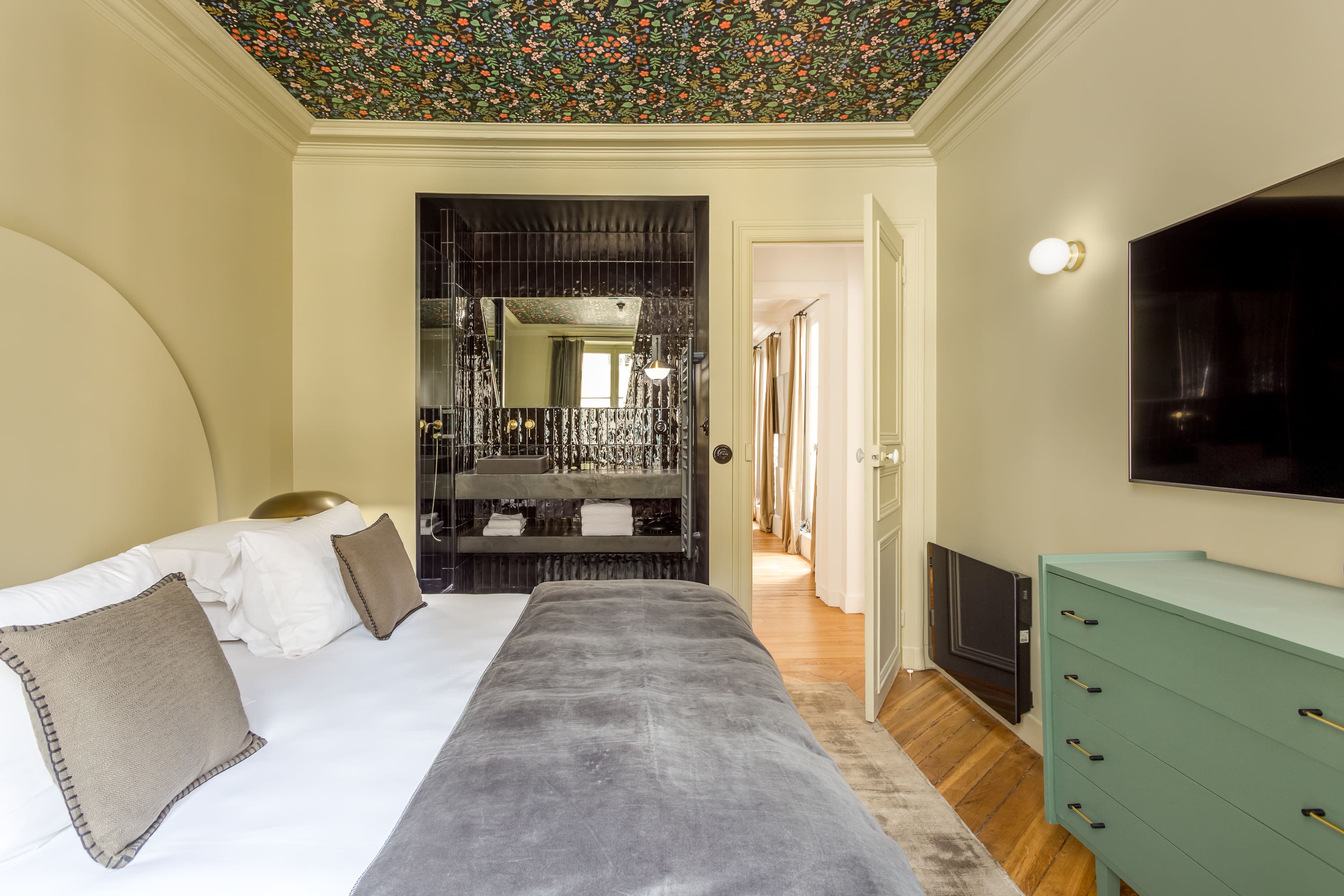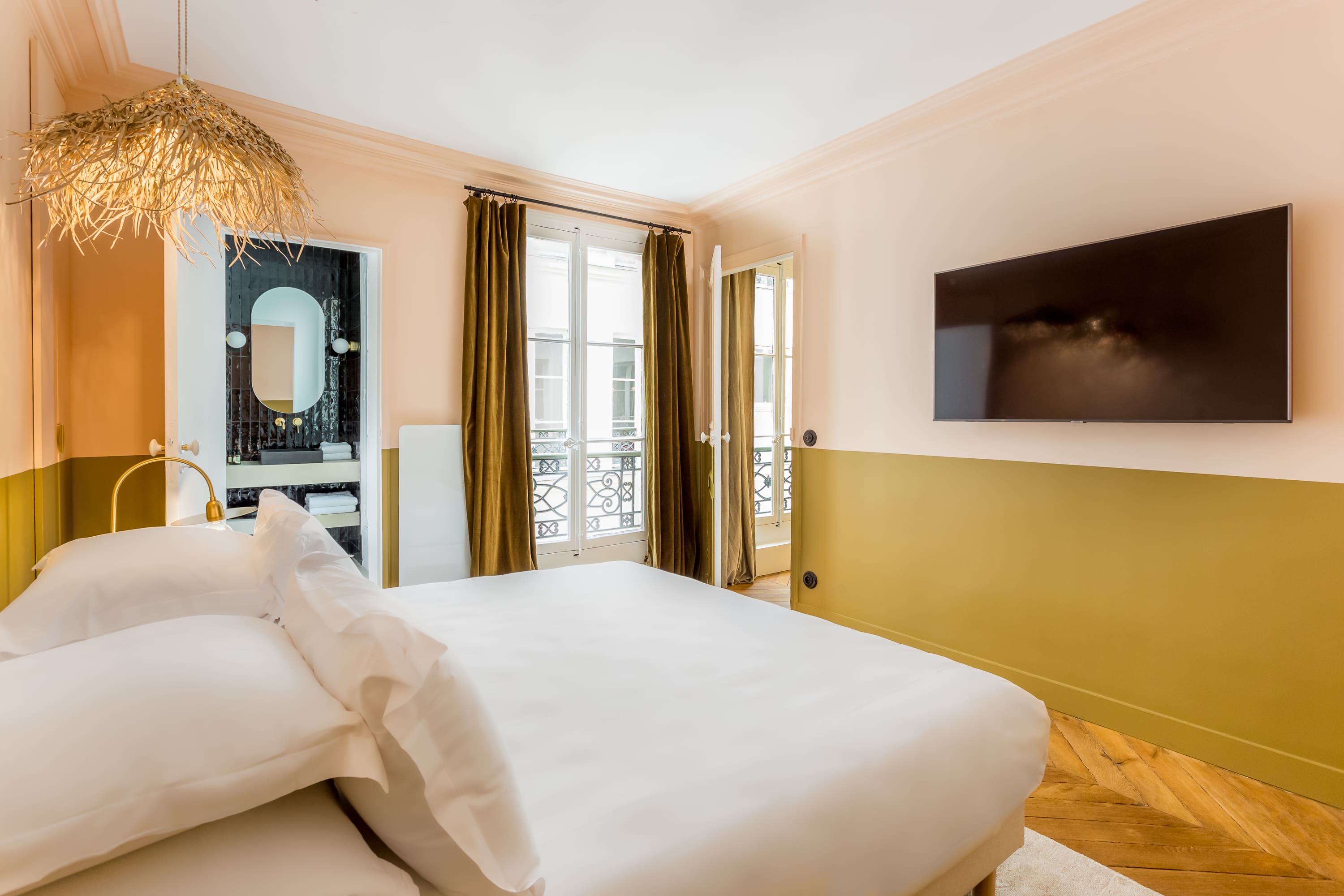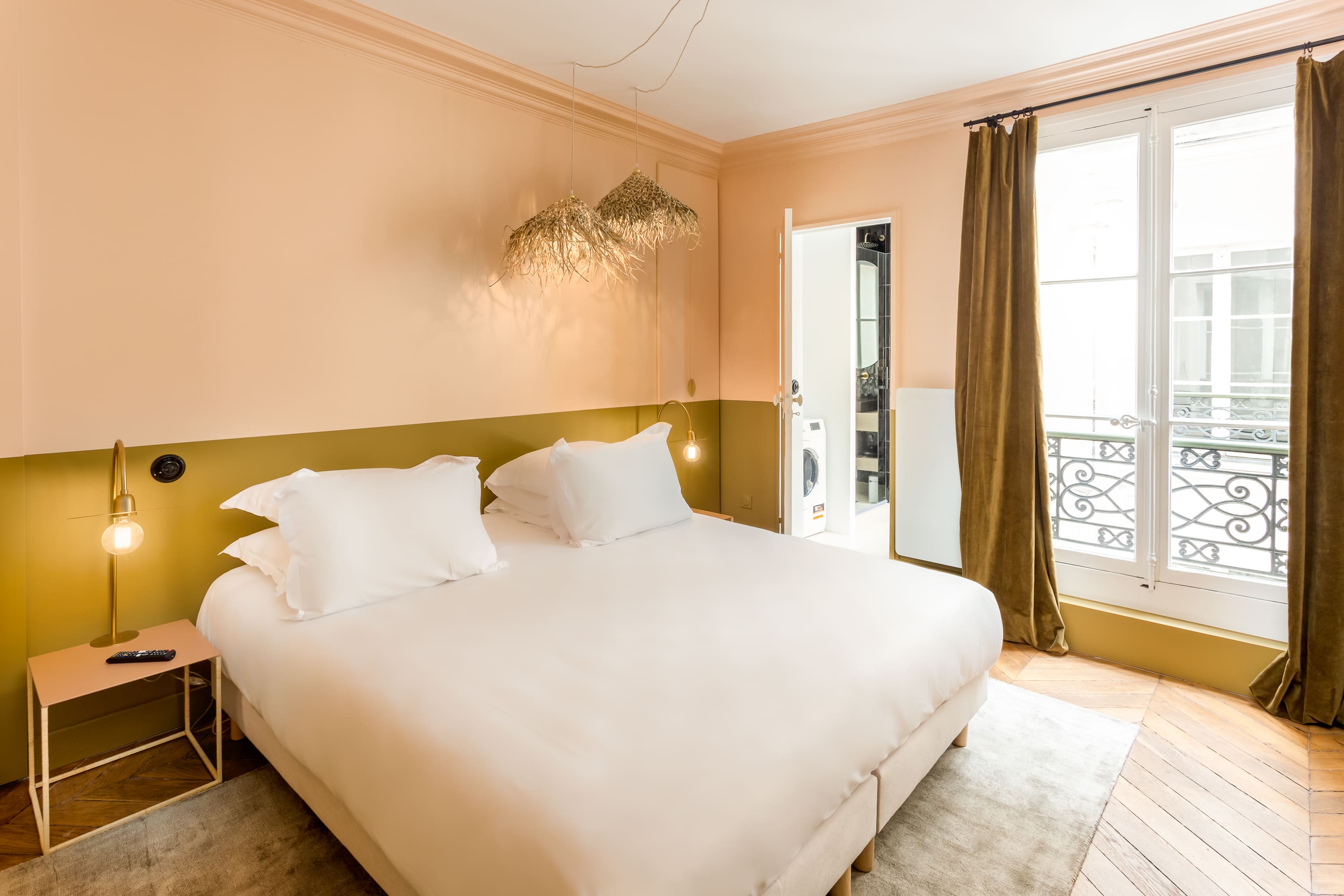 Step inside this beautifully designed apartment, where contemporary elegance meets classic Parisian style. The spacious living room, adorned with tasteful furnishings and art, provides a warm setting for relaxation or remote working. The open-plan kitchen is fully equipped, catering to culinary enthusiasts eager to craft gourmet meals. Each of the two bedrooms boasts its own en-suite bathroom, ensuring privacy and comfort. At full occupancy, two additional guests can be accommodated on the sofa bed in the living room, making it a versatile space for social gatherings or intimate evenings.