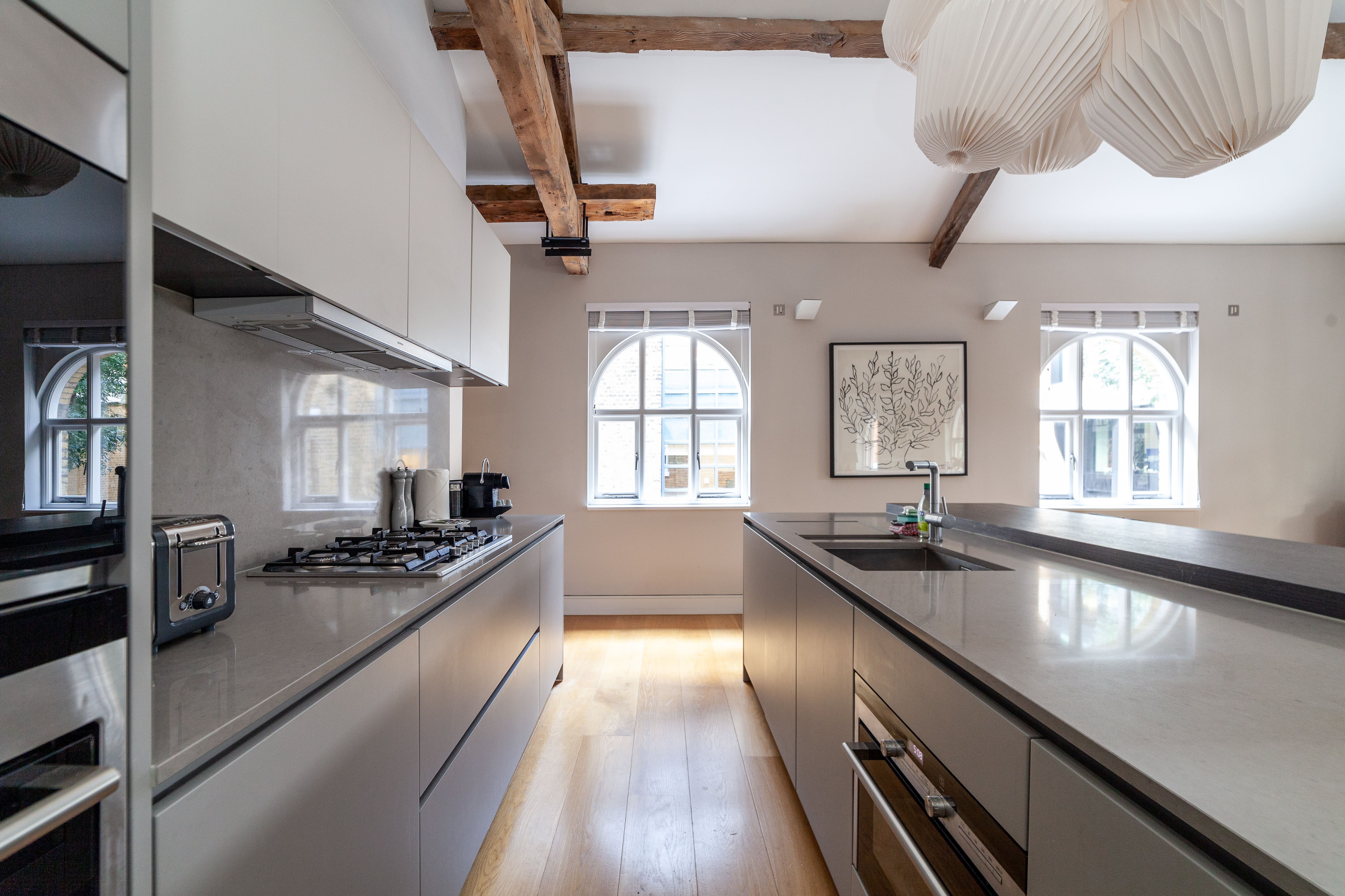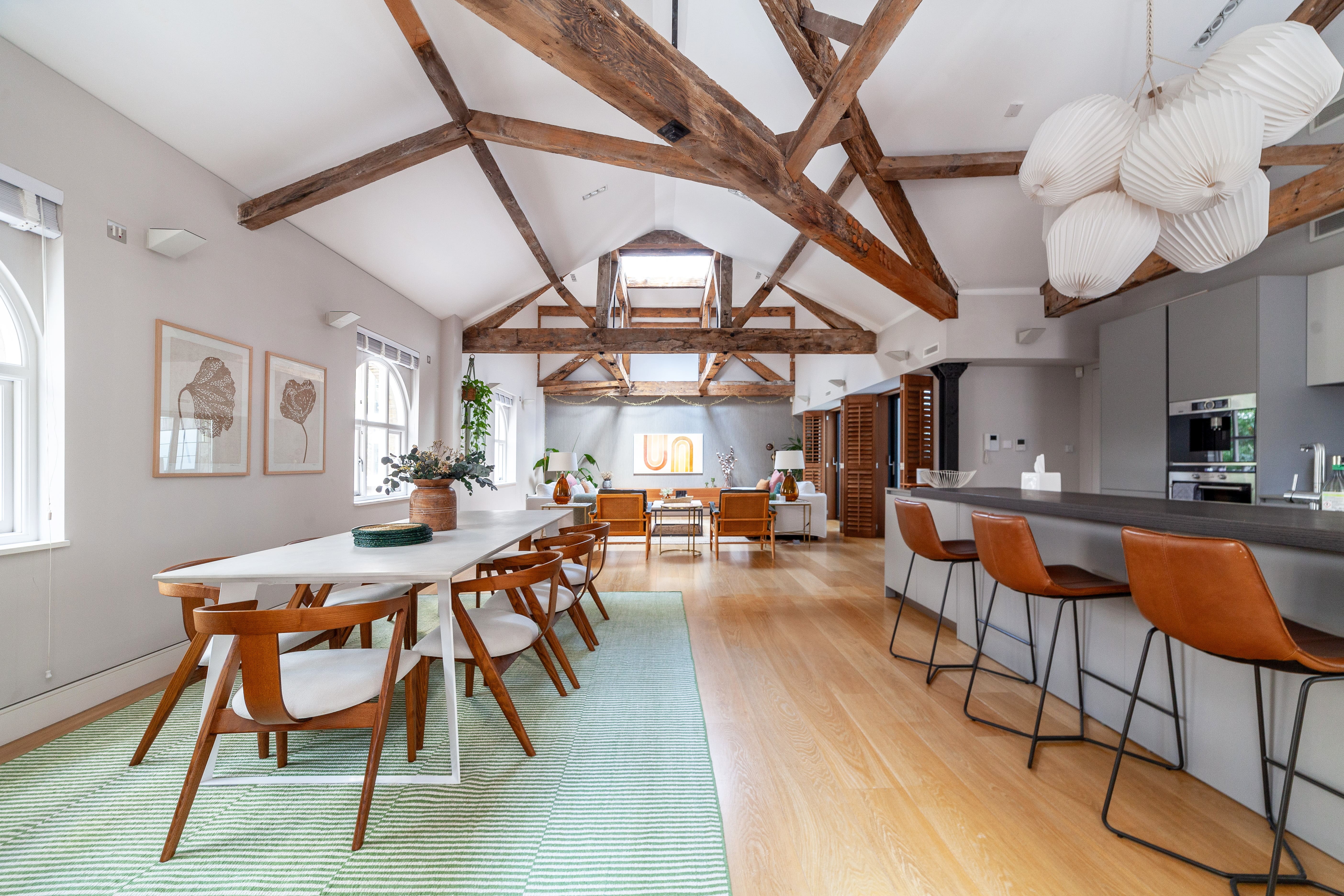 The interior of this stunning apartment is designed to impress, with a vaulted living and dining area forming the heart of the home. Modern amenities complement the historic architecture, providing a seamless blend of old and new. The apartment features four spacious bedrooms located on the ground floor, perfect for restful nights. With a cinema room and a dedicated workspace, it caters to both relaxation and remote working needs.