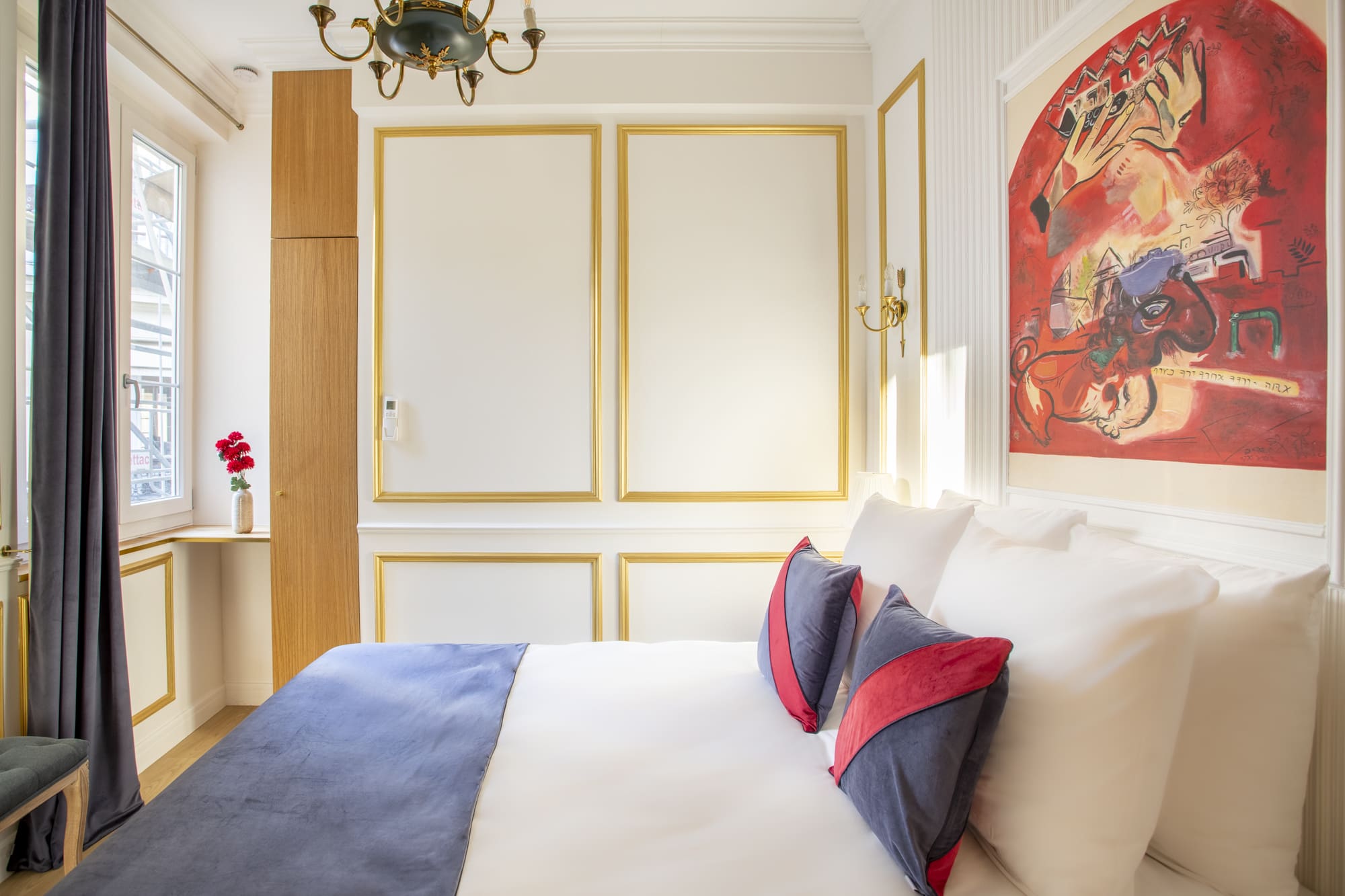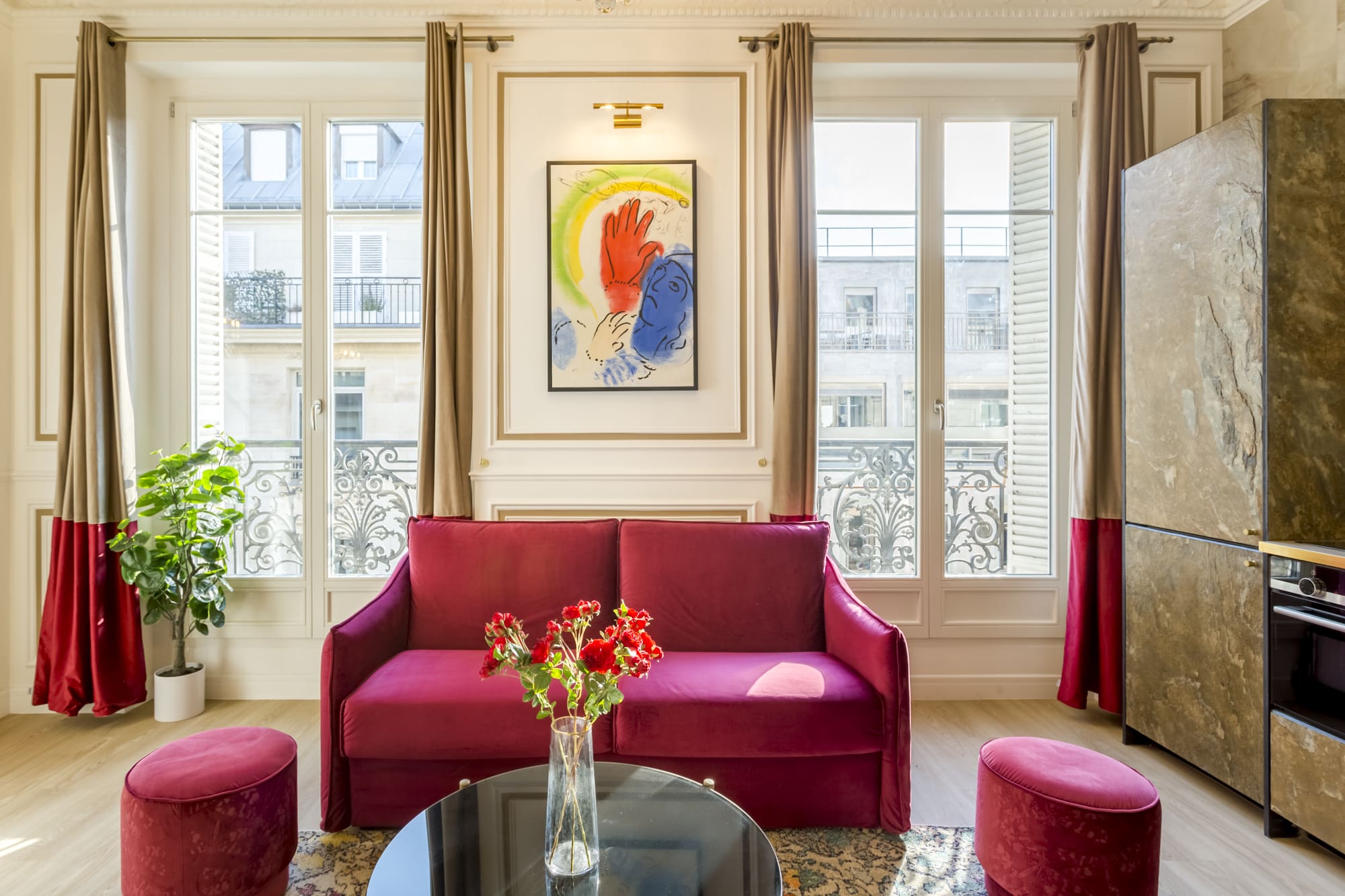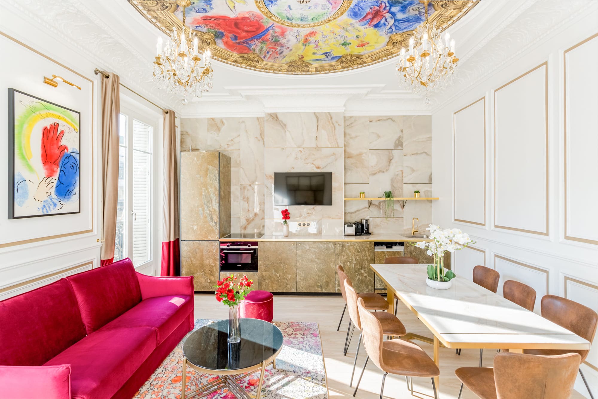 Step into a world of sophisticated style as you enter the apartment’s open-plan living space, where natural light pours in through expansive windows. The living area, adorned with a stunning reproduction of the Opéra Garnier dome, provides a serene space for relaxation and entertainment. The apartment features three beautifully appointed bedrooms, each designed with comfort and elegance in mind, accommodating up to eight guests. The kitchen, while compact, is perfect for preparing light bites with its hob and microwave, and the dining area invites you to enjoy meals in a refined setting.