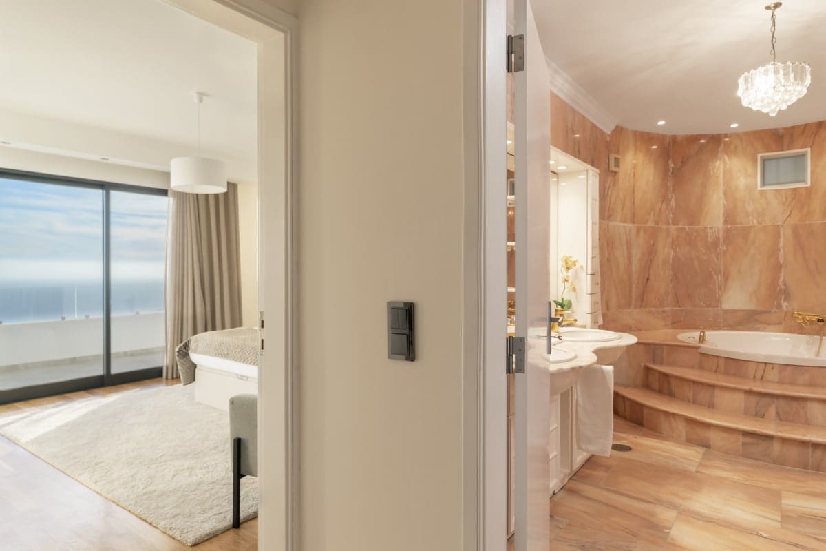 Step into a world of sophistication as you enter this modern apartment, designed to impress with its sleek white and grey tones. The spacious living areas are perfect for social gatherings, featuring floor-to-ceiling windows that frame the breathtaking seascape. The high-spec kitchen is a culinary dream, complete with a sizable island breakfast bar, ideal for leisurely mornings. Each of the five bedrooms is a sanctuary of comfort, some offering private balconies for serene moments of reflection.