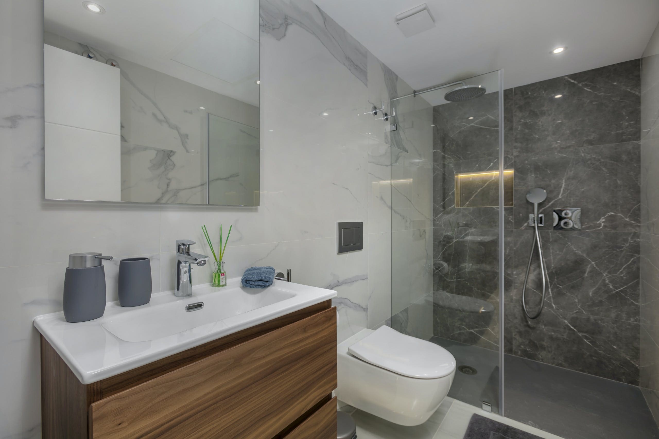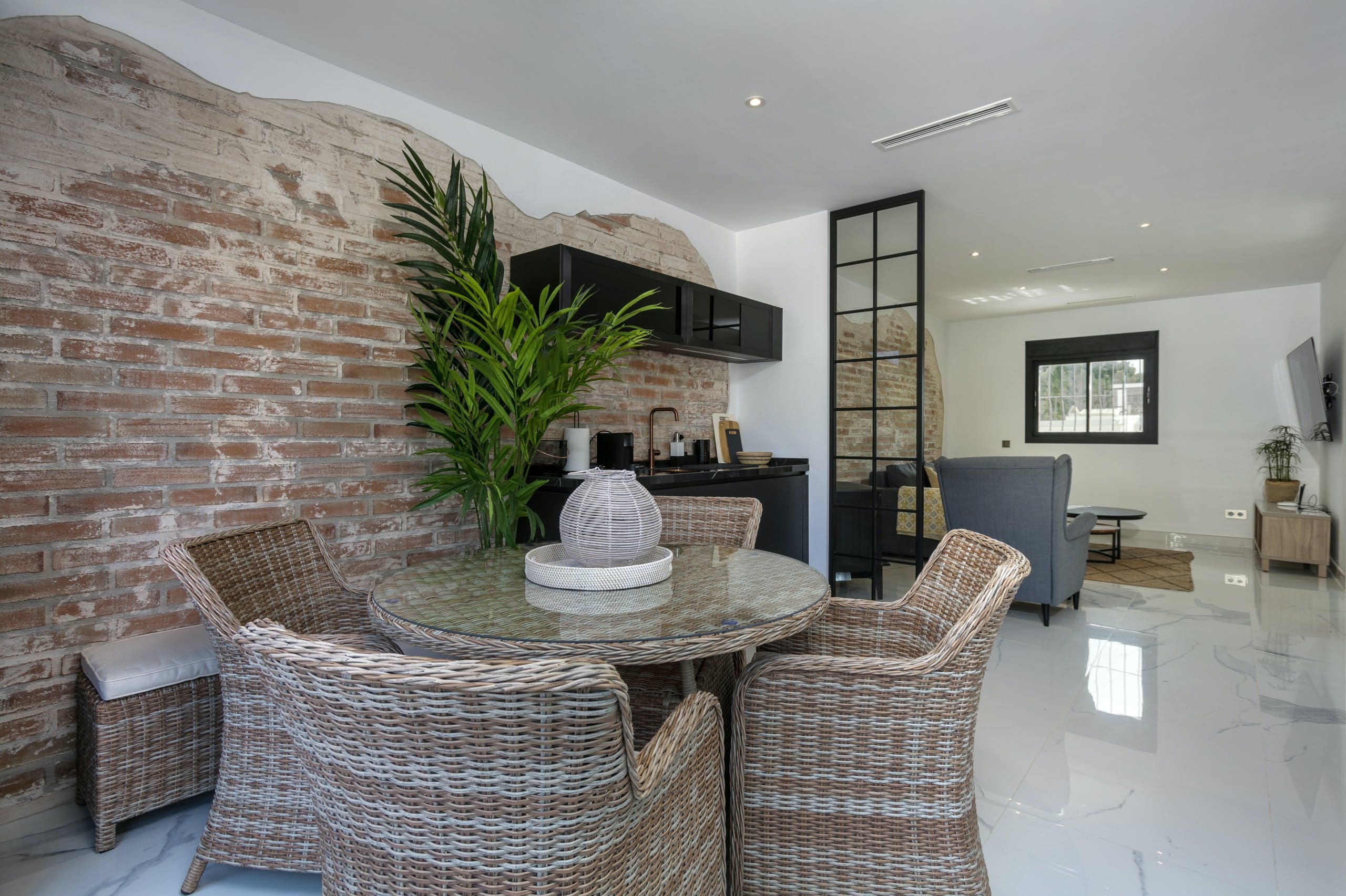 Step inside the apartment, where contemporary design meets the warmth of Spanish charm. The living area is an inviting space with ample natural light pouring in through large glass doors, creating a seamless connection to the outdoors. The modern kitchen is equipped with state-of-the-art appliances and sleek countertops, perfect for both casual meals and gourmet cooking. The apartment offers three beautifully appointed bedrooms, each with its own en-suite bathroom, ensuring privacy and comfort for all guests.