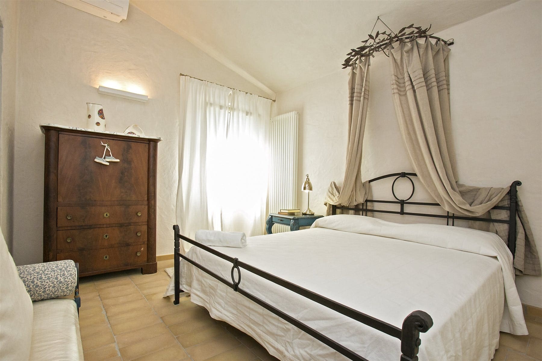 Step inside to find a beautifully designed interior that harmonizes traditional warmth with contemporary style. The apartment features three spacious bedrooms and two modern bathrooms, all equipped with air-conditioning to ensure comfort. The living room, with its exposed beamed ceilings and tile flooring, creates a cozy atmosphere, while the modern kitchen is fully equipped for all your culinary adventures.
