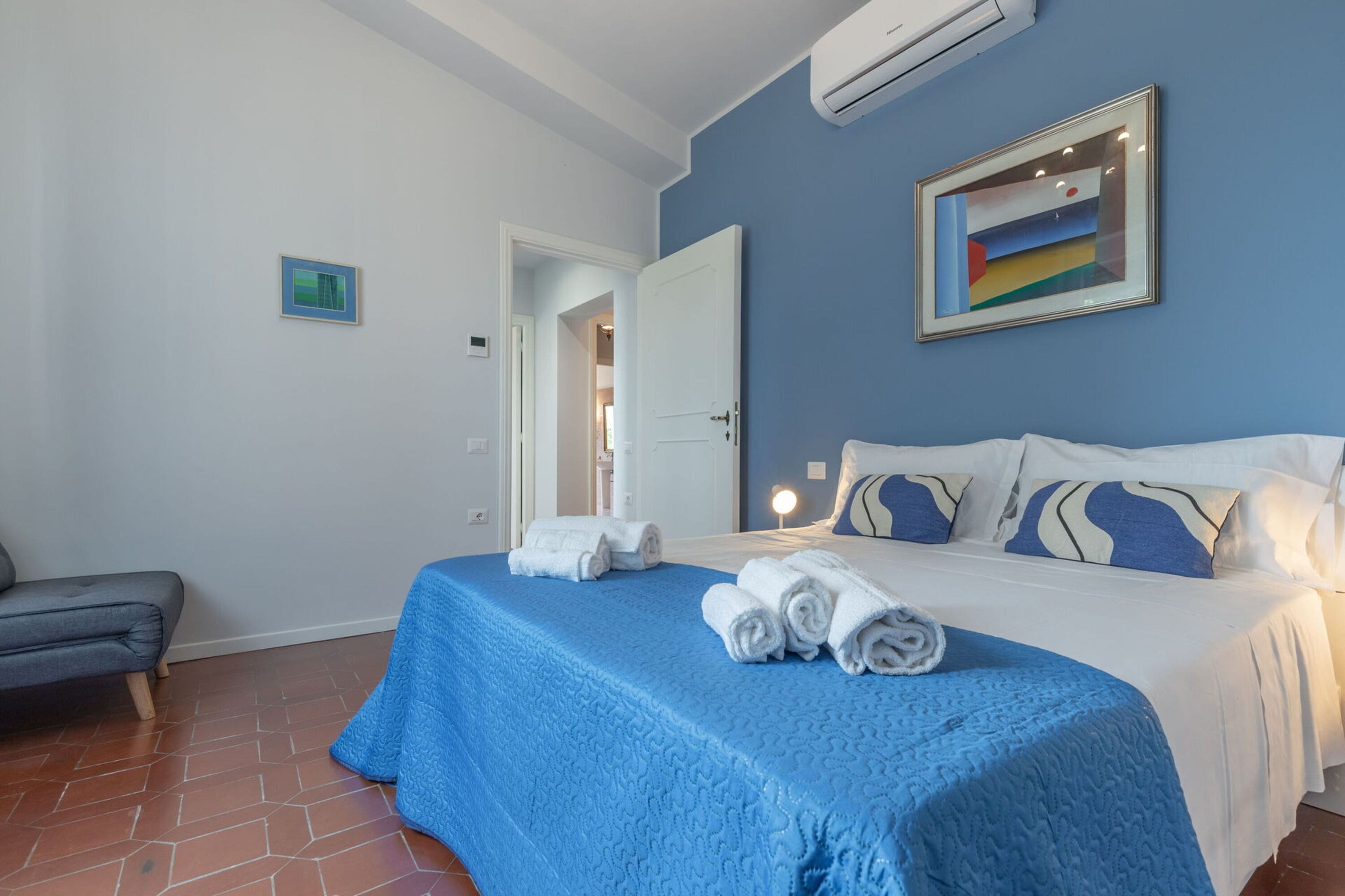 The interiors of this five-bedroom apartment are a harmonious blend of contemporary elegance and classic Italian charm. The living area, spread over a single level with an additional mezzanine, boasts rustic wooden furniture and tile floors that exude warmth and sophistication. The open-plan design allows for seamless movement between the spacious living room, dining area, and a fully-equipped kitchen. Each of the five bedrooms is thoughtfully designed to offer comfort and privacy, accommodating up to 14 guests. The apartment also features three well-appointed bathrooms, ensuring convenience for larger groups.