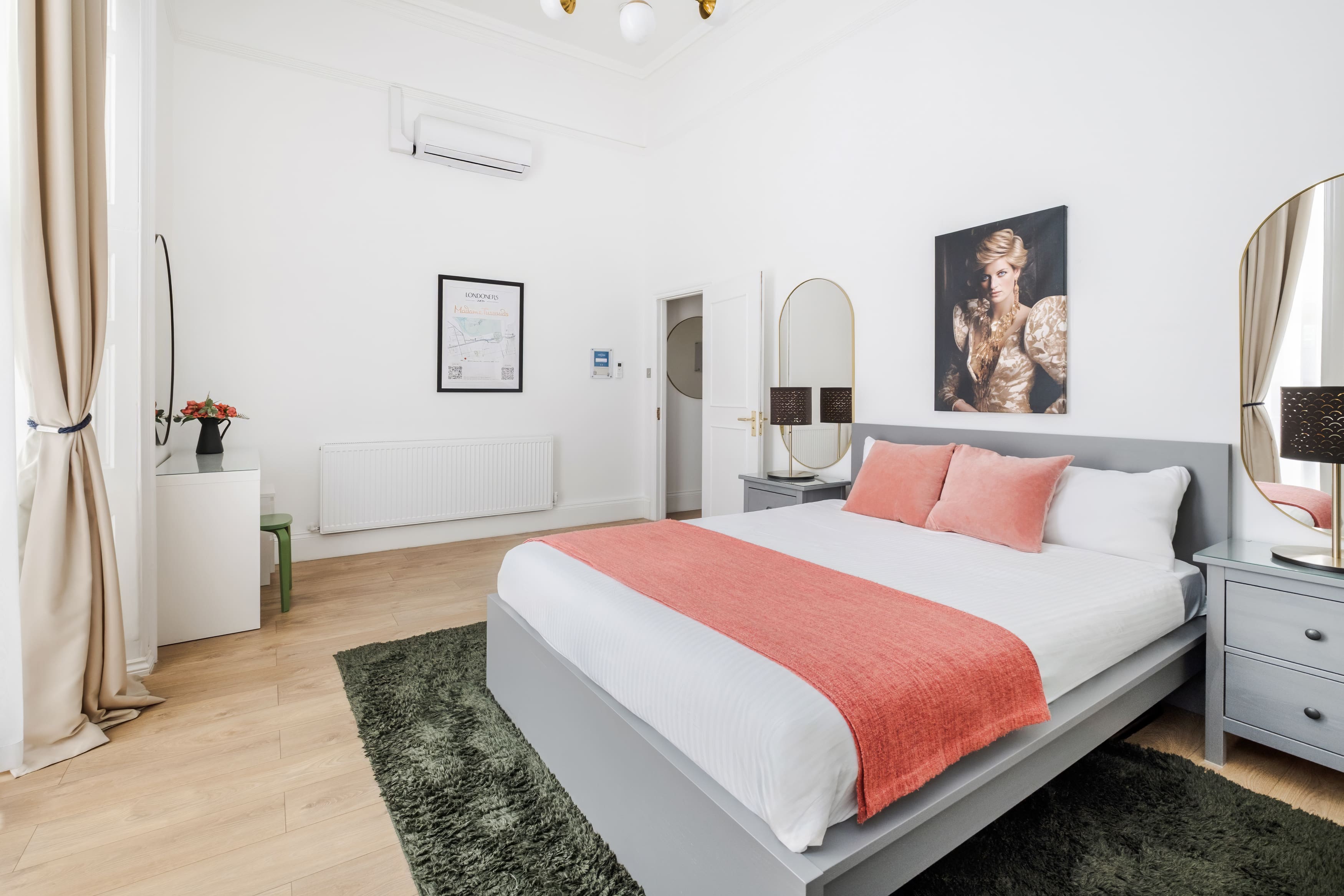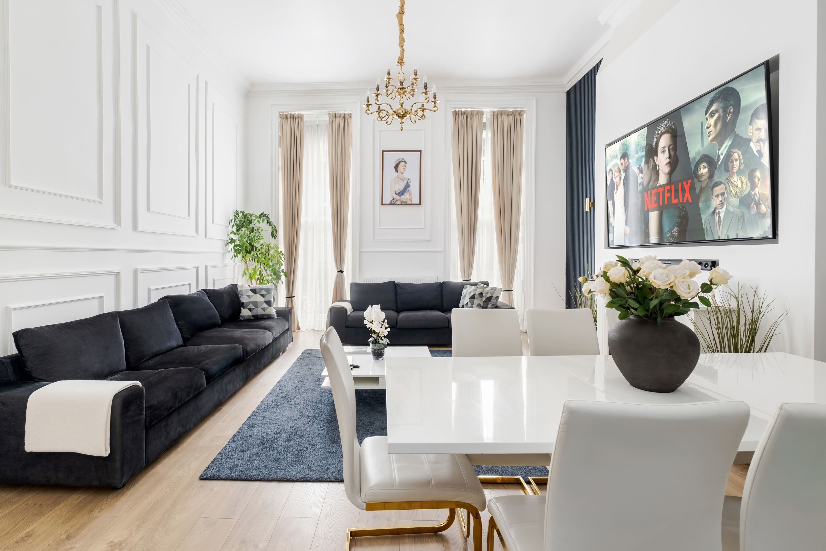 The apartment comfortably sleeps up to eight guests with two bedrooms and additional sofa beds. Located on the first floor with a shared entrance, guests should be prepared to climb stairs as there is no lift access. While parking is not available, the proximity to Regent’s Park Station ensures easy travel throughout London. Explore more options by browsing our luxury villa rentals in United Kingdom.