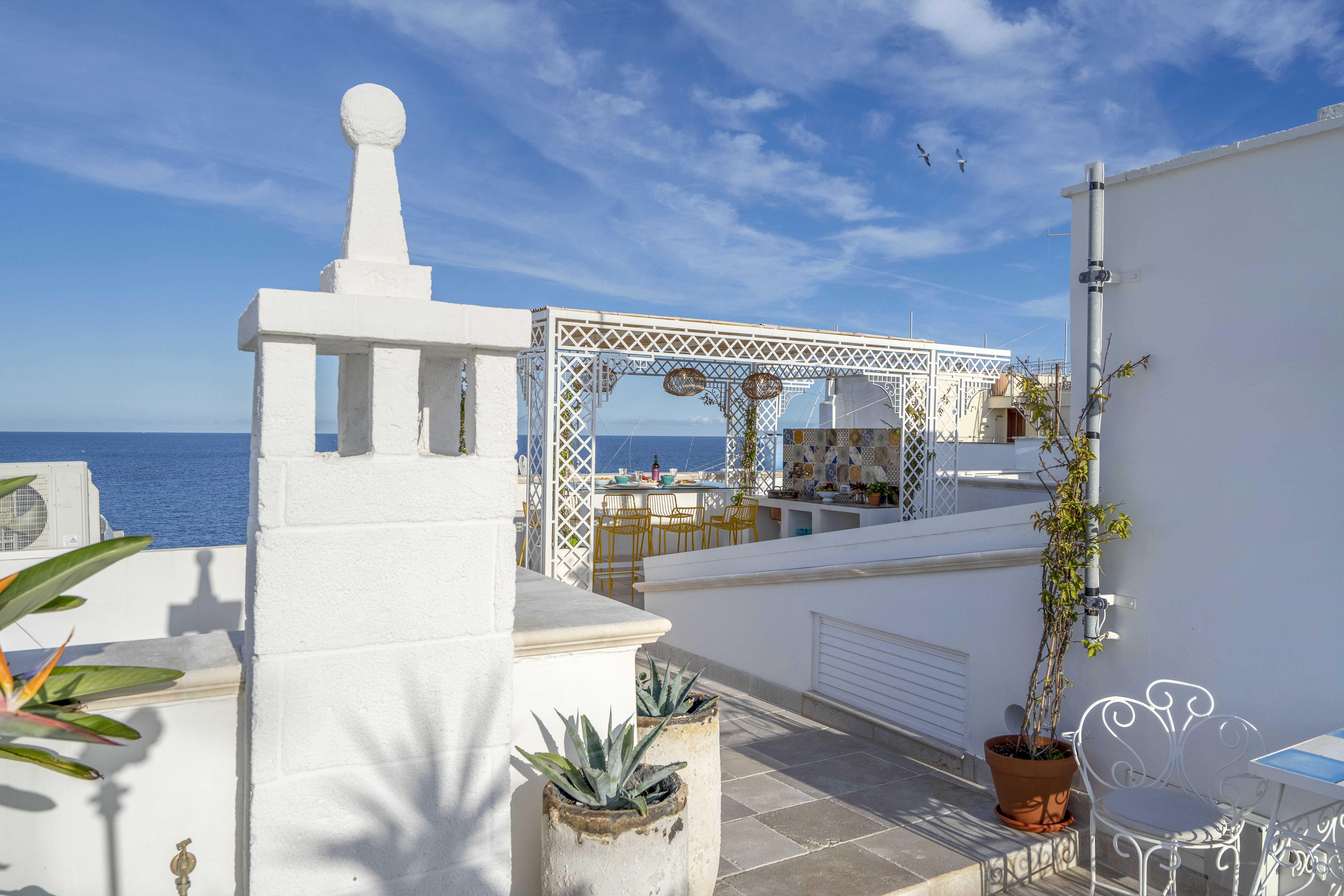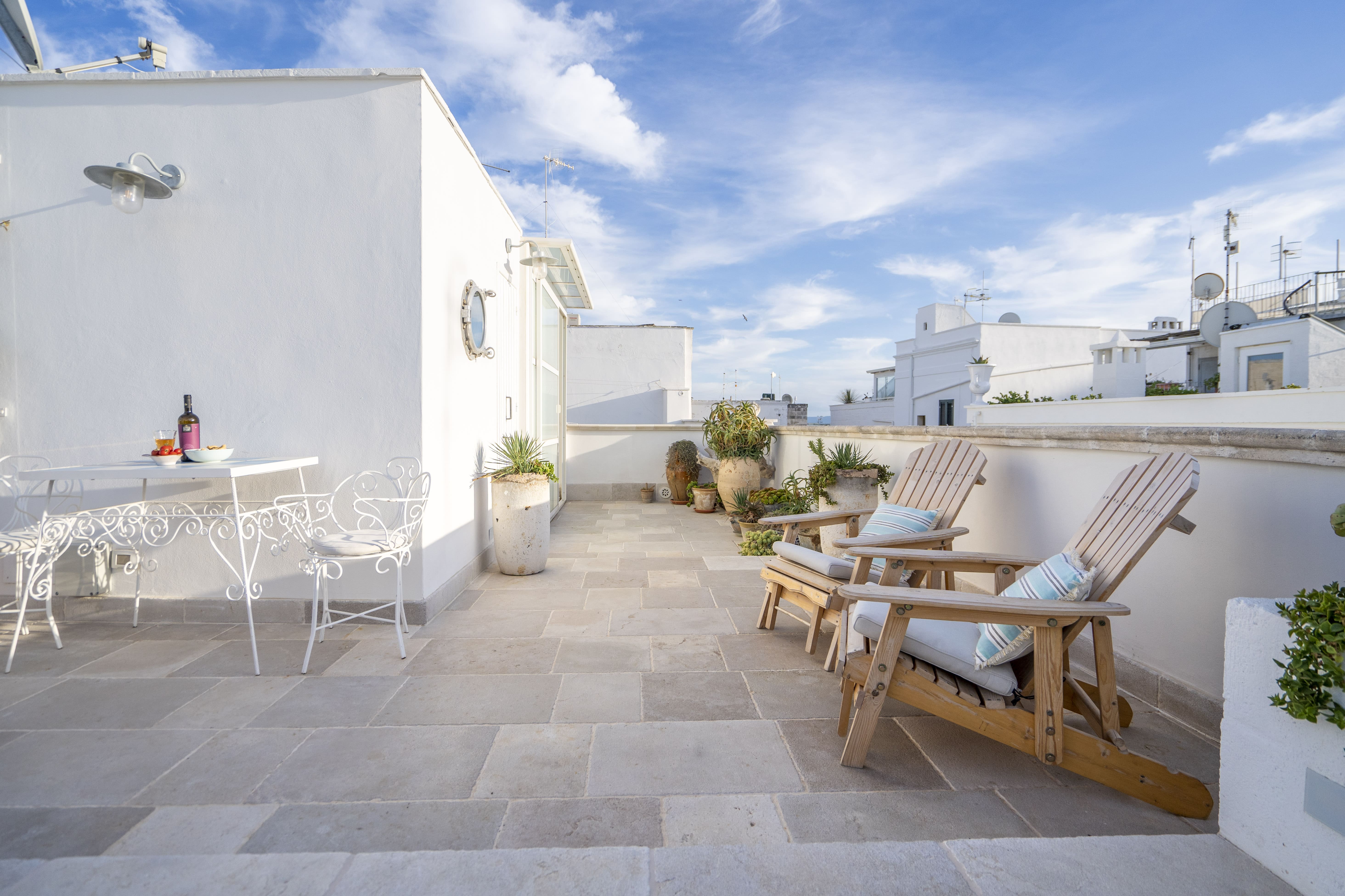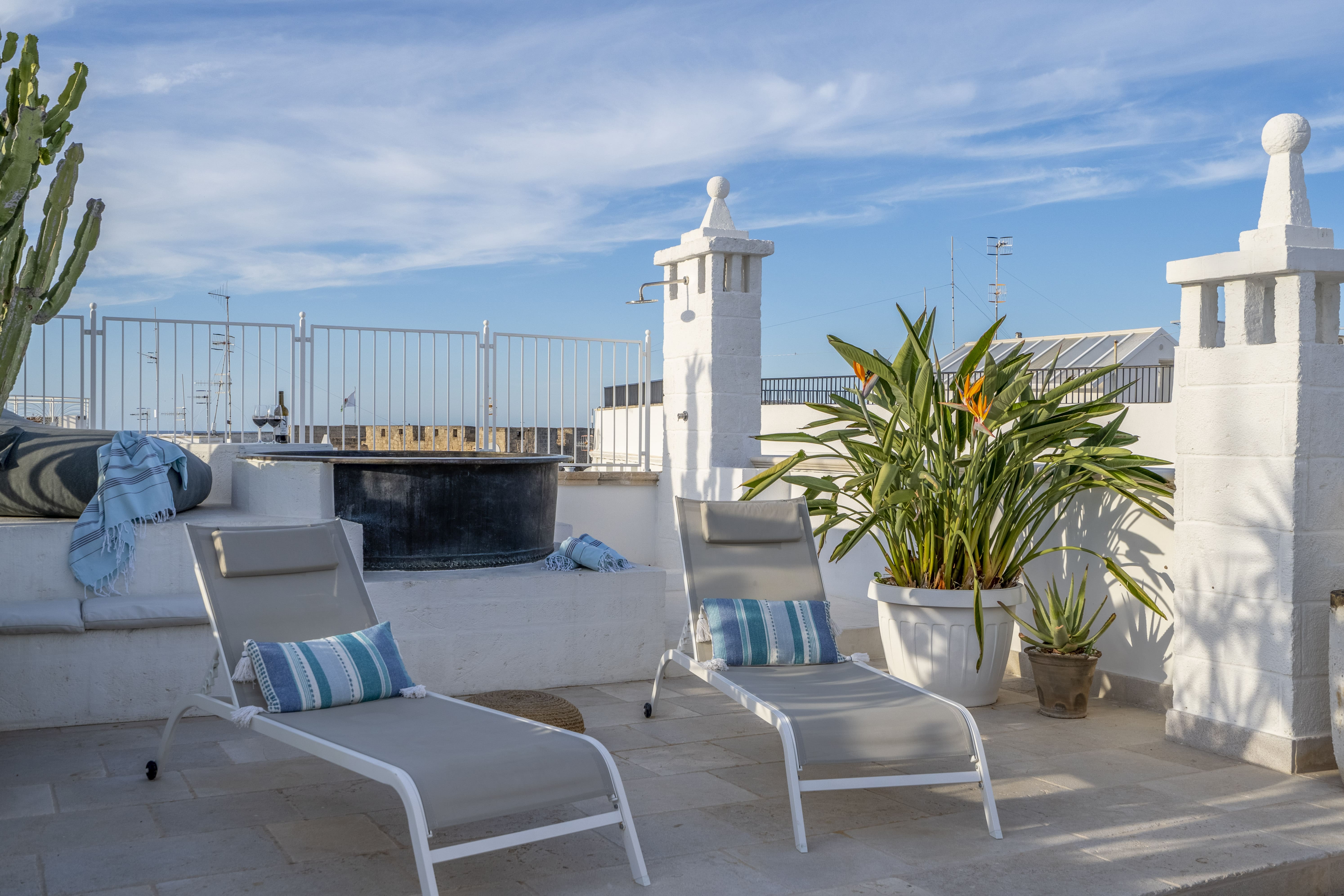 The rooftop terrace is a highlight, offering panoramic views of Monopoli’s skyline and the Adriatic Sea. Enjoy alfresco dining under the stars, complete with an outdoor kitchen, dining table, and a hot tub repurposed from an antique French cheese vat. The nearby beaches add to the allure, though note that Cala Porta Vecchia is temporarily closed for restoration.