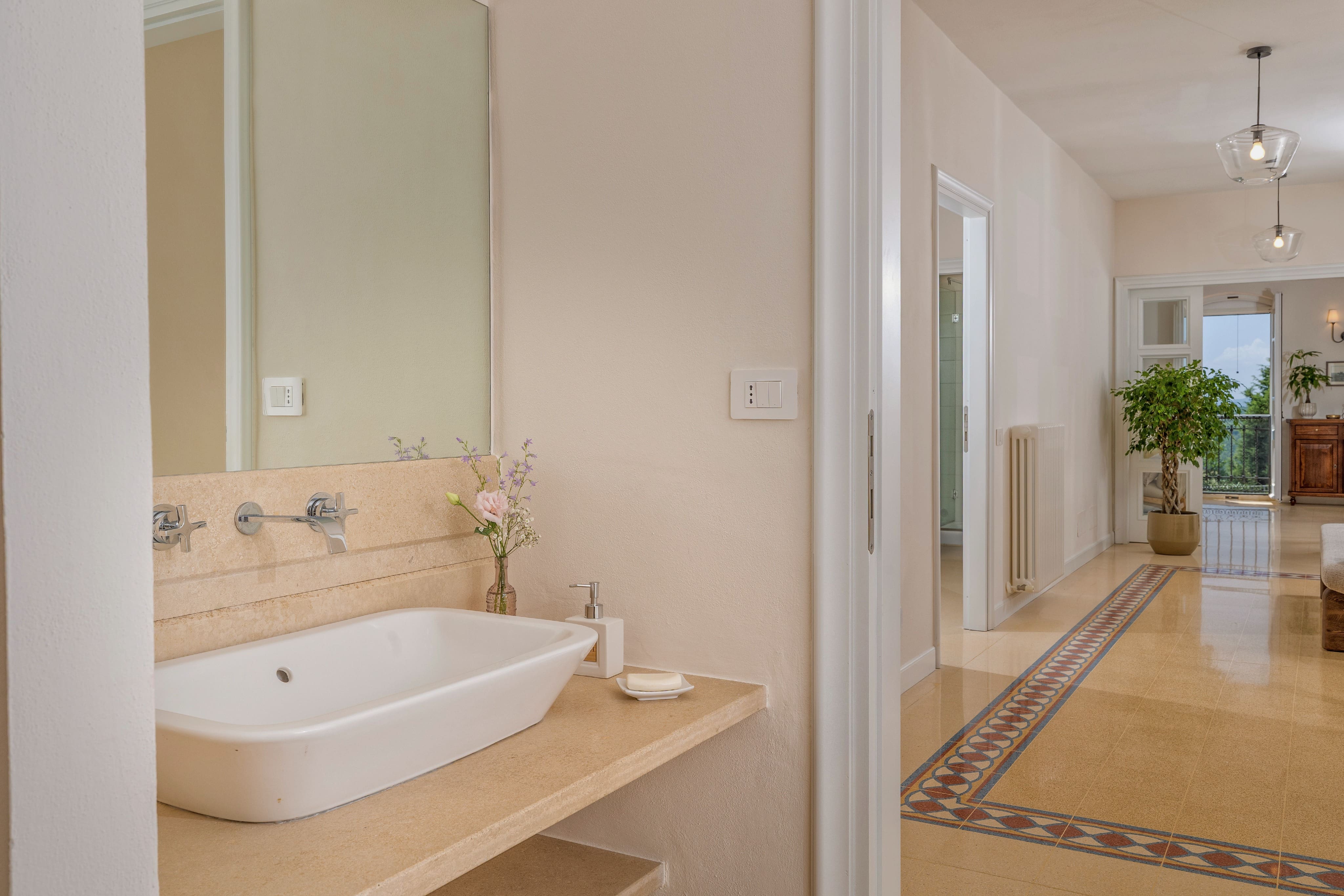 The villa accommodates up to 18 guests across nine bedrooms and eight bathrooms. Parking is available for up to three cars, and one of the apartments is ground-floor accessible, suitable for guests with reduced mobility. Well-behaved pets are welcome upon request. For more options, browse our luxury villa rentals in Italy.