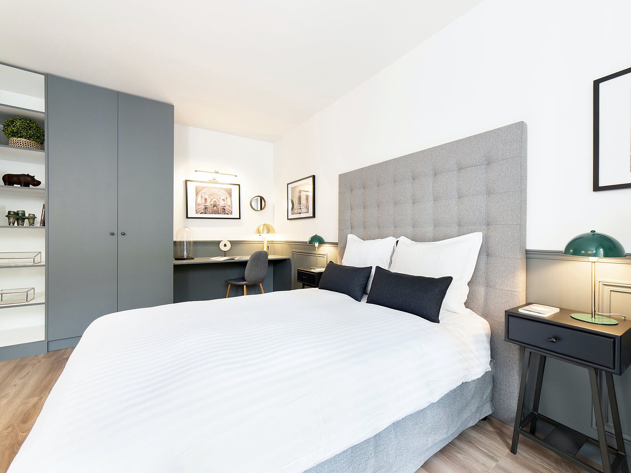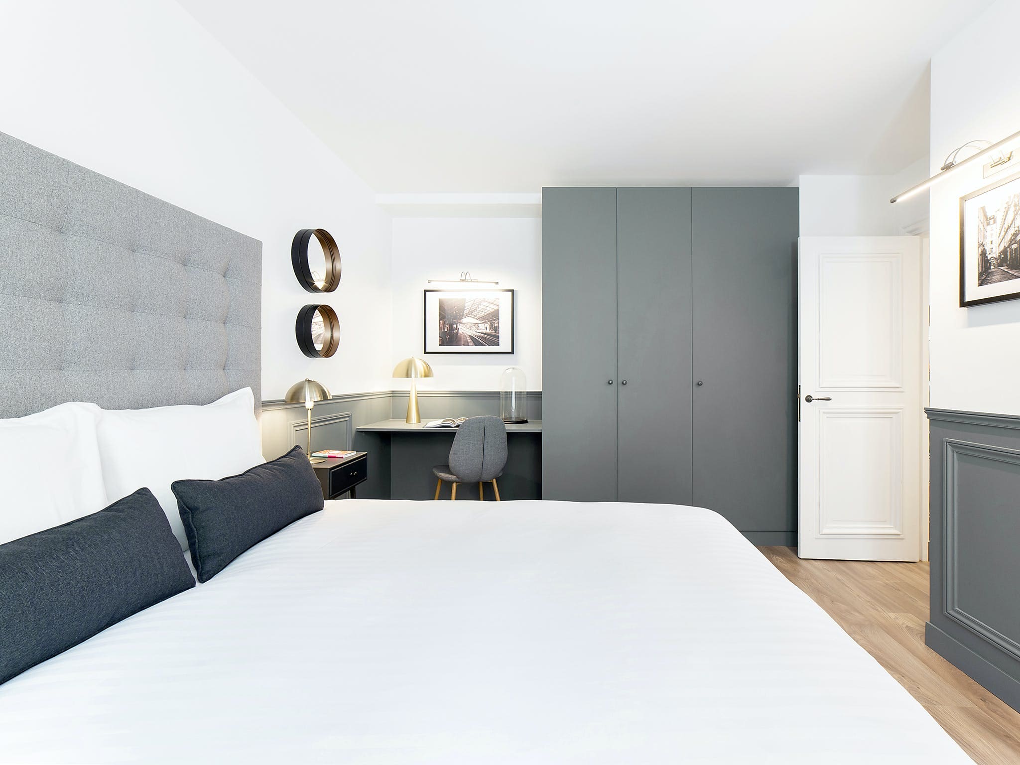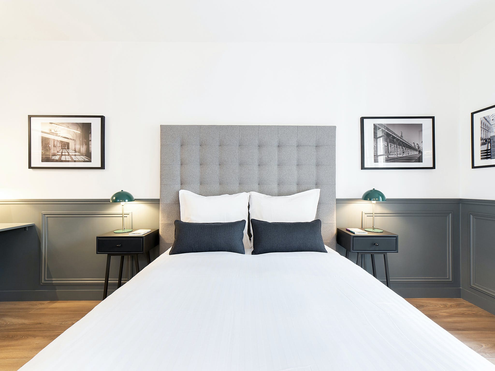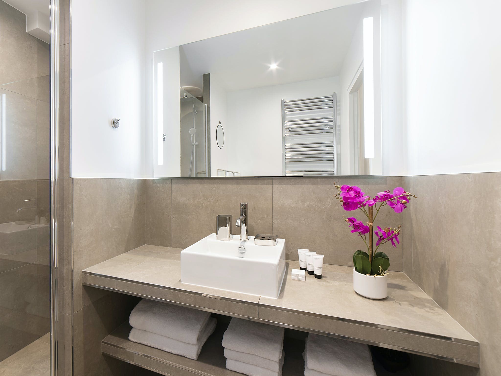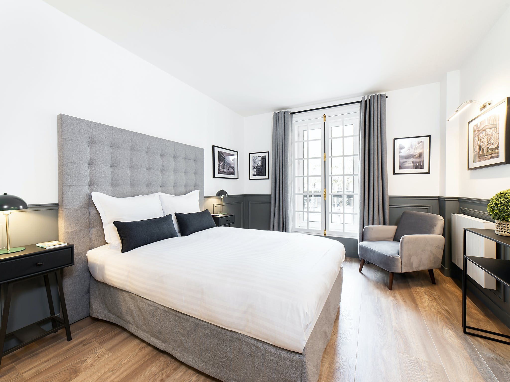 The interior of this luxury apartment Paris Montorgueil is a testament to contemporary design and timeless elegance. Flooded with natural light from the tall windows, the living space exudes warmth with its wooden flooring and muted tones. The minimalist kitchen, adorned with matte grey surfaces and subtle underlighting, is both functional and chic. Bedrooms offer plush bedding and ample storage, while the modern bathrooms feature invigorating rainfall showers, ensuring a refreshing start to your day.