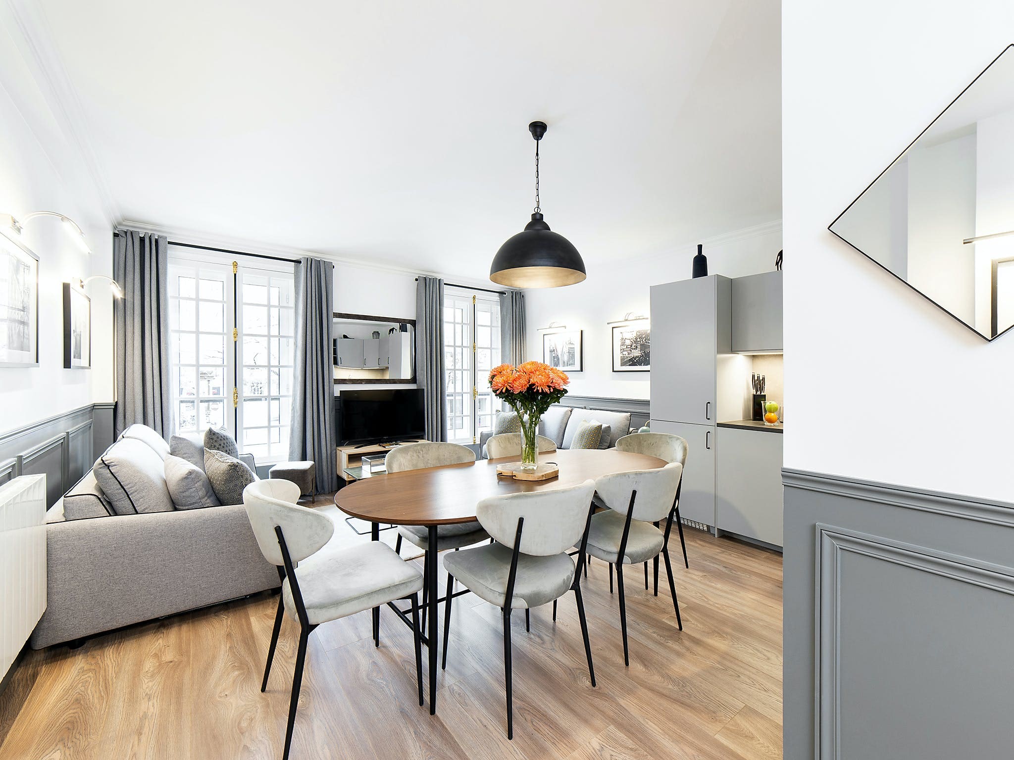 Welcome to the luxury apartment Paris Montorgueil, a sophisticated urban retreat nestled in the heart of one of the city’s most vibrant districts. This charming two-bedroom, two-bathroom apartment provides a stylish haven for up to six guests, offering a blend of modern comfort and Parisian elegance.