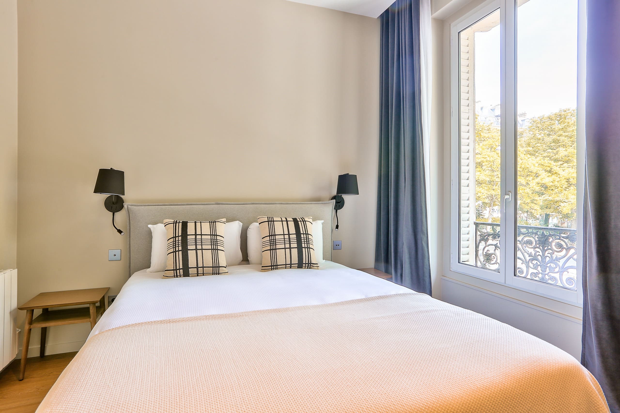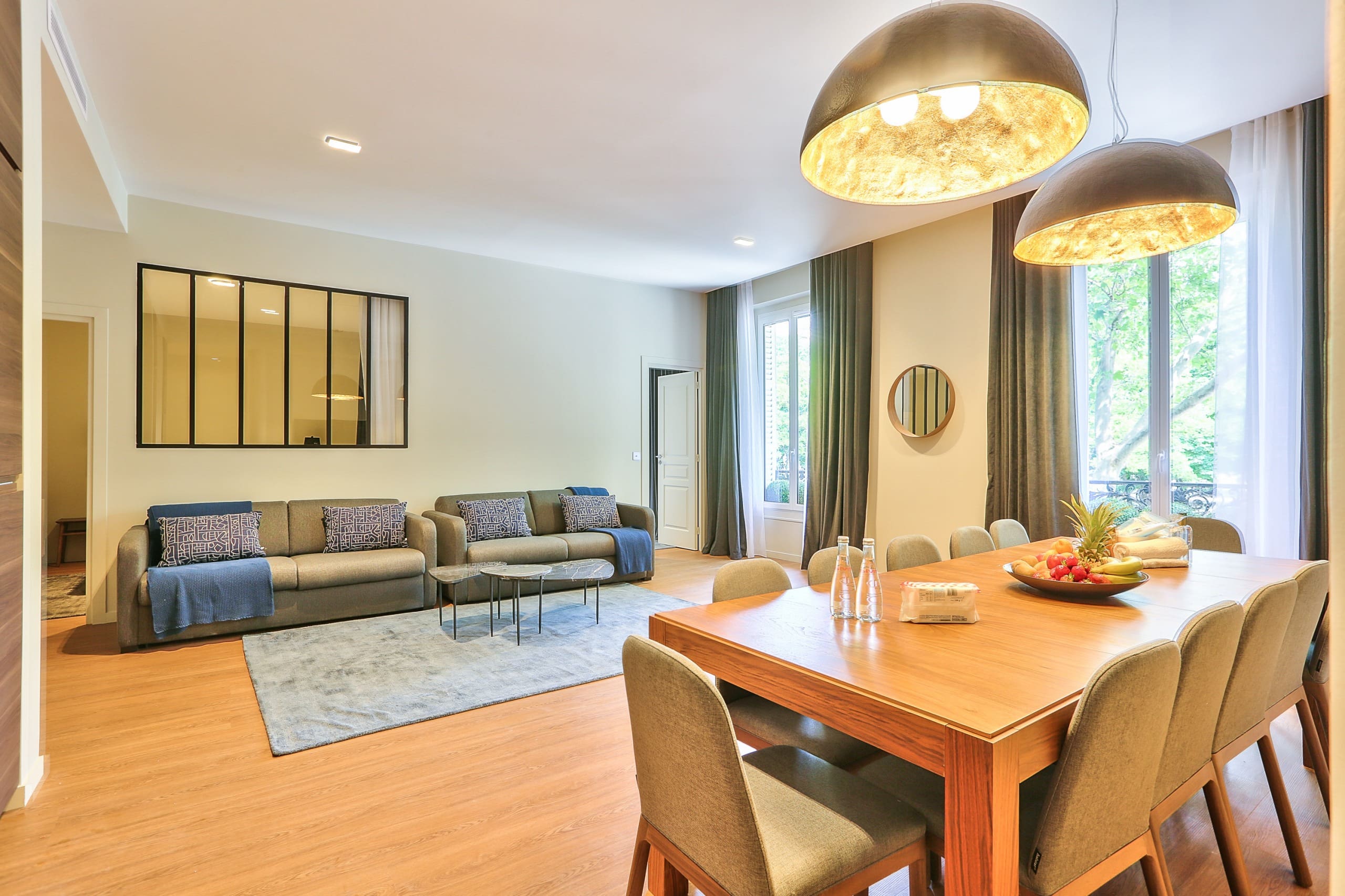 The interior of this luxury apartment rental in Paris is a testament to refined taste and functionality. With five beautifully appointed bedrooms, this apartment comfortably accommodates up to 17 guests. The living area features two plush sofas and a stylish dining space that seats twelve, creating an inviting atmosphere for social gatherings. The kitchen, though compact, is fully equipped to cater to your culinary needs. Each of the three bathrooms is elegantly designed, offering a serene escape after a day exploring the city. The convenience of air-conditioning ensures a pleasant stay year-round.