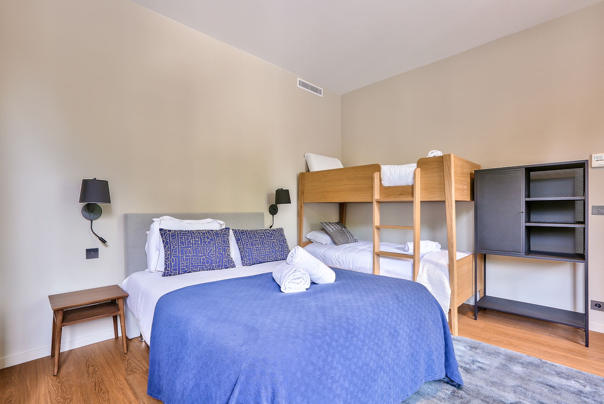 The apartment accommodates up to 17 guests across five bedrooms, with additional sleeping arrangements provided by double sofa beds. There are three luxurious bathrooms, ensuring comfort for all guests. Please note the kitchen and dining area are compact, and only one key is provided, which may require coordination for larger groups. For fitness enthusiasts, access to a communal gym and sauna is available a short walk away. Browse our luxury villa rentals in France for more properties.
