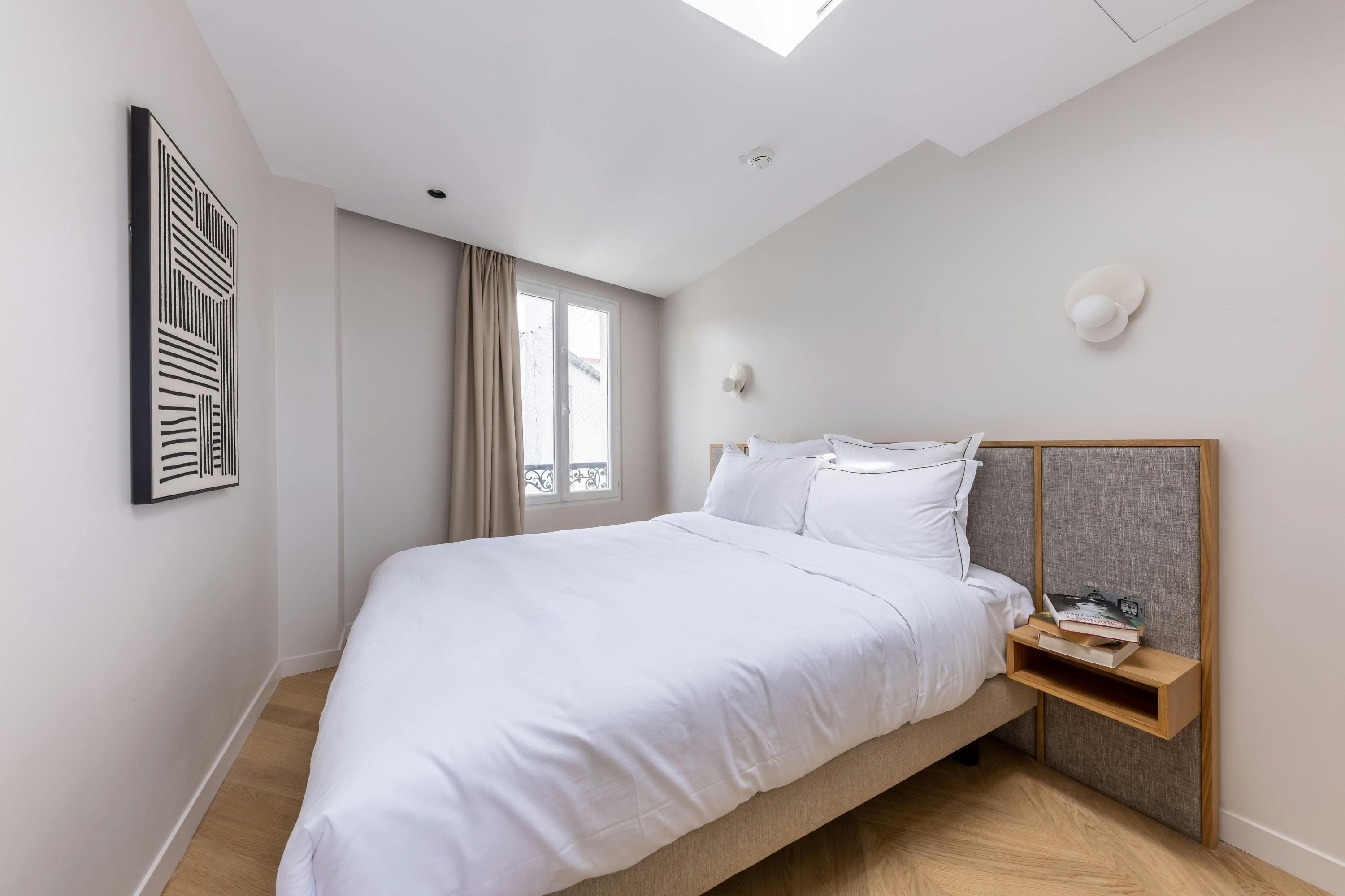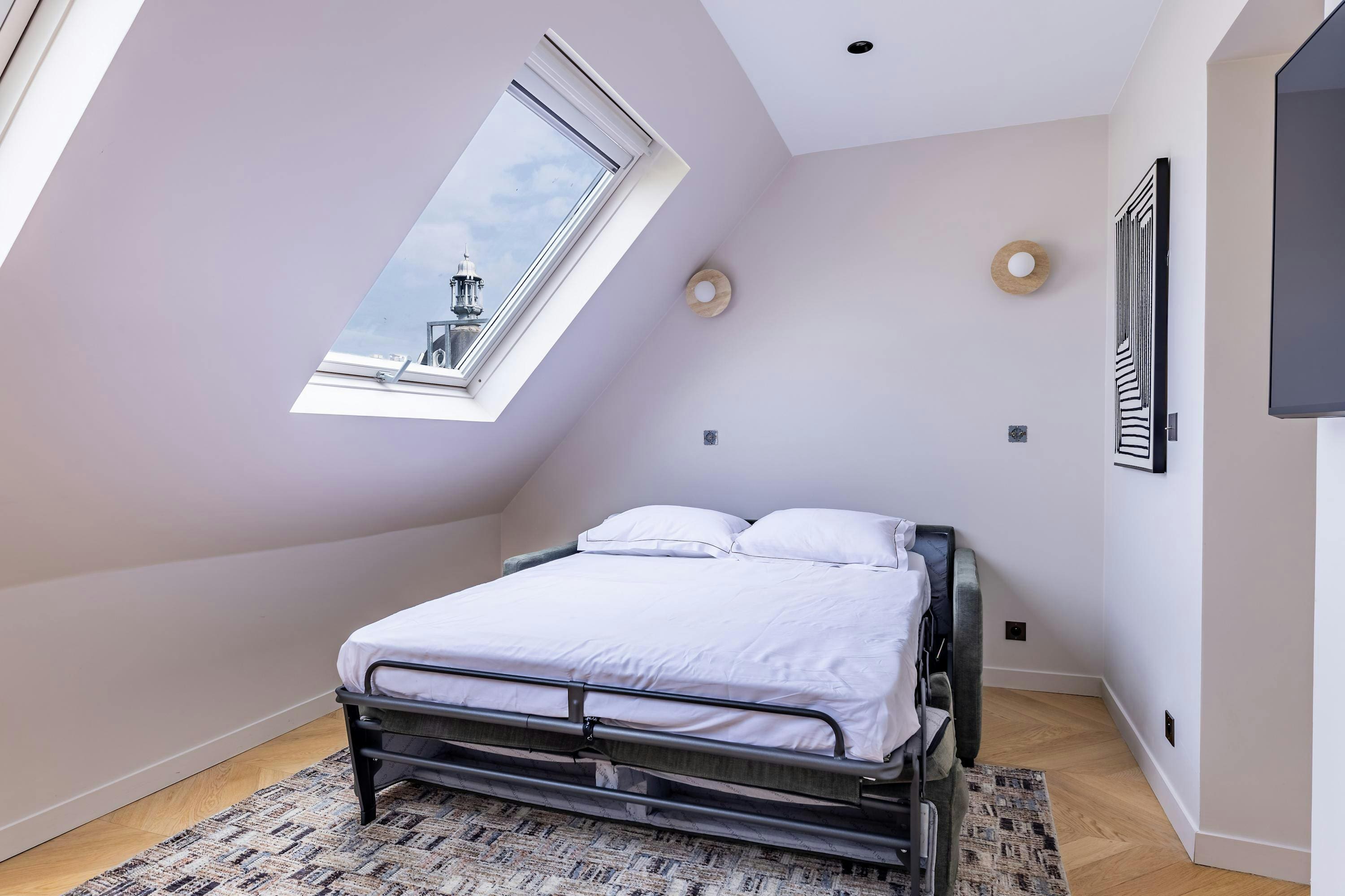 The interior of this townhouse exudes Parisian elegance, featuring two beautifully appointed bedrooms and a chic living space designed for relaxation and style. The living area includes a cozy sofa bed, allowing the property to comfortably accommodate up to six guests. The modern kitchen is fully equipped, providing everything you need to prepare delightful meals during your stay. With tasteful decor and thoughtful amenities, this property ensures a memorable Parisian experience.