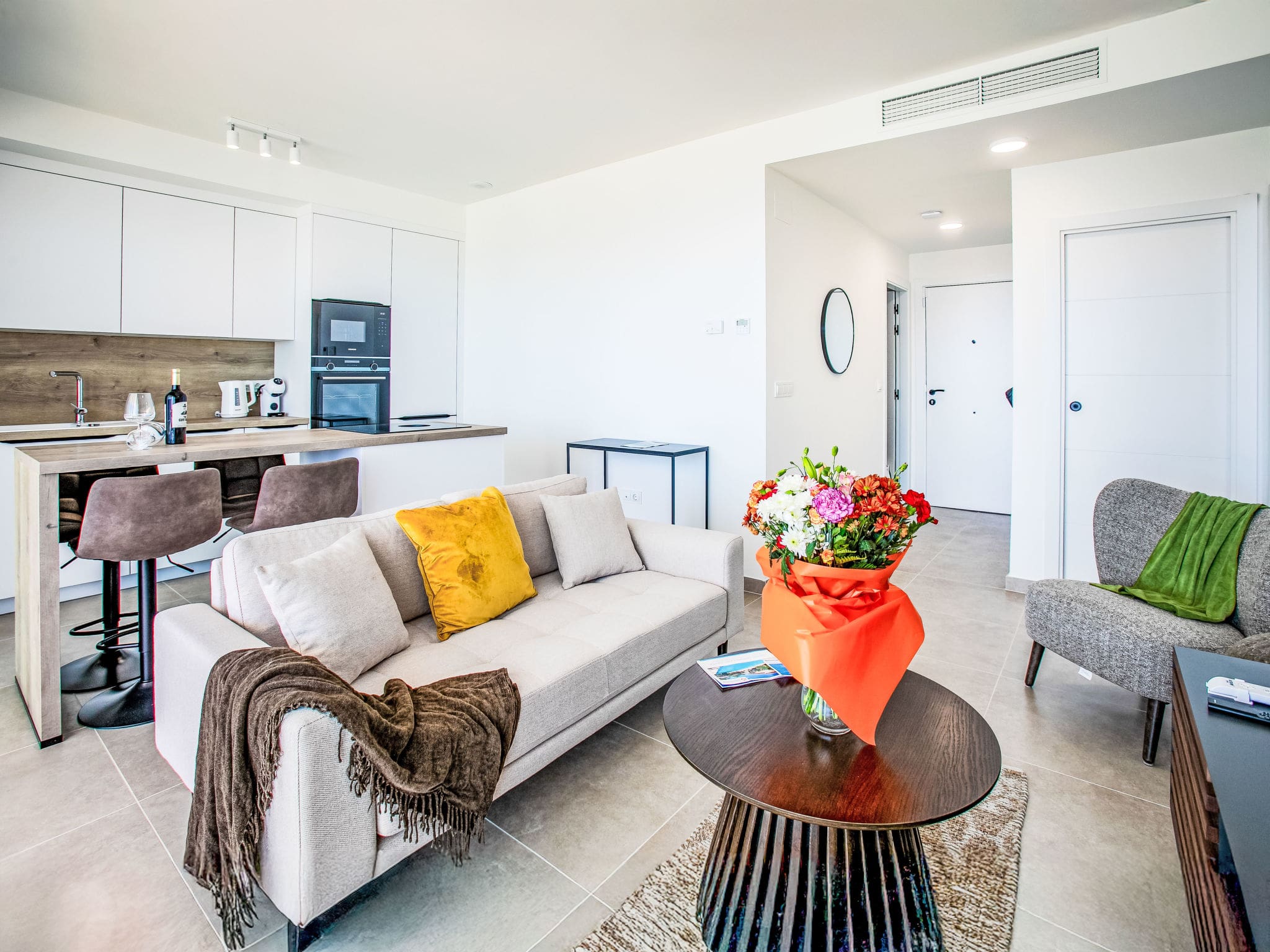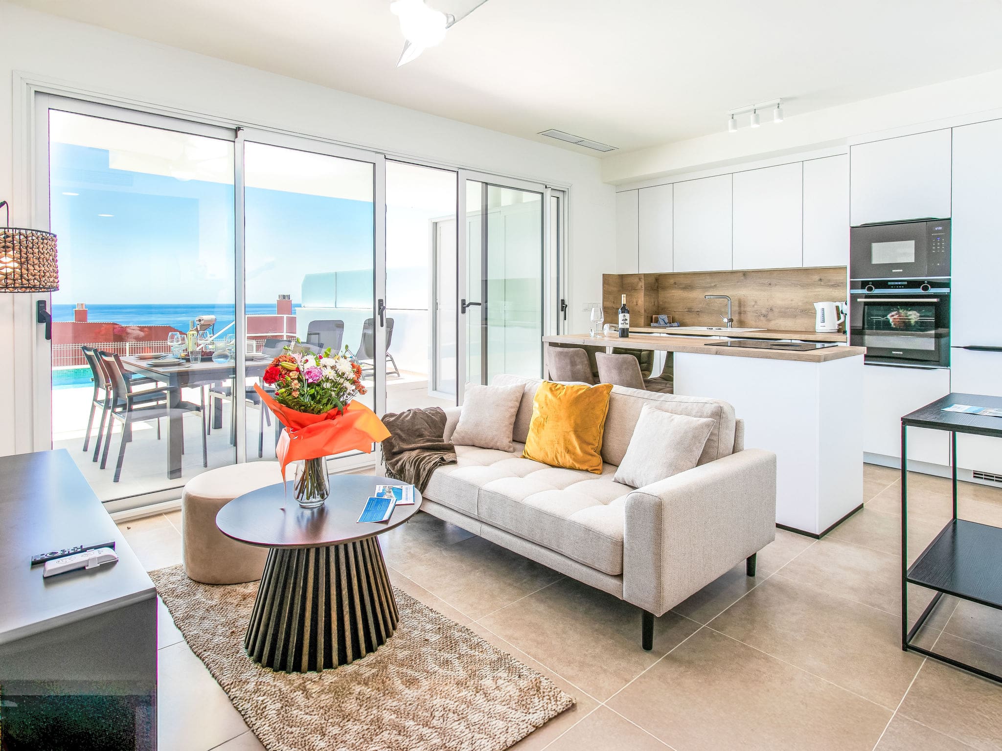 The 75-square-meter apartment showcases contemporary Spanish design with clean lines and sophisticated comfort throughout. The open-plan living and dining area flows seamlessly onto a large private terrace, where panoramic sea views stretch across the sparkling Mediterranean. French doors maximize natural light, while air conditioning ensures comfort during warm Andalusian summers. The master bedroom features a luxurious French bed and direct terrace access, complemented by an elegant en-suite shower room. A second bedroom with twin beds provides flexible accommodation for families or friends, while a second bathroom serves the main living areas. The fully equipped kitchen features modern appliances including an induction hob, dishwasher, and premium coffee machine, perfect for preparing Mediterranean feasts using local ingredients.