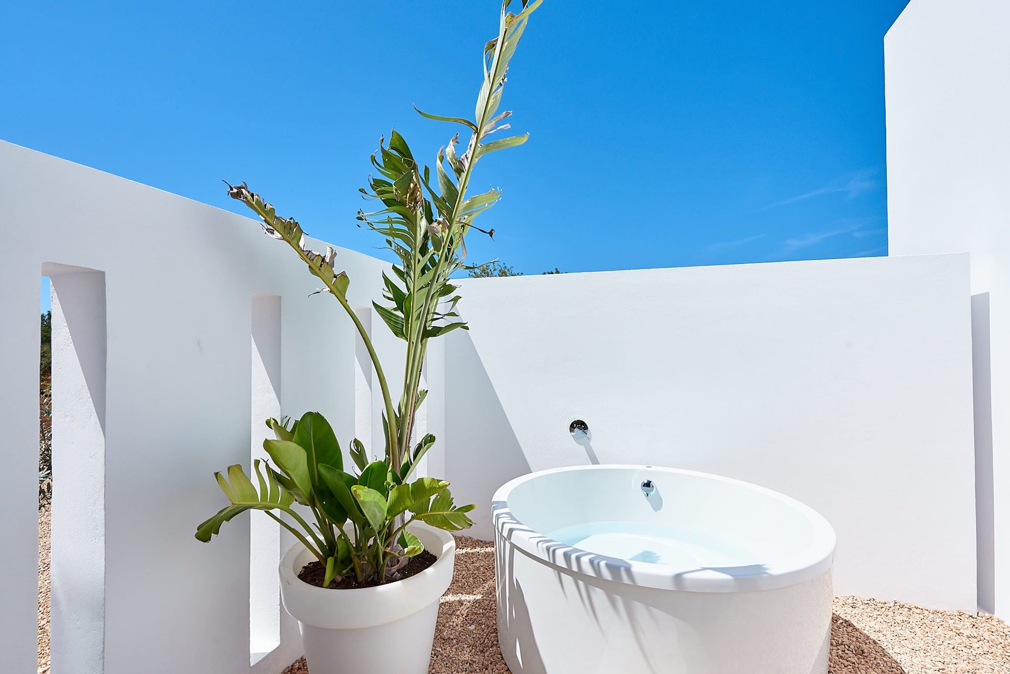 The villa’s outdoor spaces are a true highlight, with a stunning swimming pool offering panoramic views of the Mediterranean Sea. Unwind in the hot tub or dine alfresco in the outdoor dining area, surrounded by lush gardens and orchards. The expansive terraces provide ample space for sunbathing and enjoying the breathtaking Ibizan sunsets.
