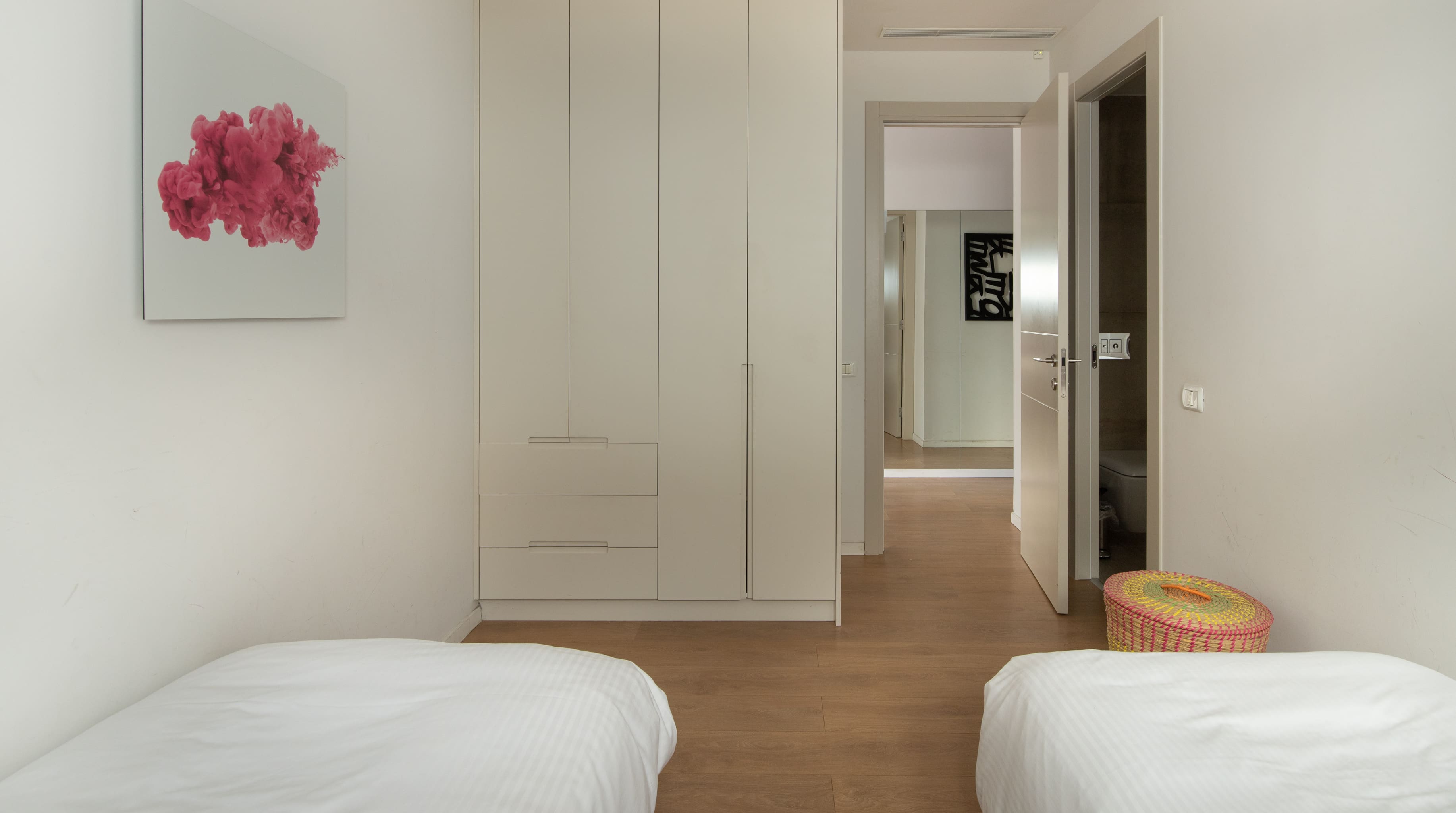 Accommodating up to six guests, this apartment features three bedrooms and two bathrooms. Guests can easily check in with a keypad system for convenience. Note that the main bedroom’s en-suite bathroom does not have a door. Ben Gurion Airport is located 25 kilometers away, providing easy access. Browse our luxury villa rentals in Israel for more properties.