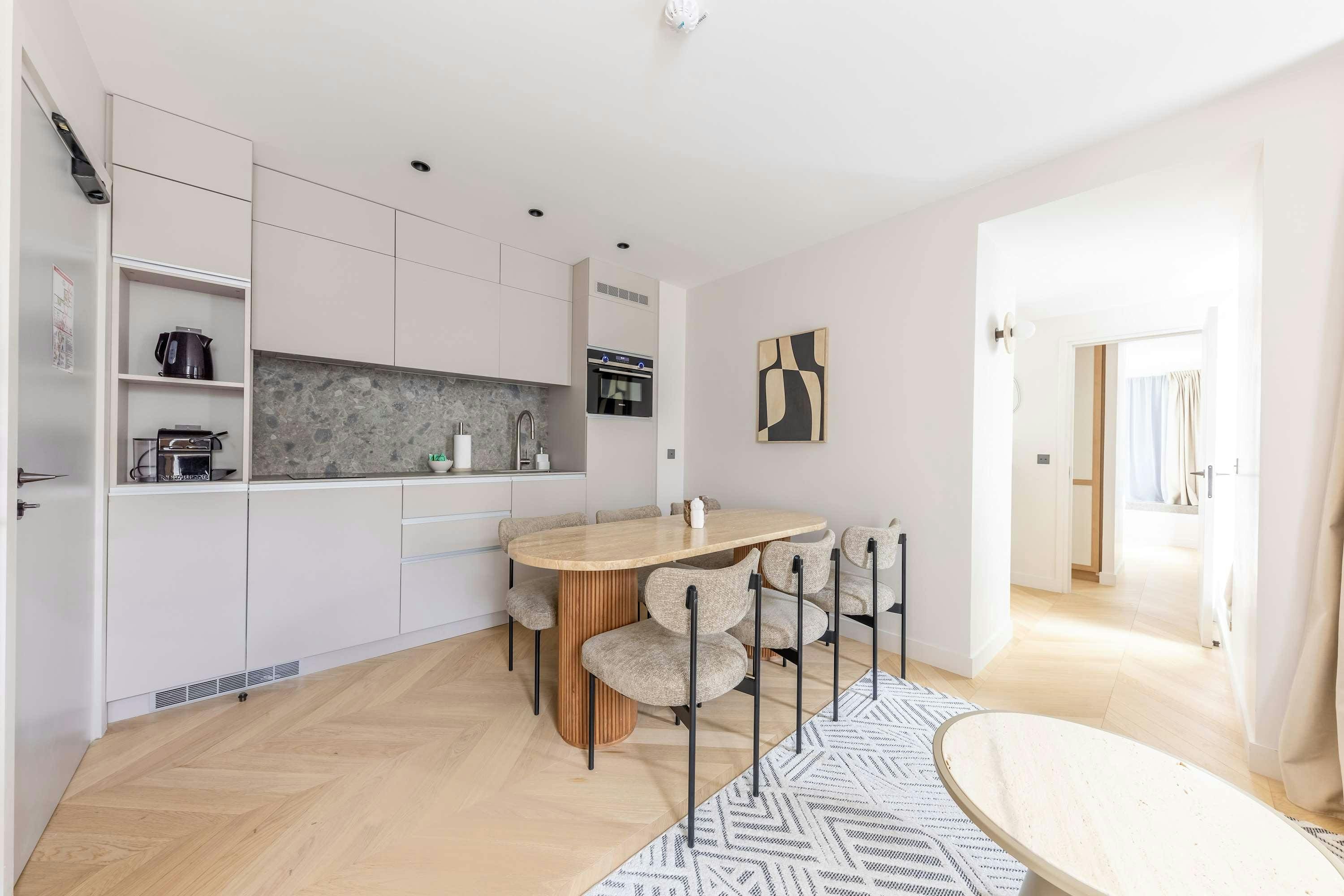 Step into a world of refinement as you enter the open-plan living space, where modern elegance meets classic Parisian charm. The living area features a sumptuous sofa bed, ideal for accommodating up to two additional guests. Each of the two bedrooms is a sanctuary of comfort, complete with an en-suite bathroom and a desk, perfect for remote working. The contemporary kitchen is equipped with state-of-the-art appliances, making it a delight for culinary enthusiasts.