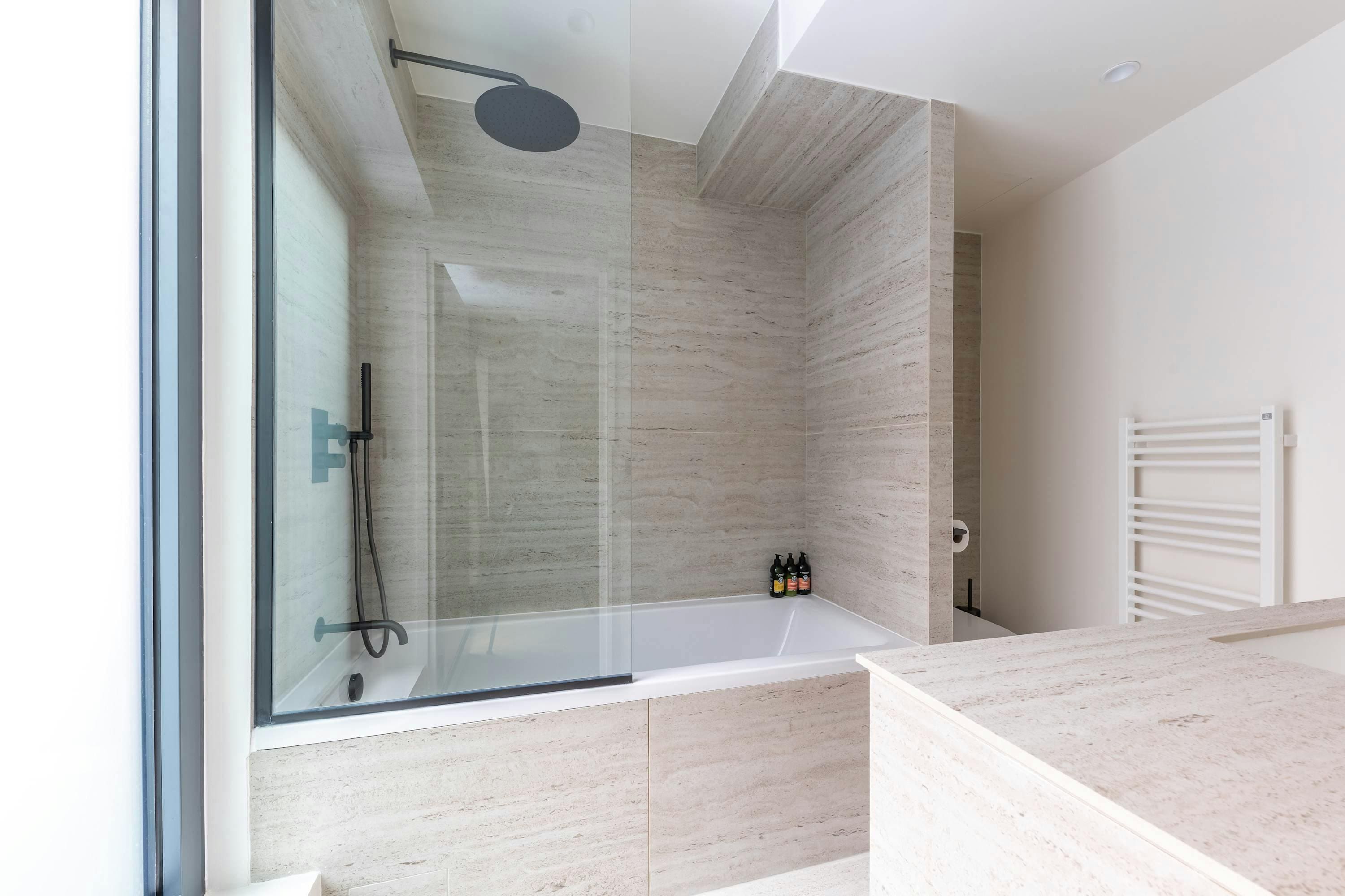 Step inside to discover a harmonious blend of contemporary design and timeless Parisian charm. The spacious living area provides a comfortable setting for relaxation or social gatherings, complete with a plush sofa bed for additional guests. The sleek, fully-equipped kitchen invites culinary exploration, while the two luxurious bedrooms, each with an en-suite bathroom, offer serene retreats. A standout feature is the indulgent bathtub, perfect for unwinding after a day exploring Paris.