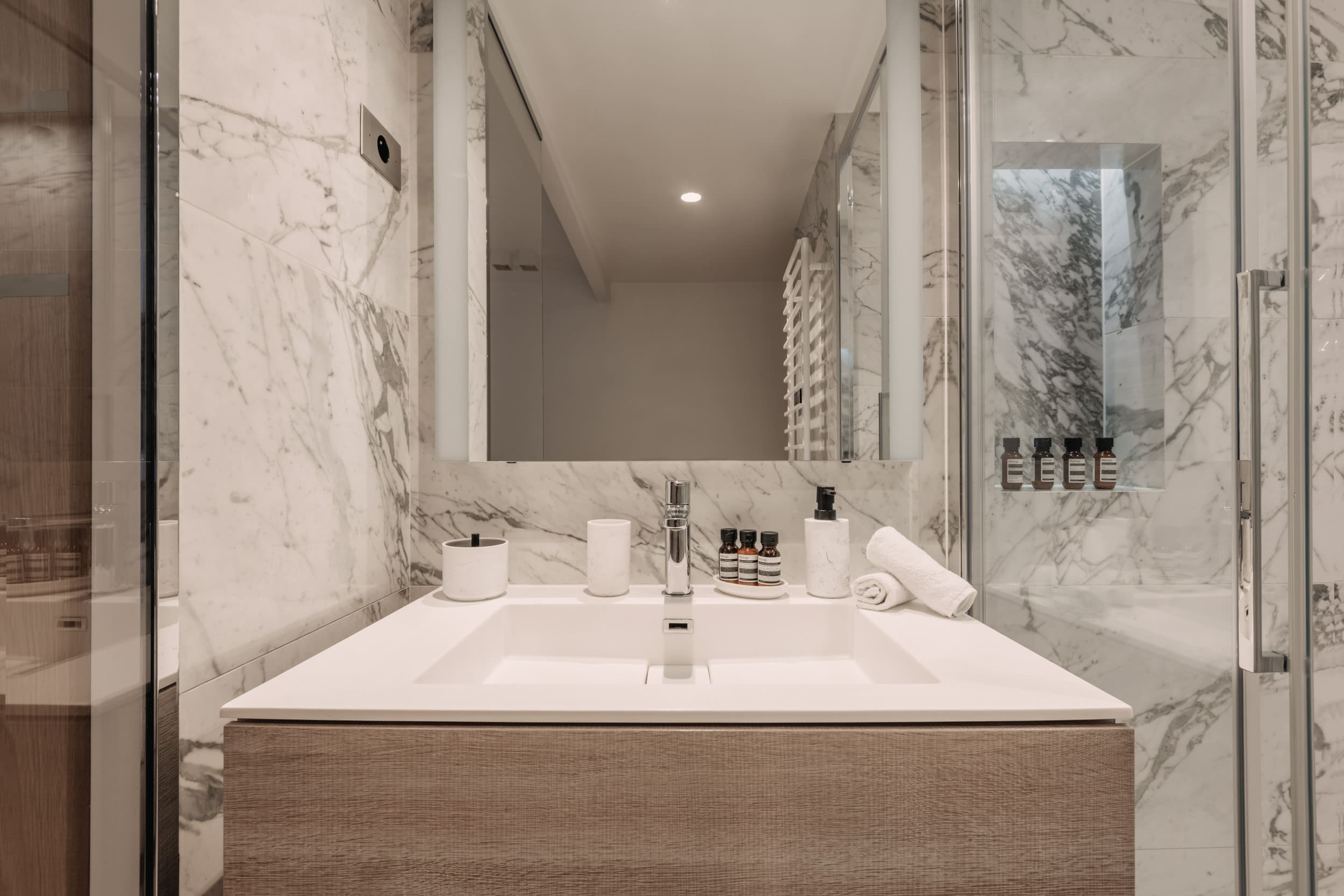 Step into a world of sophistication as you enter this beautifully designed apartment. Sunlight pours in through the expansive floor-to-ceiling windows, illuminating the chic, minimalist interior. The spacious living area is perfect for unwinding, equipped with a state-of-the-art Sonos sound system and comfortable seating. The fully equipped kitchen is a haven for culinary enthusiasts, while the elegant dining area sets the stage for memorable gatherings. Two king-sized bedrooms offer a serene escape, featuring luxurious linens and boutique-style decor.
