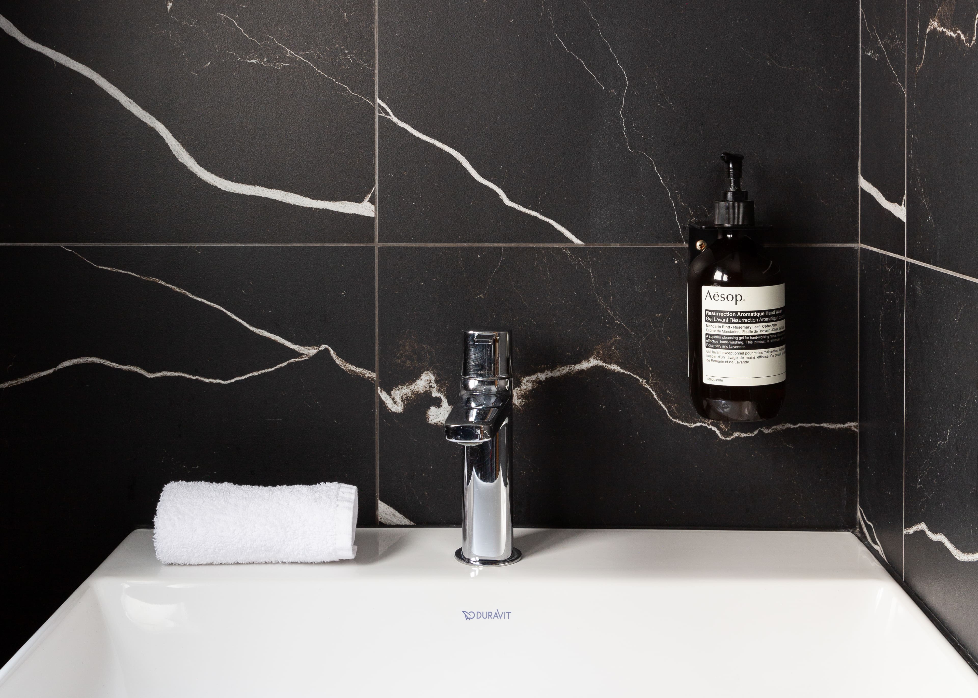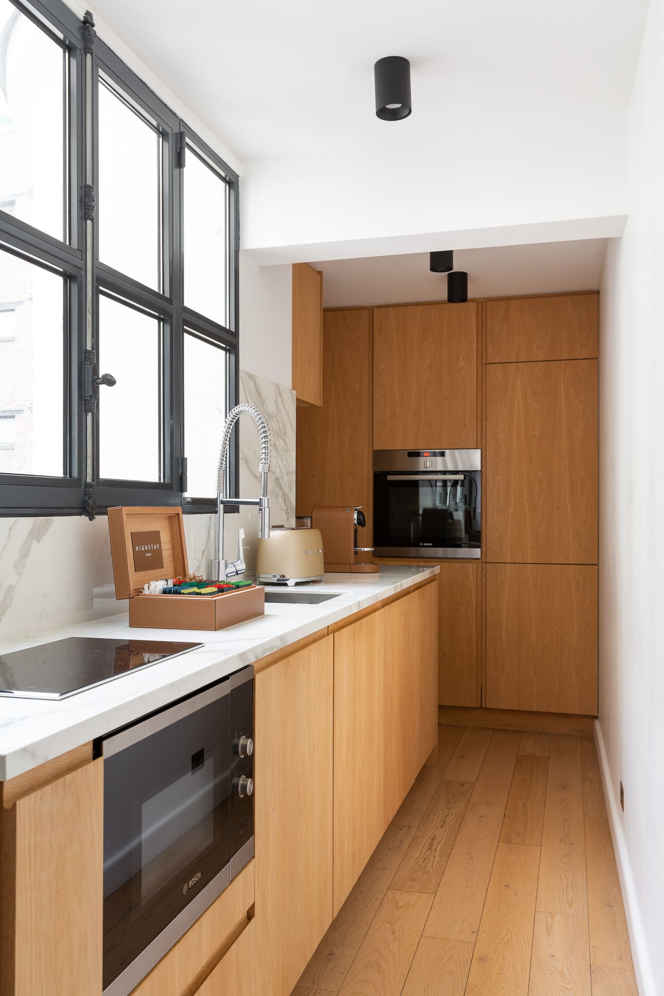 Step inside to find a sophisticated interior that blends contemporary design with timeless Parisian elegance. The living room, with its cozy sofa bed, comfortably accommodates up to four guests and opens onto a wrought-iron Juliet balcony, perfect for enjoying morning coffees or evening wines. The bedroom features French doors that lead to its own balcony, and the en-suite marble bathroom offers a luxurious rainfall shower.