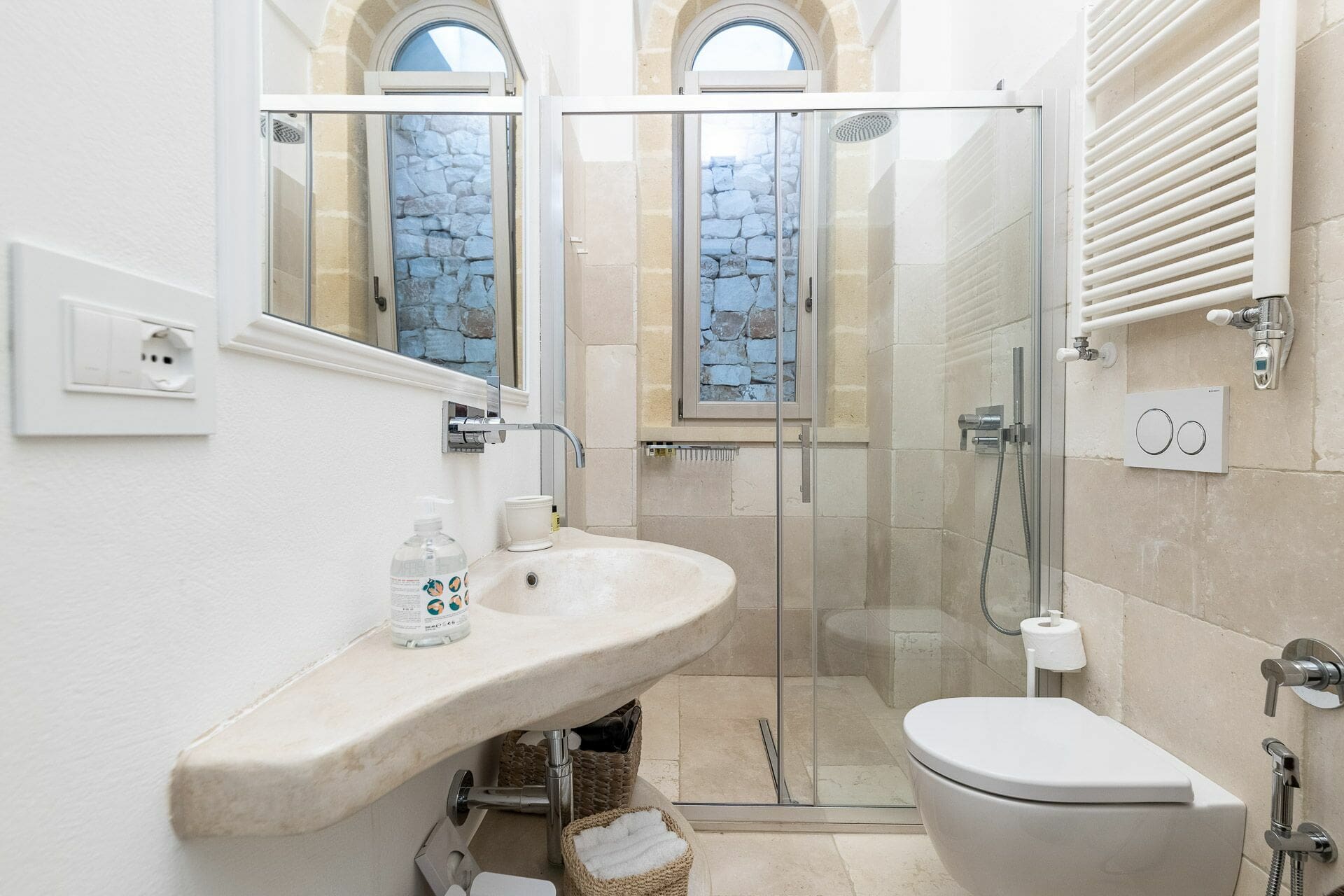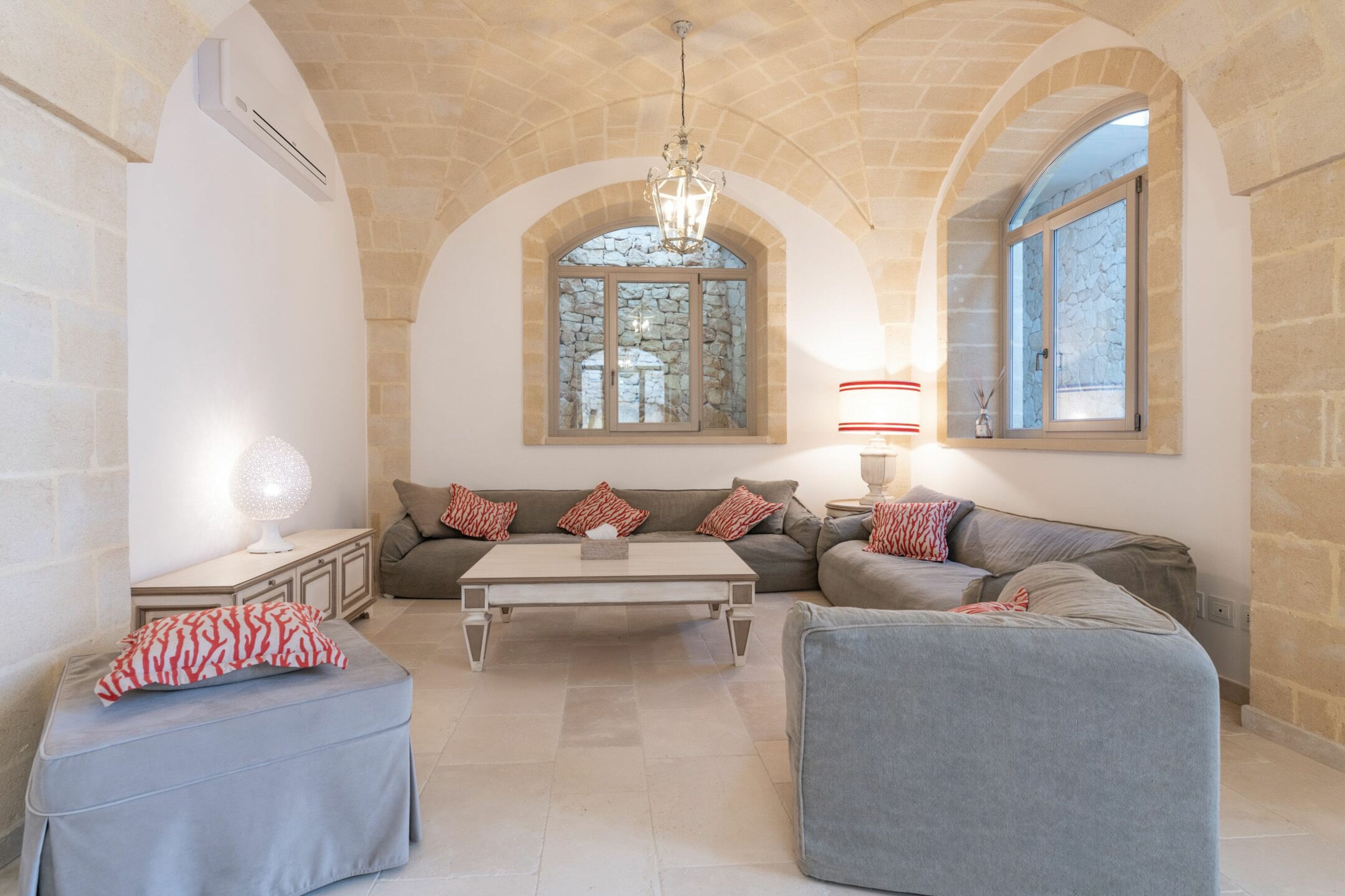 Step inside to discover an interior that seamlessly blends traditional Puglian architecture with contemporary comforts. The apartment features high barrel vault ceilings and sweeping archways that flood the space with natural light. The spacious living area is perfect for relaxation, while the fully equipped kitchen provides everything you need for gourmet dining. Each of the four bedrooms offers plush bedding and unique decor, ensuring a restful night’s sleep. With three elegant bathrooms, including one on the ground floor for ease of access, this property is perfect for guests with reduced mobility.