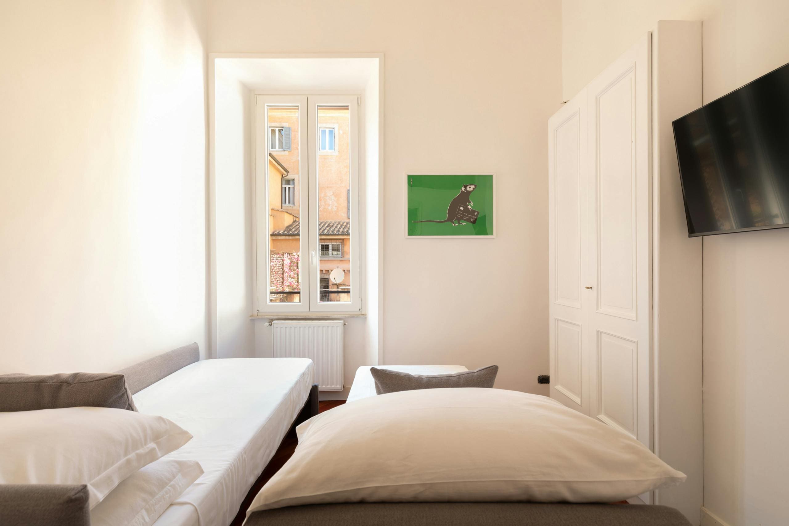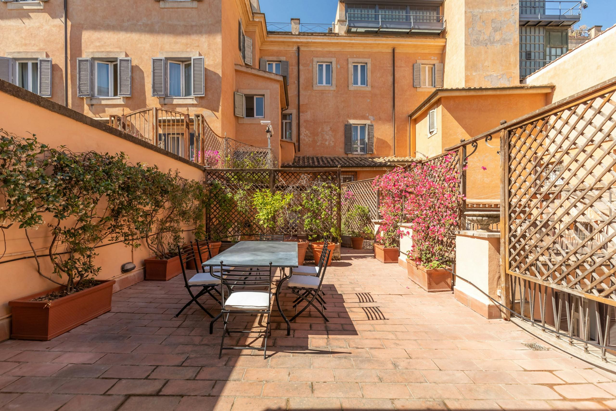 Enjoy the vibrant atmosphere of Rome right from the apartment’s inviting terrace. This outdoor space is ideal for unwinding with an evening aperitif as you take in the bustling city below. While the central location means the sounds of Rome are ever-present, it also ensures that you are a stone’s throw from some of the city’s most renowned sites, including the Pantheon and Piazza Navona.