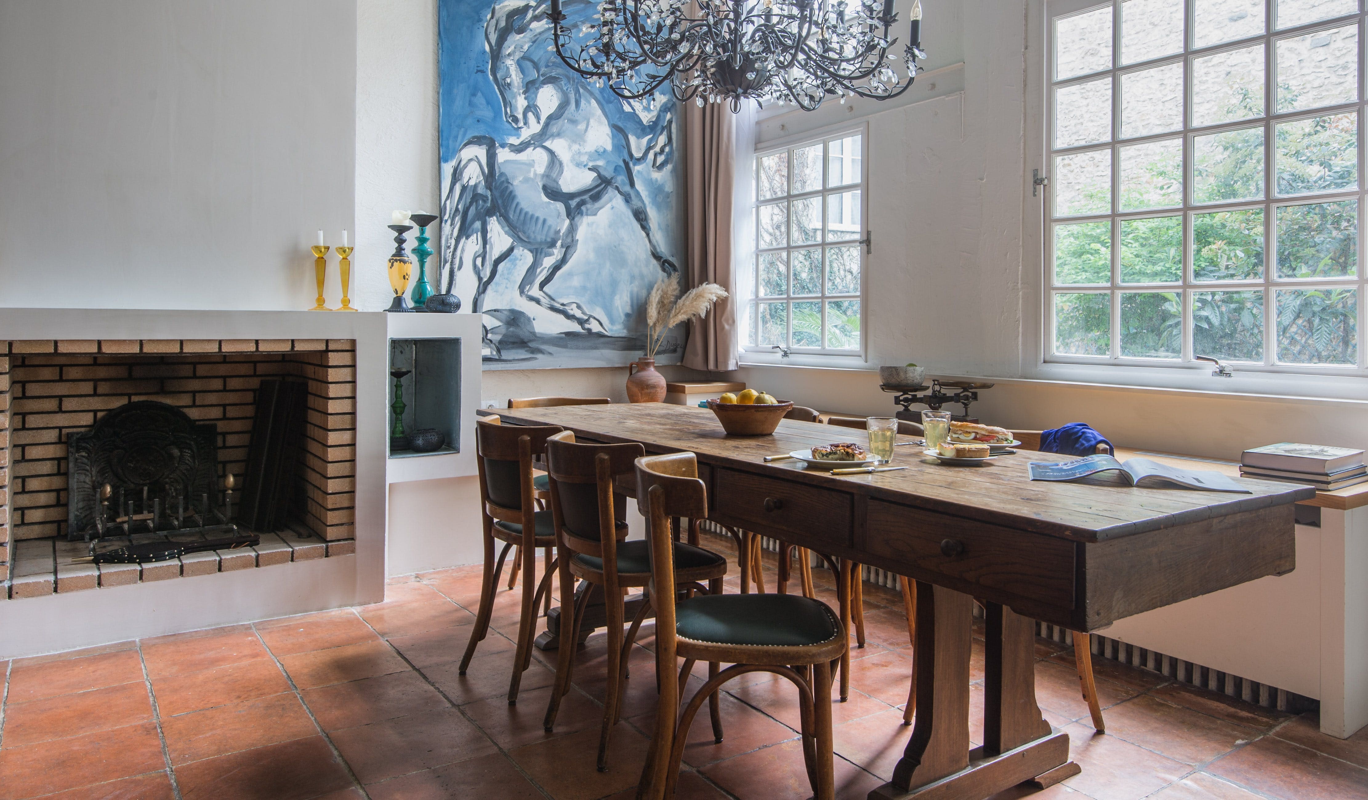 Step into a world of artistic inspiration where tall ceilings and expansive windows create a light-filled ambiance. The living room, adorned with wood paneling, opens onto a charming courtyard, providing a serene escape from the bustling city. The apartment features four bedrooms, each thoughtfully designed to accommodate guests comfortably. A small single bed in the second bedroom and a bunk bed in the third room make them perfect for children, while the fourth bedroom offers a single bed that can extend into a double for added flexibility. The elegant mezzanine levels add a unique architectural flair, enhancing the apartment’s open, loft-like feel.