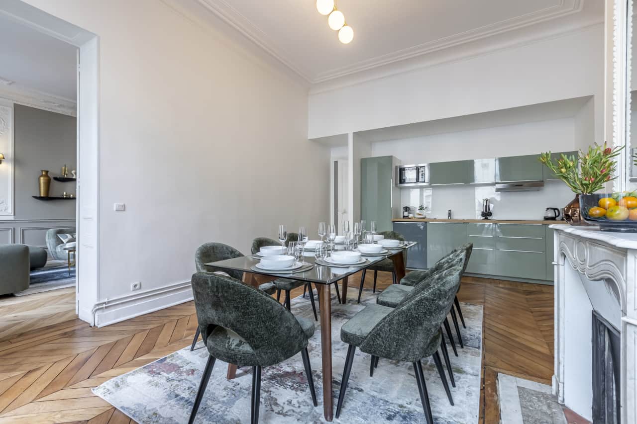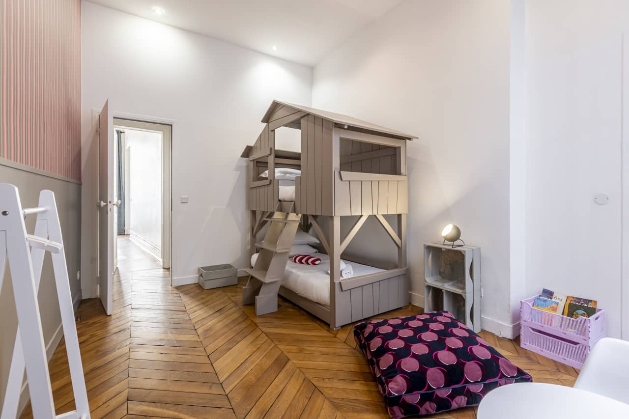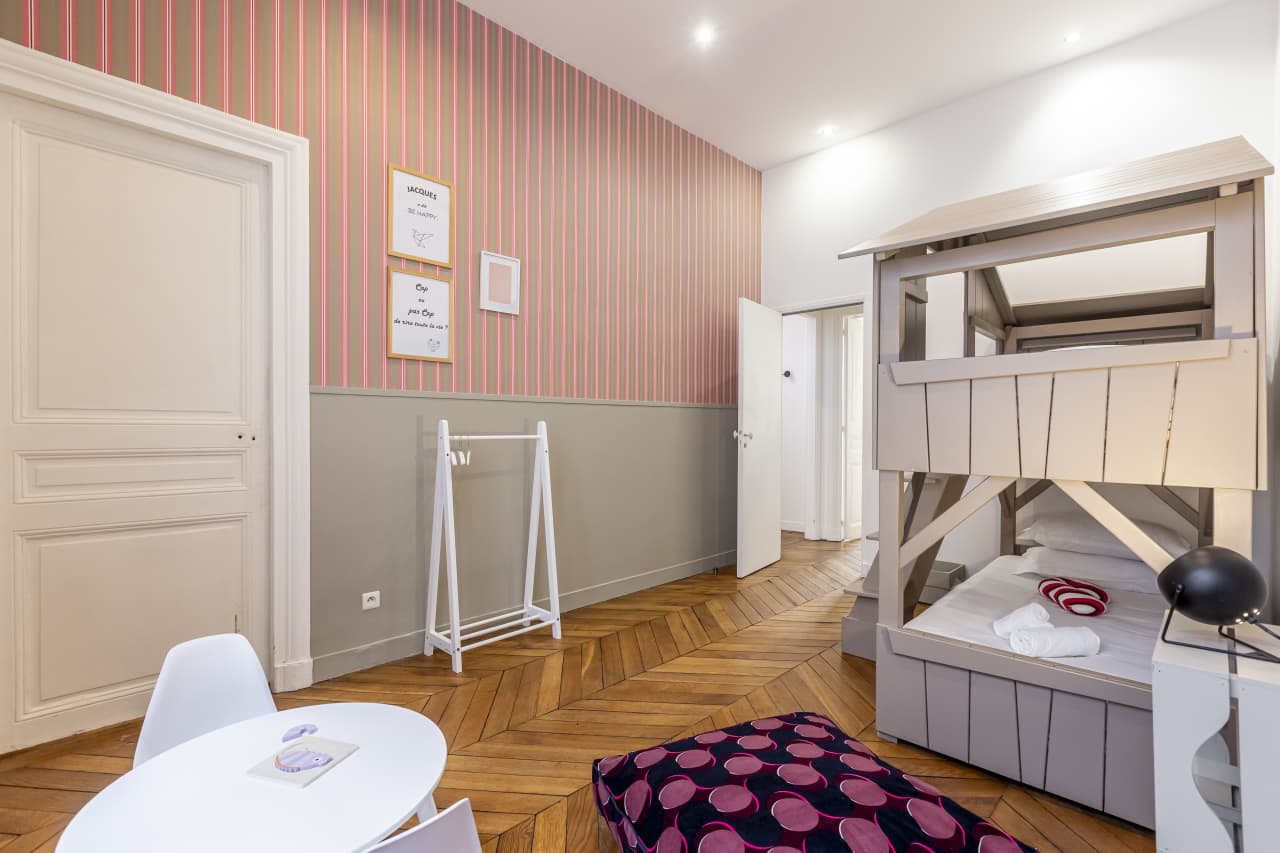 Discover this exquisite luxury villa nestled in Paris’s prestigious Saint Lazare district, where contemporary elegance meets classic French sophistication. This stunning 4-bedroom vacation rental spans 180 square meters, perfectly accommodating up to 8 guests in absolute comfort. Each beautifully appointed bedroom features carefully curated furnishings, while the dedicated children’s room with enchanting treehouse bunk bed creates magical memories for young travelers. Soaring floor-to-ceiling windows flood the space with natural light, highlighting artistic touches and designer details throughout. The gourmet kitchen comes fully equipped for culinary adventures, making this Paris accommodation ideal for intimate family gatherings. Located steps from Galeries Lafayette Saint Lazare in the coveted 8th arrondissement, guests enjoy unparalleled access to world-class shopping, dining, and cultural attractions. This luxury villa rental combines the privacy and space of a private residence with the convenience of central Paris location, offering discerning travelers an authentic Parisian experience. Three spacious bathrooms ensure comfort and convenience for all guests in this exceptional vacation rental.