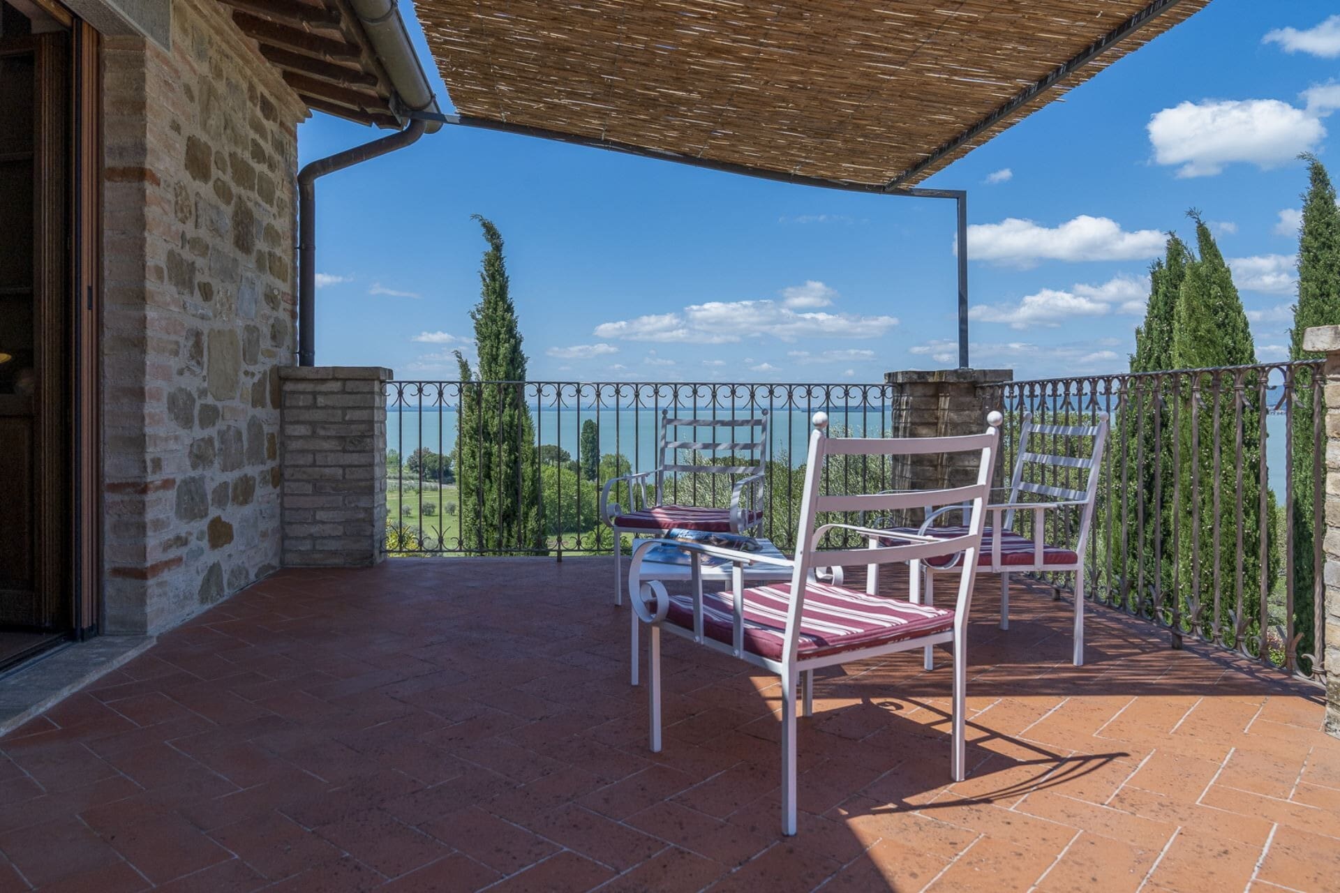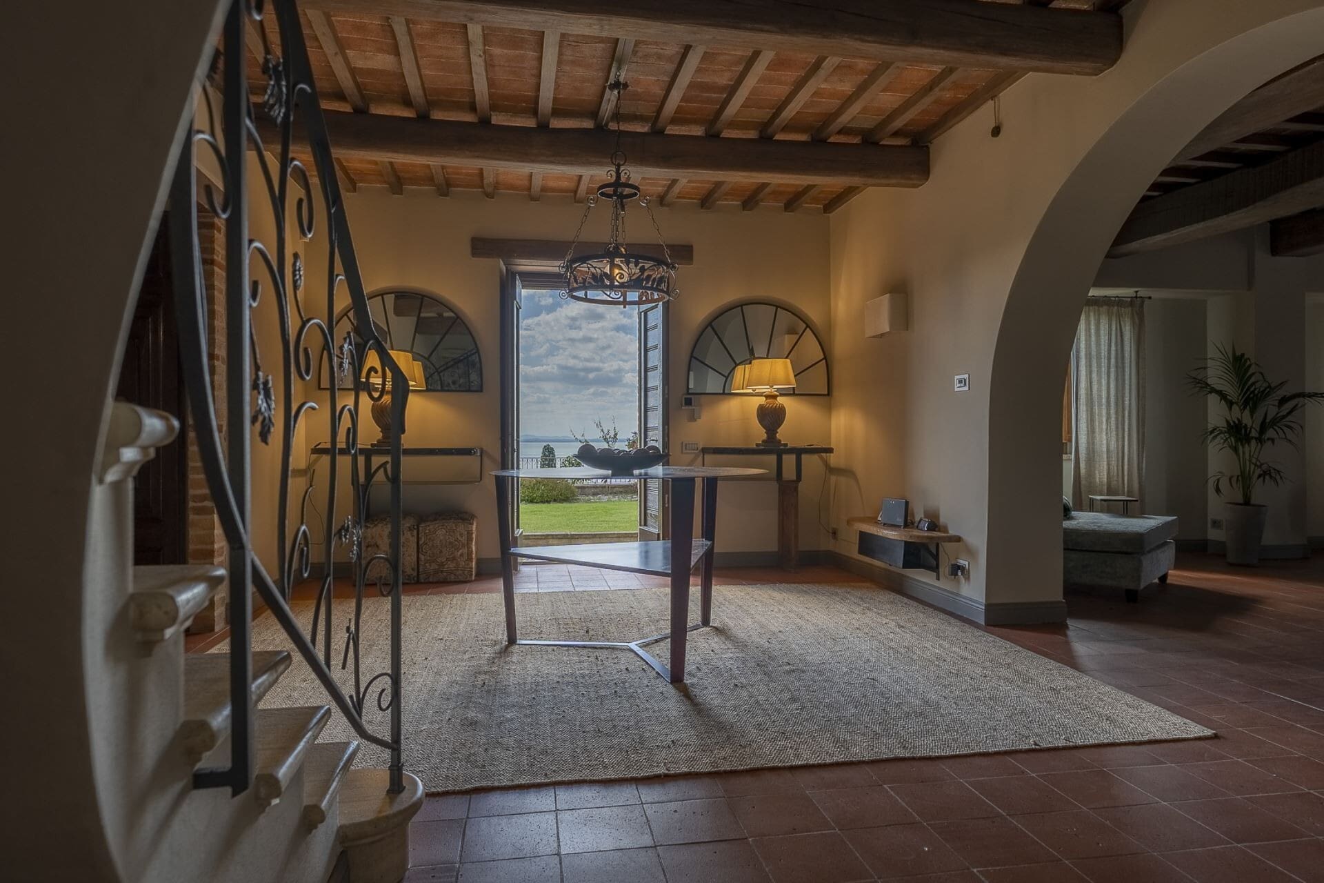 The property’s outdoor areas are as inviting as its interiors. A sun-drenched terrace, complete with loungers, overlooks the sparkling waters of Lake Trasimeno. The private swimming pool, though unfenced, is a refreshing oasis, while the sauna provides a tranquil space for unwinding. The lush gardens and outdoor dining spaces are perfect for enjoying leisurely meals with family and friends.