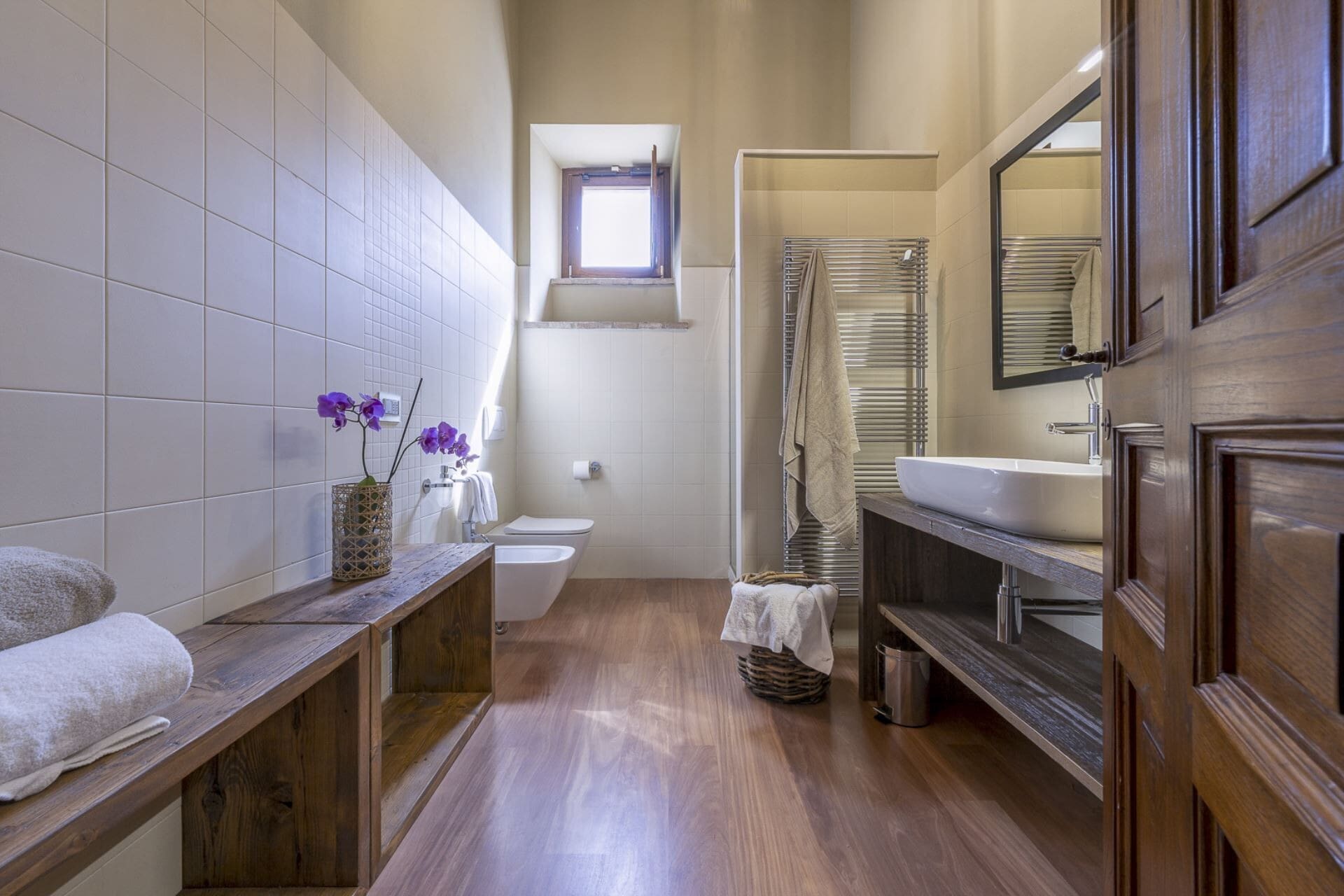 The apartment accommodates ten guests in five bedrooms and six bathrooms. While not all bathrooms are photographed, their style and quality are consistent throughout. Guests are advised to hire a car for exploring the surrounding areas. Browse our luxury villa rentals in Italy for more properties.