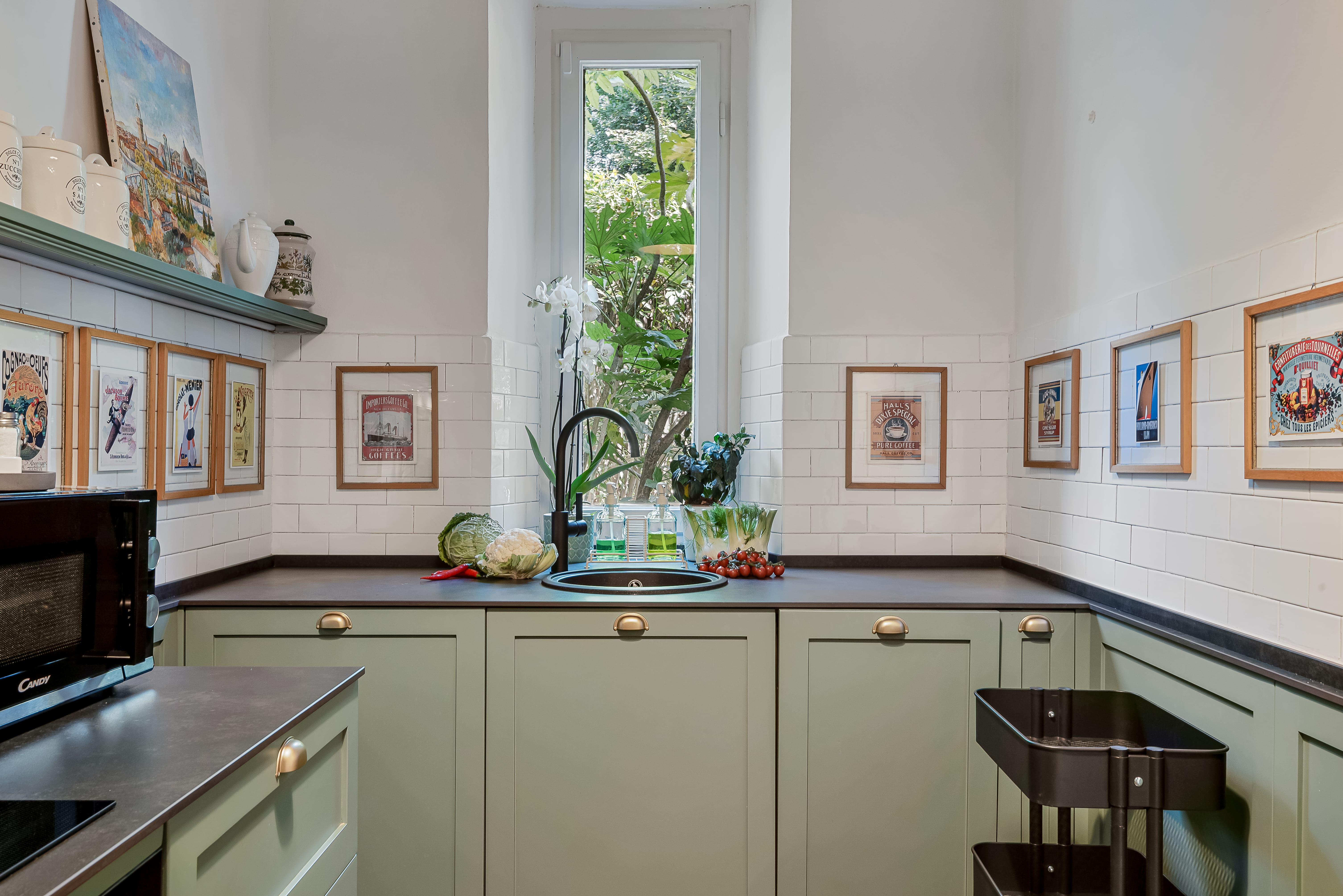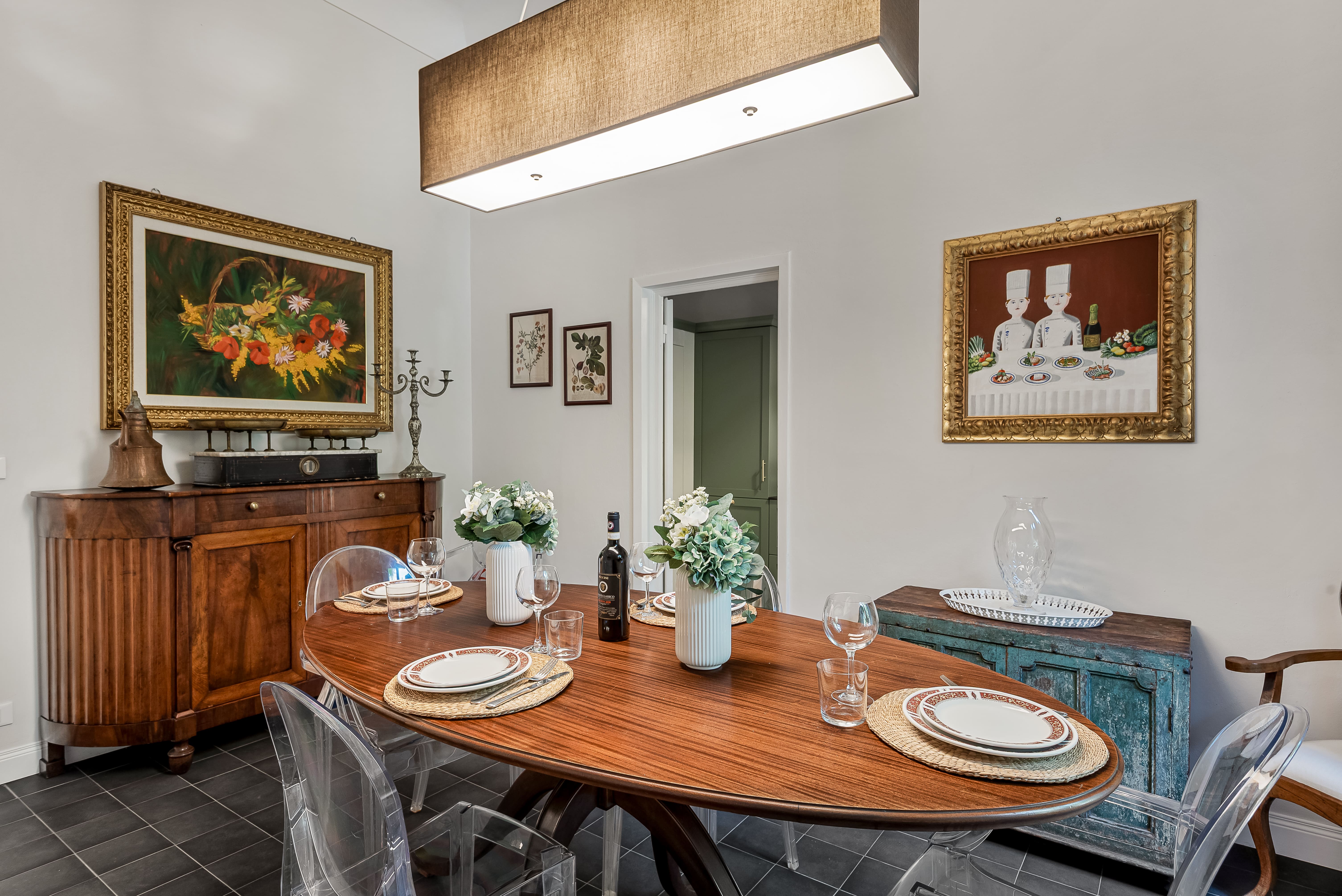 Step inside and discover a world of elegance and comfort. This spacious apartment features four beautifully decorated bedrooms, accommodating up to nine guests, with two well-appointed bathrooms ensuring ample space for everyone. The interior design pays homage to traditional Florentine style, with colorful tiles and frescoed ceilings that add a touch of historic charm. The living areas are perfect for unwinding after a day of sightseeing, and the kitchen is fully equipped to cater to your culinary adventures.
