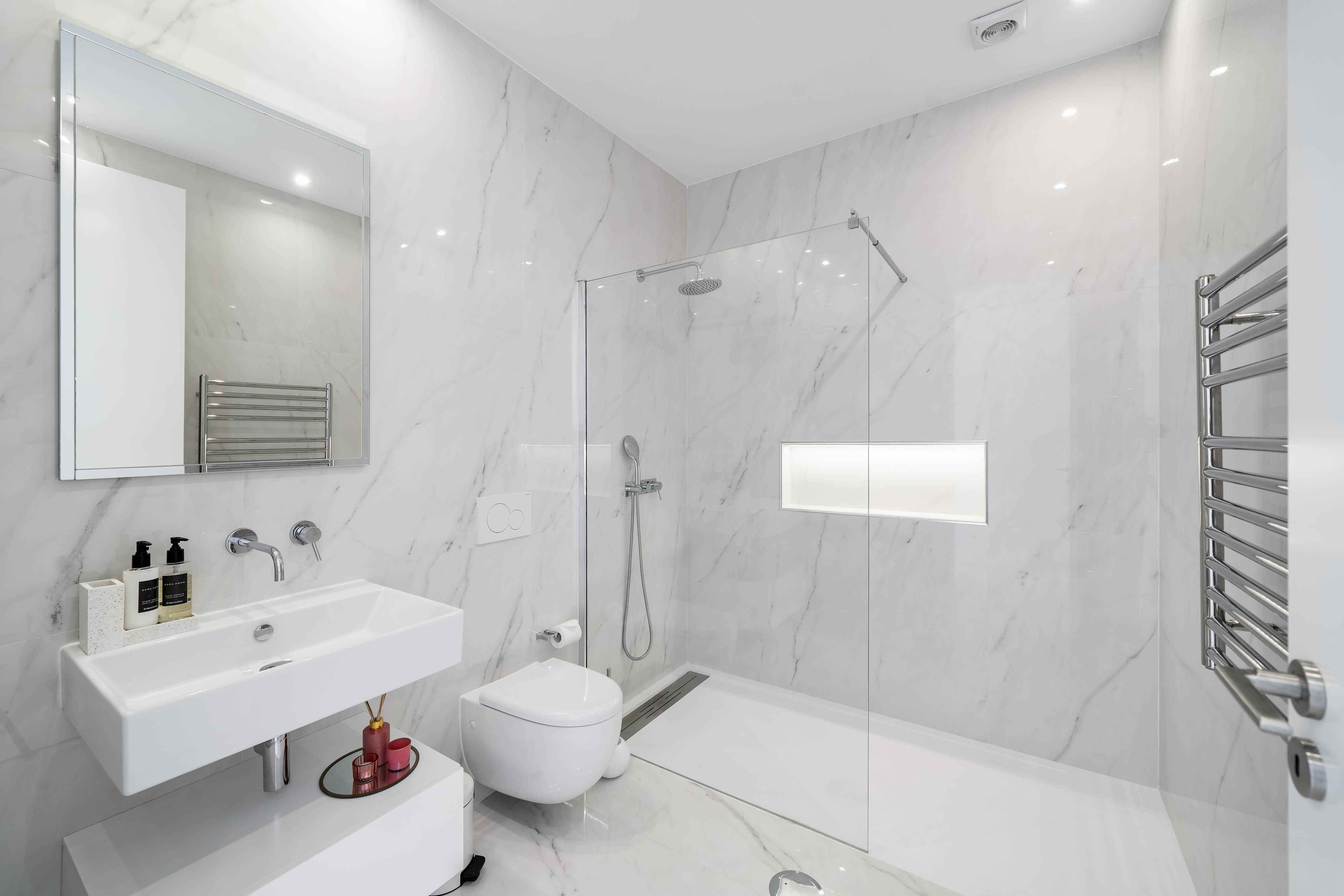 Step into a world of elegance with this modern apartment boasting floor-to-ceiling glass windows that invite natural light and breathtaking ocean vistas. The interiors feature a sophisticated blend of white-washed walls and cream hues, accented by vibrant pops of teal. The spacious living area offers ample room for dining at the chic glass table or unwinding on plush seating. Each of the three bedrooms is a sanctuary of comfort, complete with en-suite bathrooms and stylish decor.
