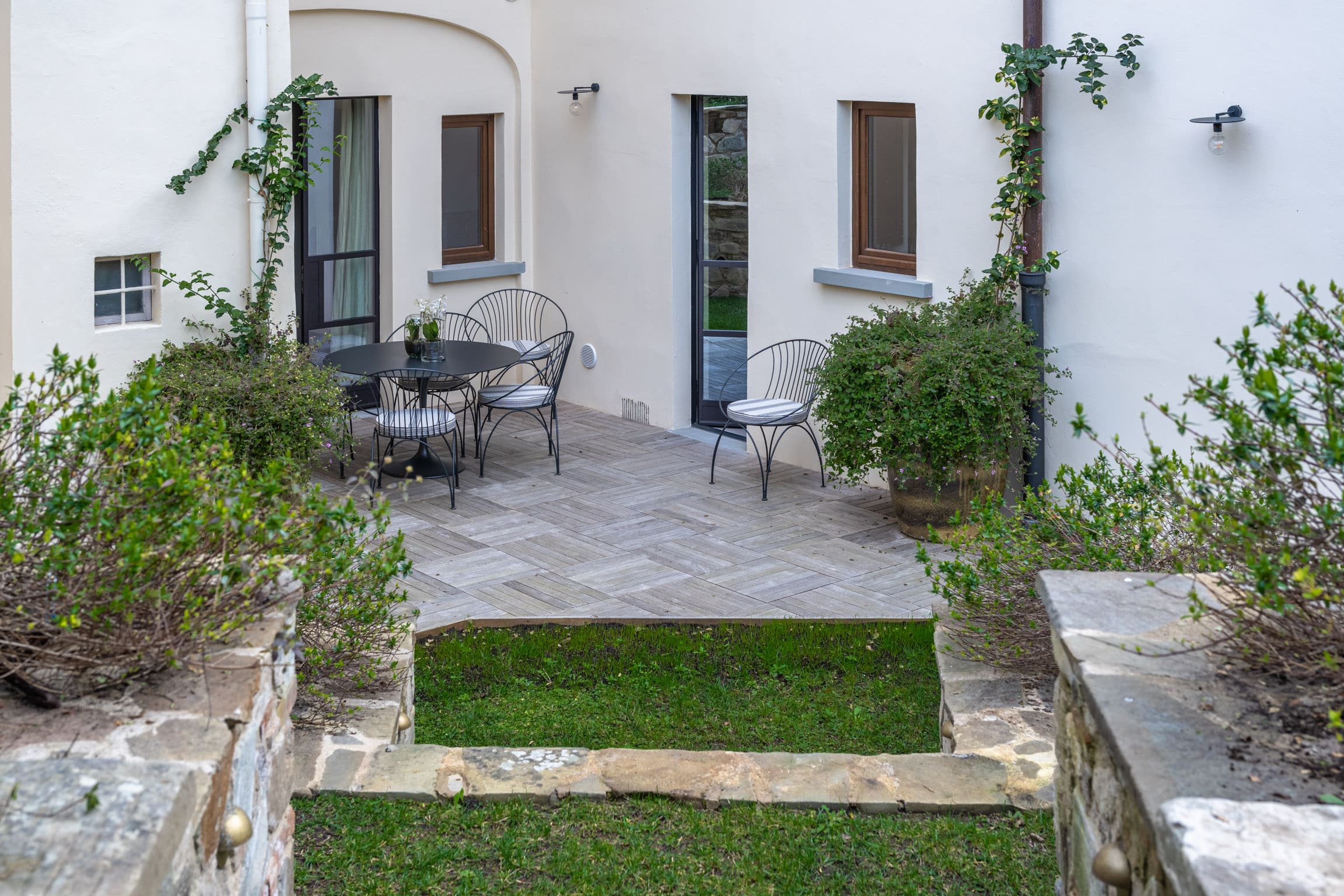 A: The garden is maintained once a week by a gardener who accesses it from the neighbor’s property.