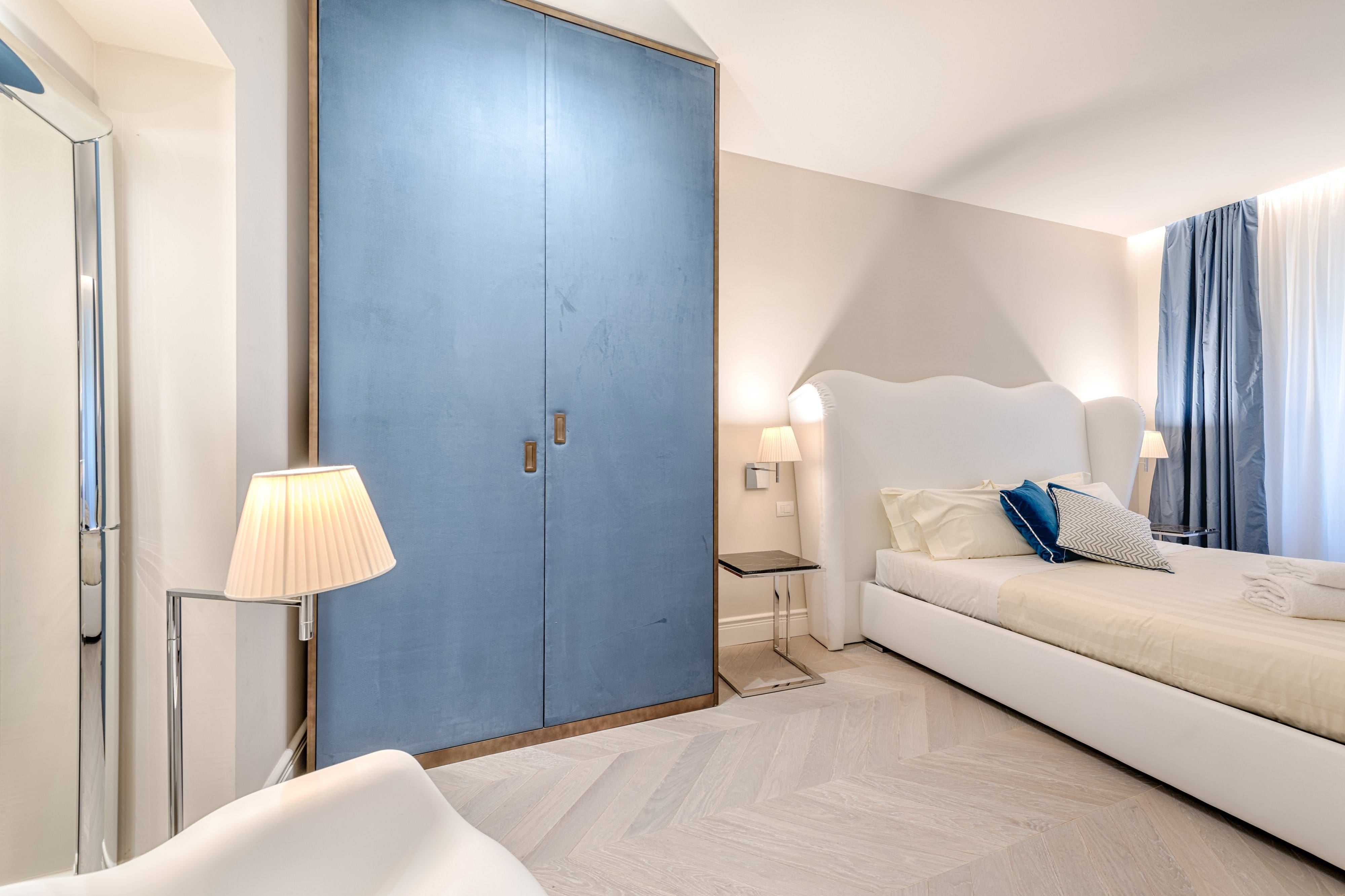 The interiors of this luxury apartment rental Florence are a testament to timeless elegance. The living spaces boast intricately panelled walls and shimmering chandeliers, setting a tone of sophistication. Each bedroom is a sanctuary of peace, with plush furnishings and serene blue and white decor. The marble bathrooms offer a spa-like experience, ensuring a relaxing stay. While the kitchen is equipped for culinary adventures, it does lack some glassware for larger gatherings.