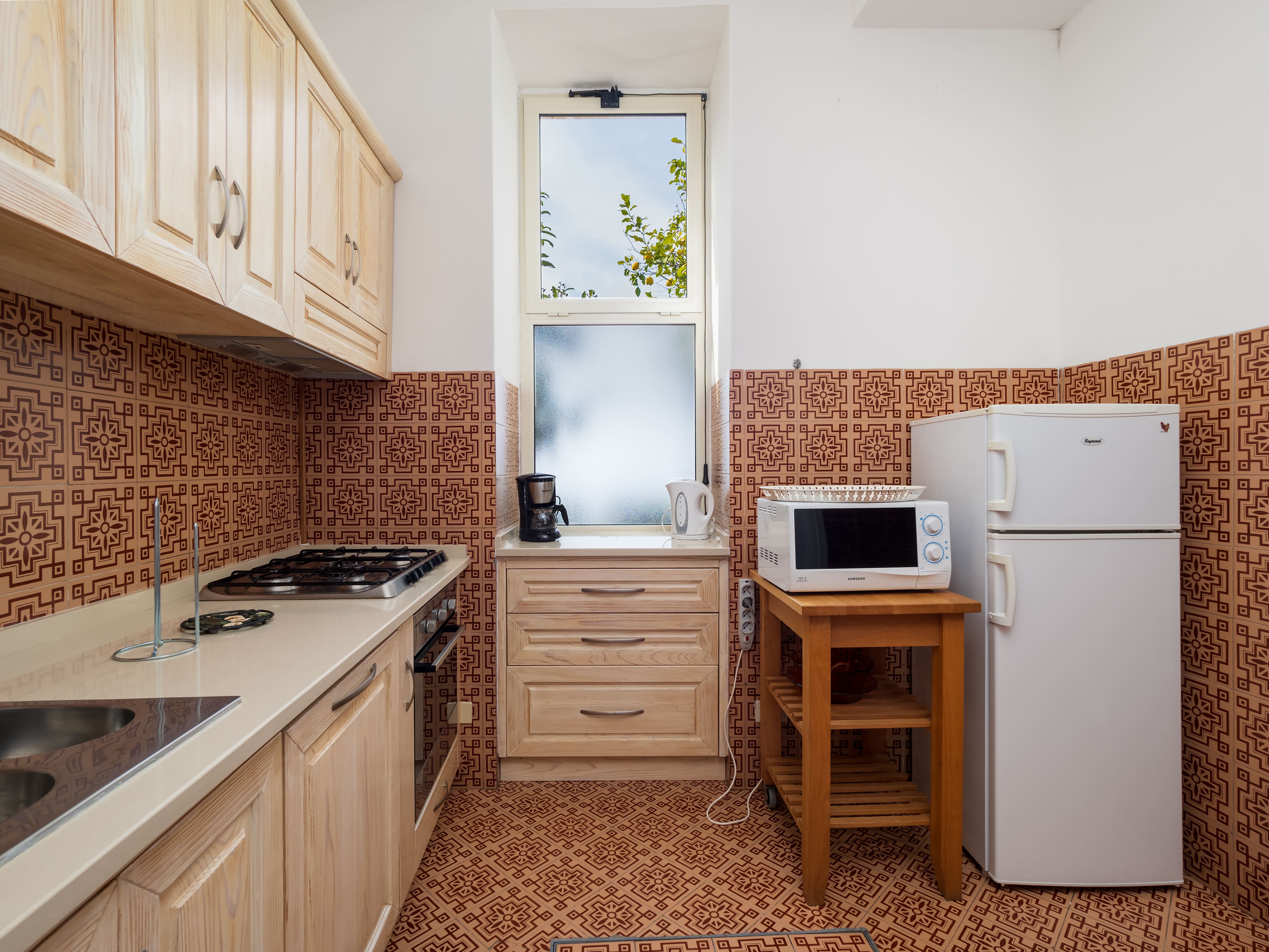 Step inside to find a traditionally styled interior that comfortably accommodates up to four guests. The bedroom offers a serene retreat, while the living area features a sofa bed for additional guests. The kitchen is equipped with all essentials, allowing for easy meal preparations. Classic decor and local touches create a warm, inviting atmosphere.