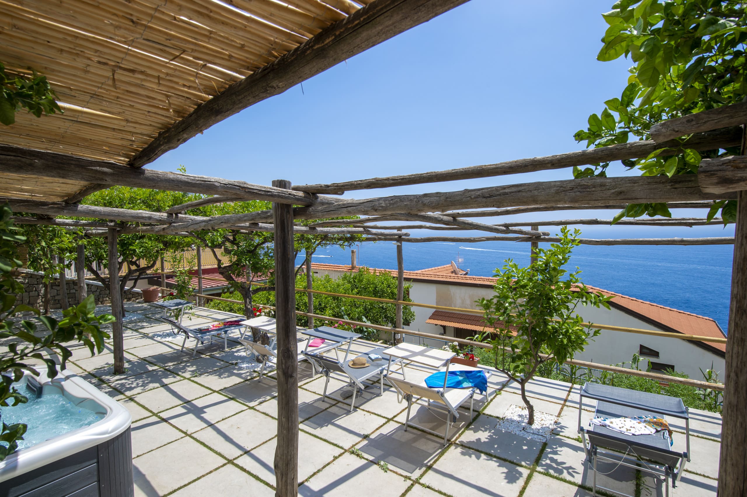 Outside, the apartment boasts a stunning terrace with sweeping views of the Amalfi Coast. Enjoy leisurely afternoons by the swimming pool or unwind in the hot tub, available from April to October. The terrace is perfect for al fresco dining, surrounded by the fragrant scent of local lemon trees.