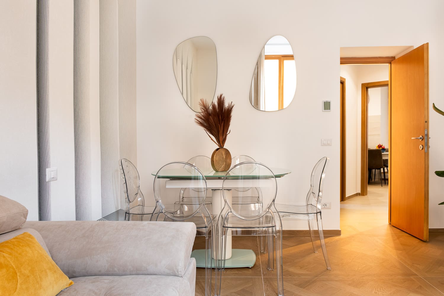 Step inside this beautifully appointed apartment to discover a harmonious mix of contemporary design and classic elegance. The living area, while intimate, provides a cozy setting for unwinding after a day of exploration. With four comfortable bedrooms, the apartment can accommodate up to ten guests, making it perfect for larger families or groups. The eat-in kitchen is well-equipped, inviting culinary creativity with local ingredients from nearby markets. Each of the three bathrooms is tastefully designed, offering a touch of luxury with modern amenities.