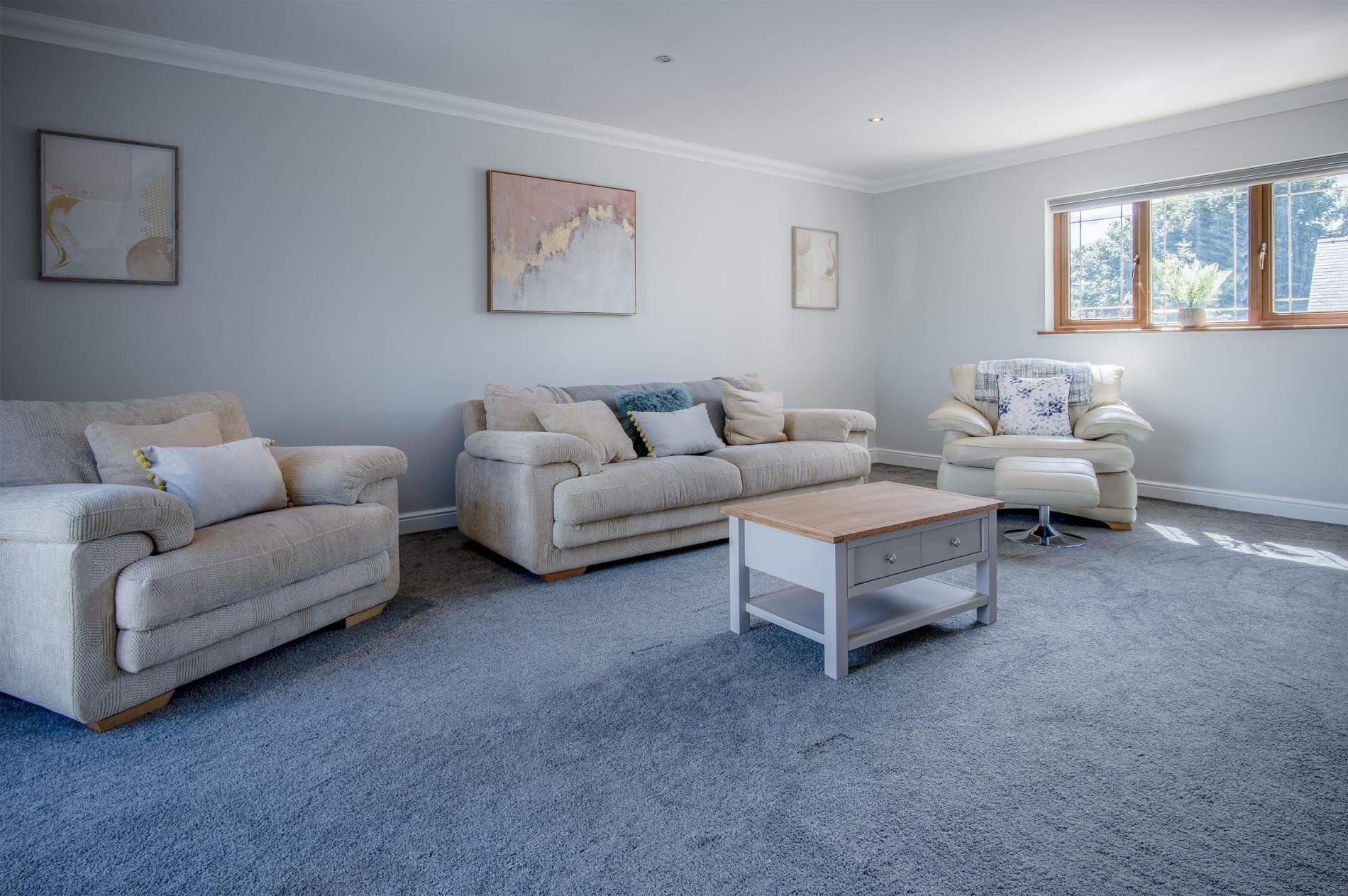 There’s plenty to like inside as well. As well as three separate living areas — including one on the first floor with pretty views of rolling countryside — we’re also particularly fond of the huge kitchen fitted with sleek surfaces and smart wooden finishes.