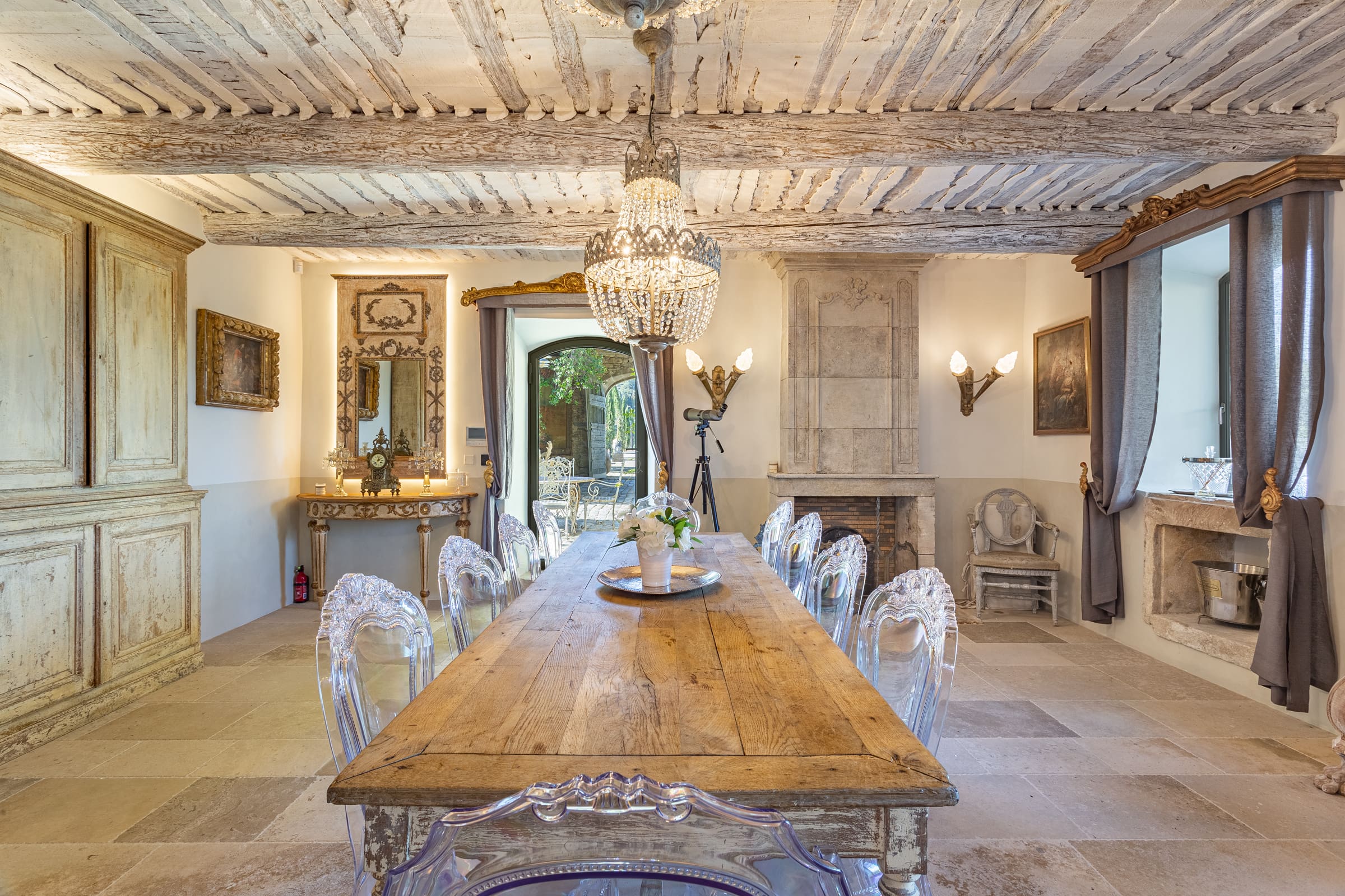 Step into a world of refined aesthetics as you enter the apartment. The interiors boast original features like exquisite wood beams and rustic stone walls that echo its storied past as a farmhouse and stables for the village chateau. The spacious living room invites relaxation with plush sofas, while the grand dining area sets the scene for memorable meals. Each of the seven bedrooms offers an intimate retreat with ensuite bathrooms and air conditioning, ensuring ultimate comfort for all guests.
