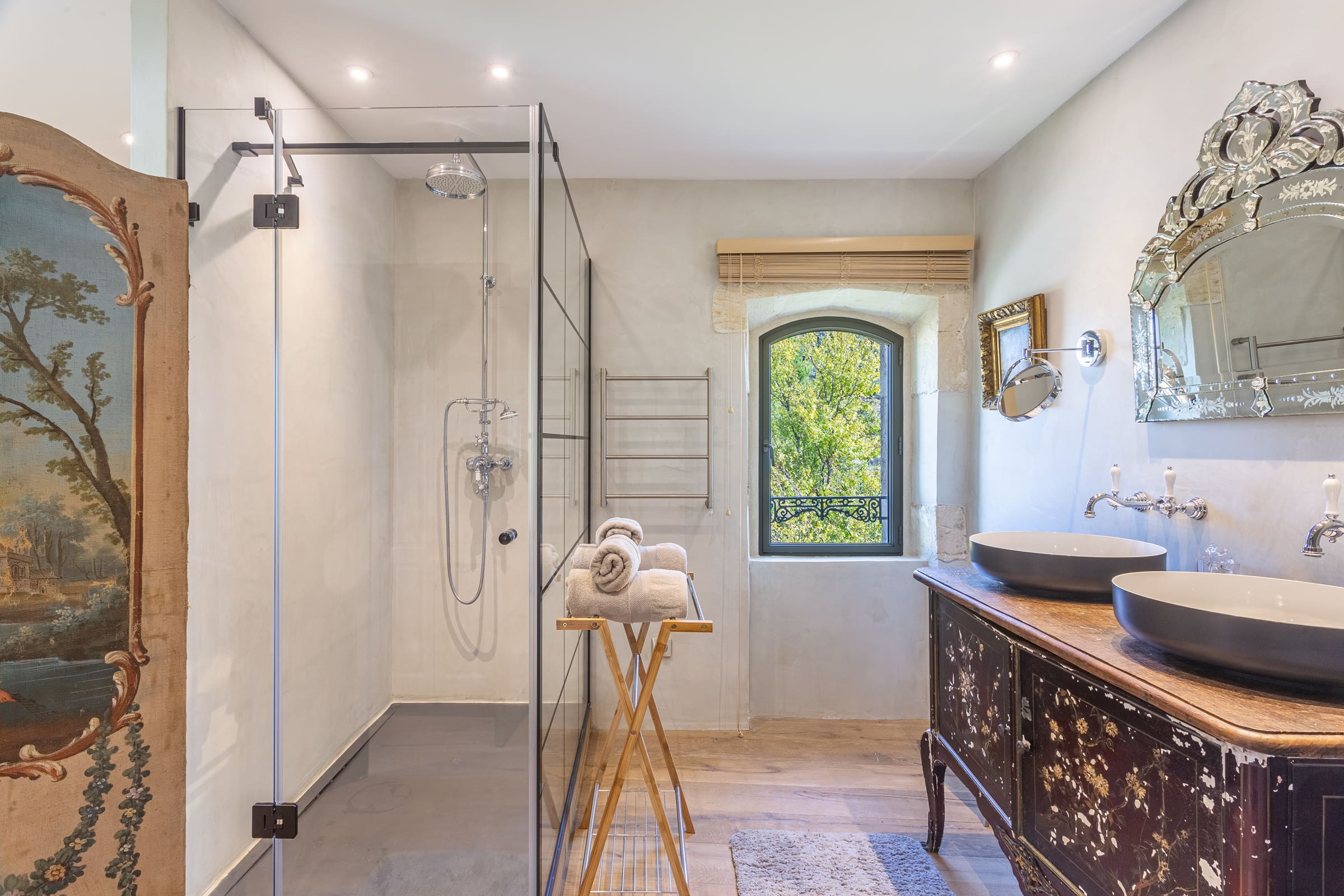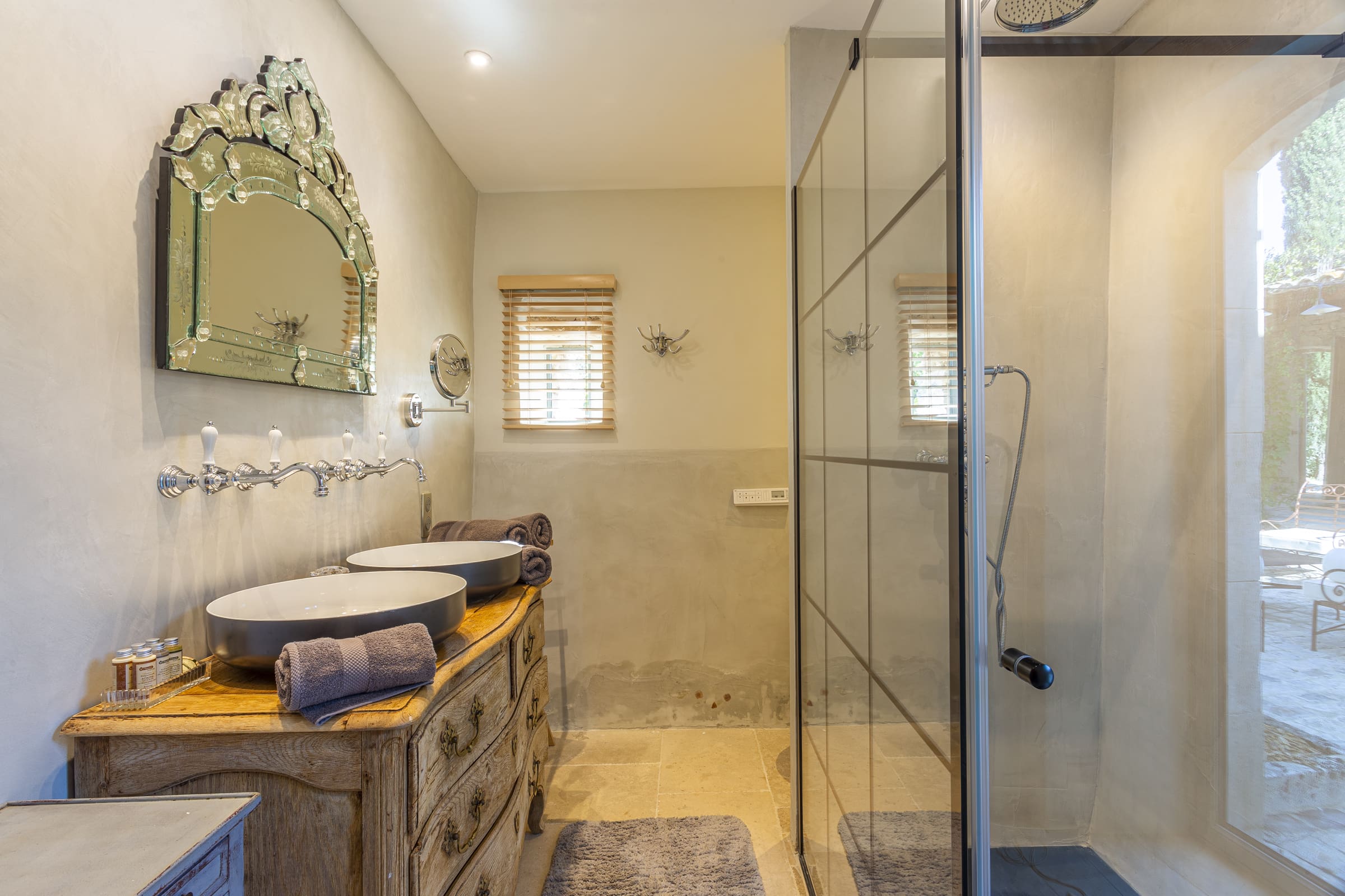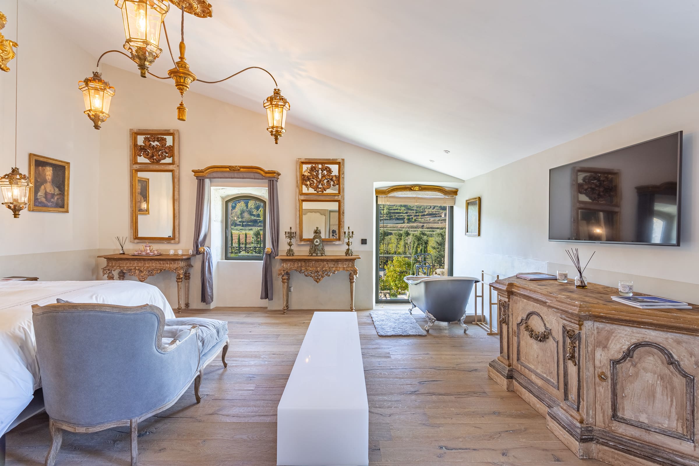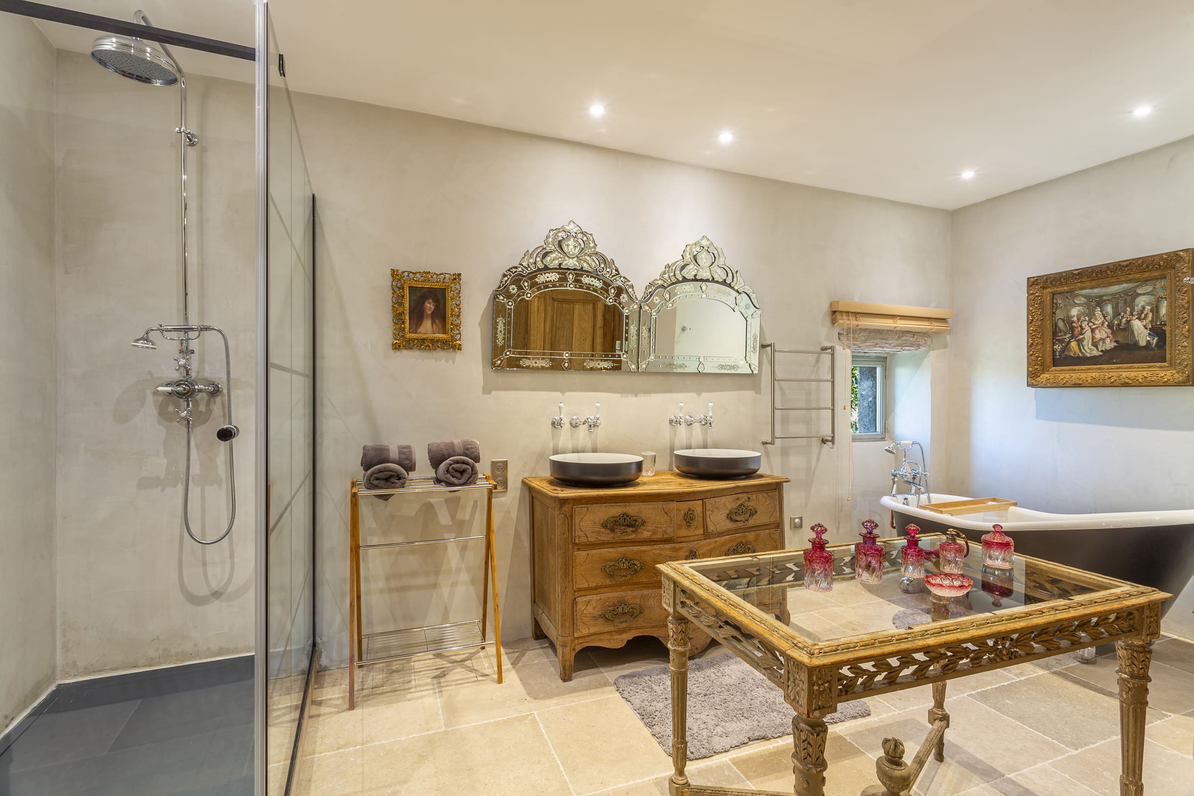The interior of Château Mistral Vaucluse is an embodiment of elegance and sophistication. With eight beautifully appointed bedrooms and eight bathrooms, this villa accommodates up to 22 guests comfortably. The expansive living areas are complemented by a fully equipped kitchen, perfect for preparing gourmet meals. Unique features include a semi-open mezzanine with two single beds and a super-king bed below, offering versatility for family groups. Three bedrooms offer private entrances, ensuring privacy for all guests.